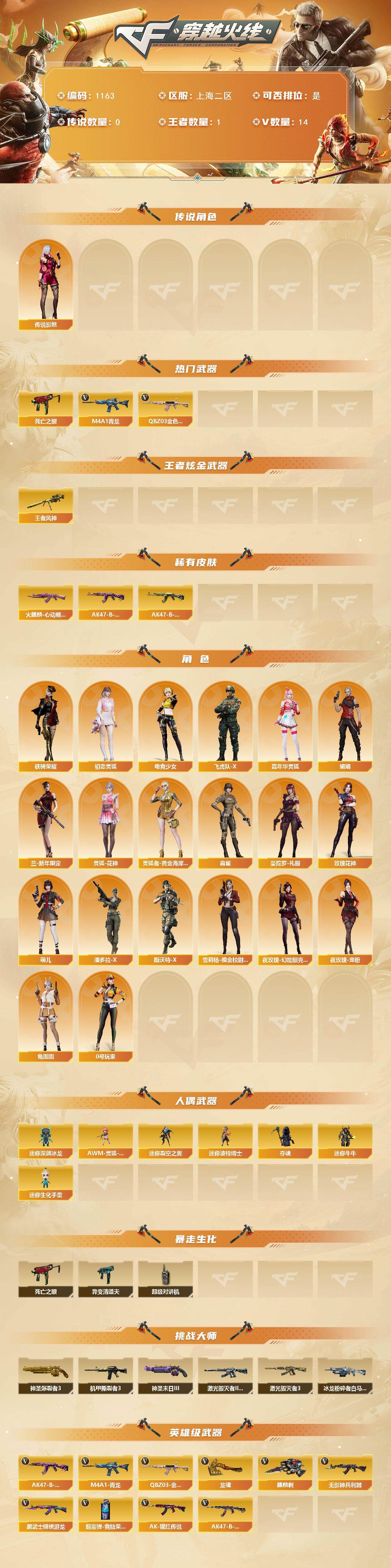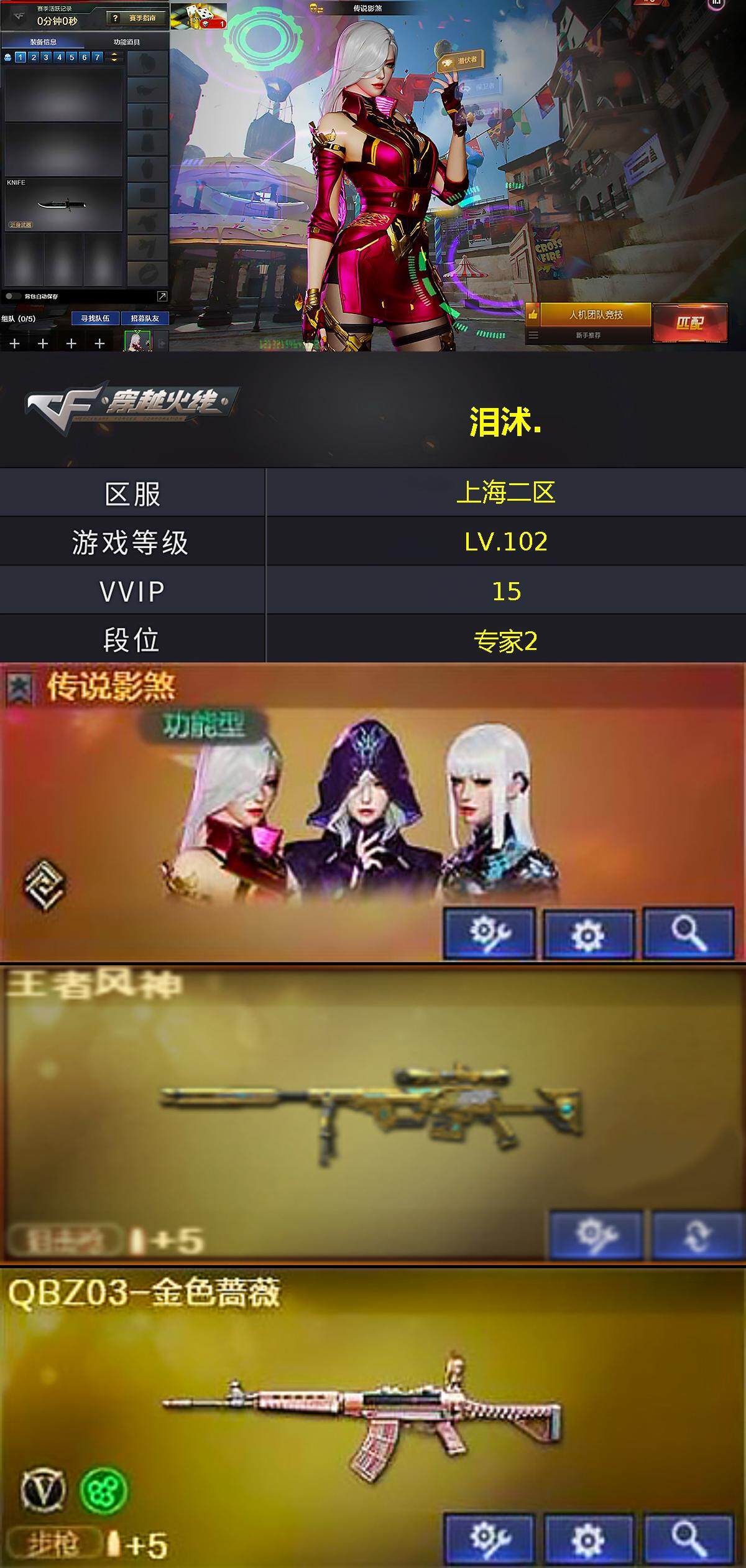 上海二区-14v-1王者-0炫金 【传说角色】:传说影煞 【热门武器】:q03-金色蔷薇,m4a1-青龙,死亡之眼 【王者炫金武器】:王者风神 【皮肤】:火麒麟-心动糖果,ak47-b-常胜将军-曹操,ak47-b-常胜将军-孙权2 【角色】:初恋灵狐,电竞少女,飞虎队-x,嘉年华灵狐,娟娟,兰-新年限定,0号玩家,灵狐-花神,灵狐者-黄金海岸,麻雀,曼陀罗-礼服,玫瑰花神,萌儿,潘多拉