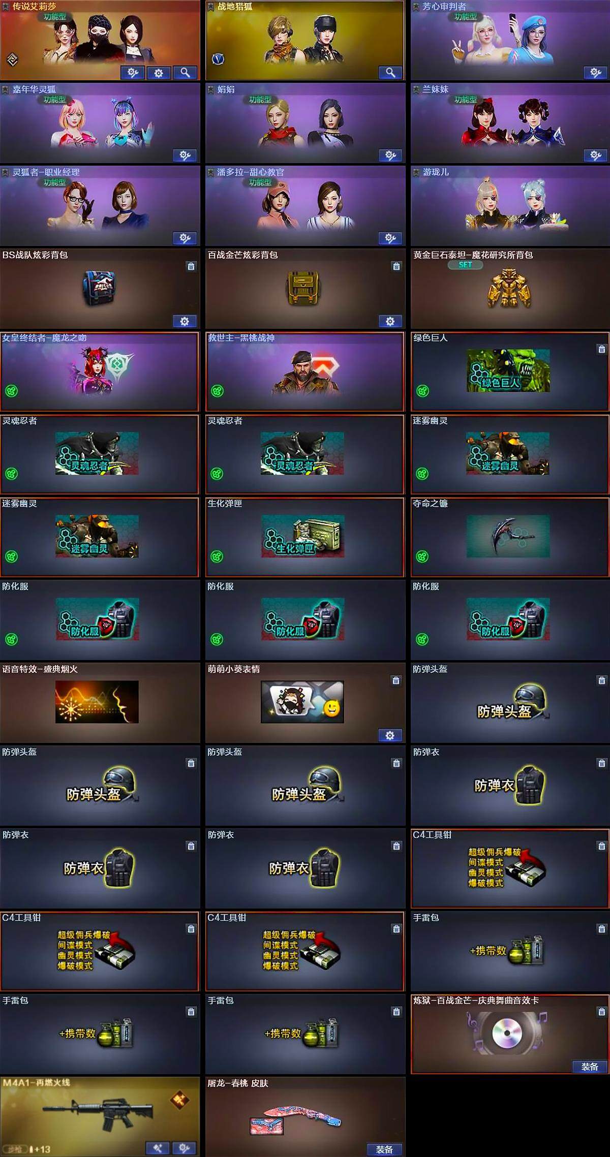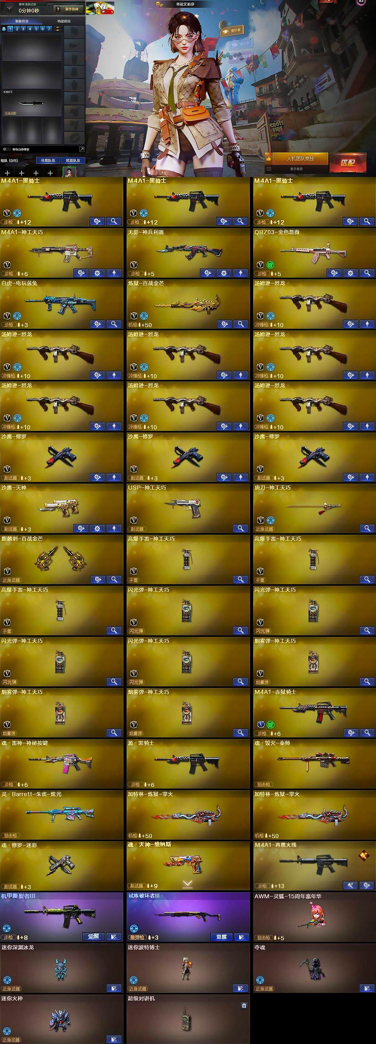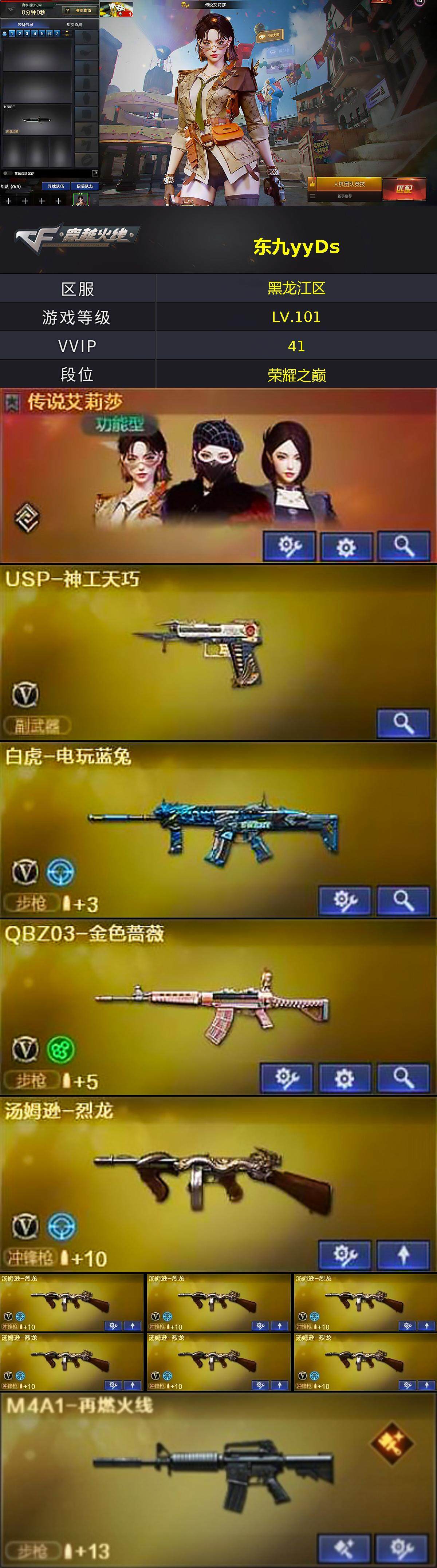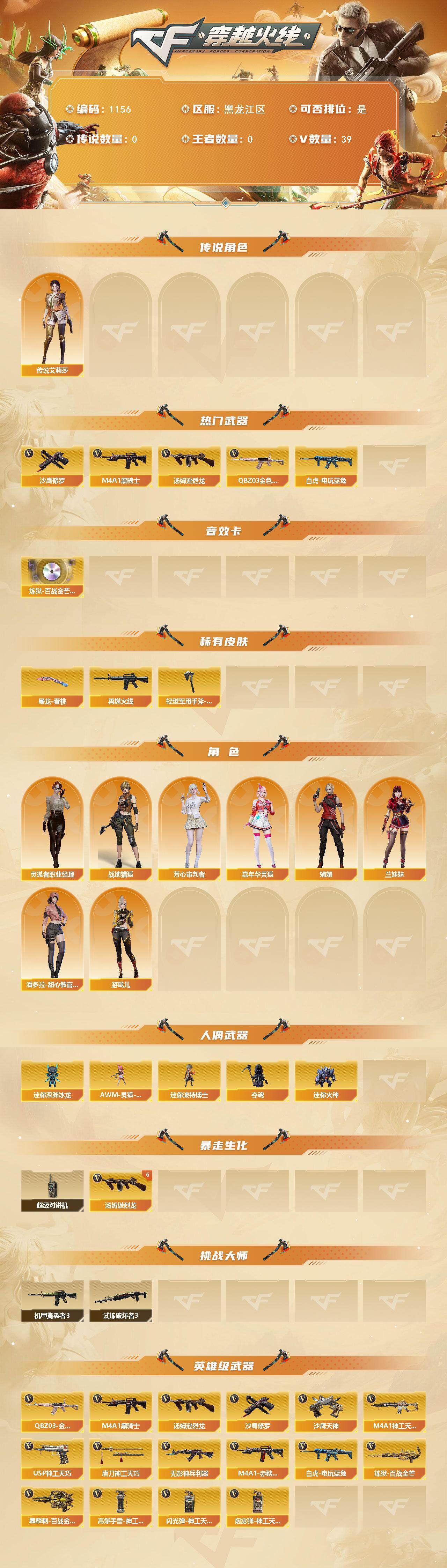 黑龙江区-39v-0王者-0炫金 【传说角色】:传说艾莉莎 【热门武器】:q03-金色蔷薇,白虎-电玩蓝兔,m4a1-黑骑士3,汤姆逊-烈龙7,沙鹰-修罗3 【音效卡】:炼狱-百战金芒-庆典舞曲音效卡 【皮肤】:m4a1-再燃火线,屠龙-春桃 皮肤,轻型军用手斧-再燃火线 【角色】:战地猎
