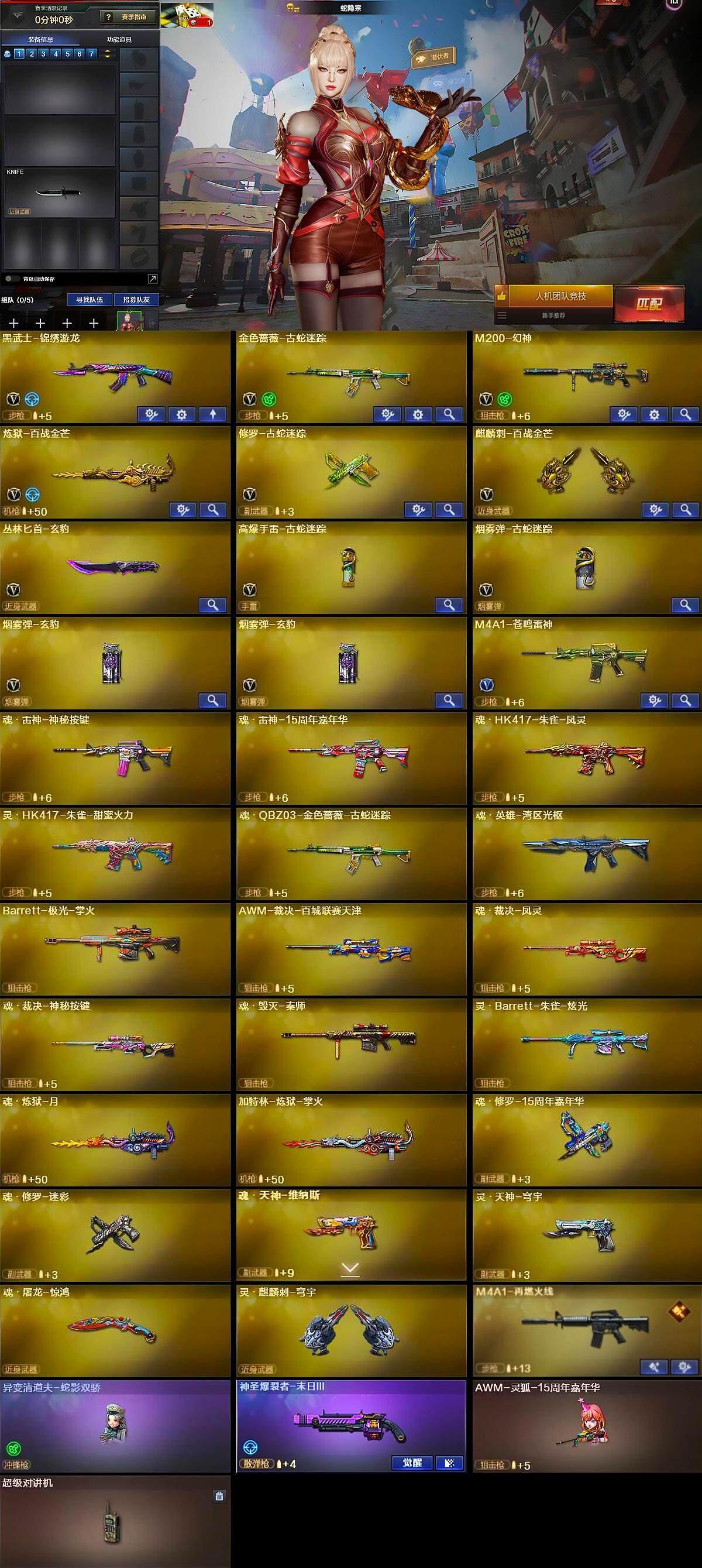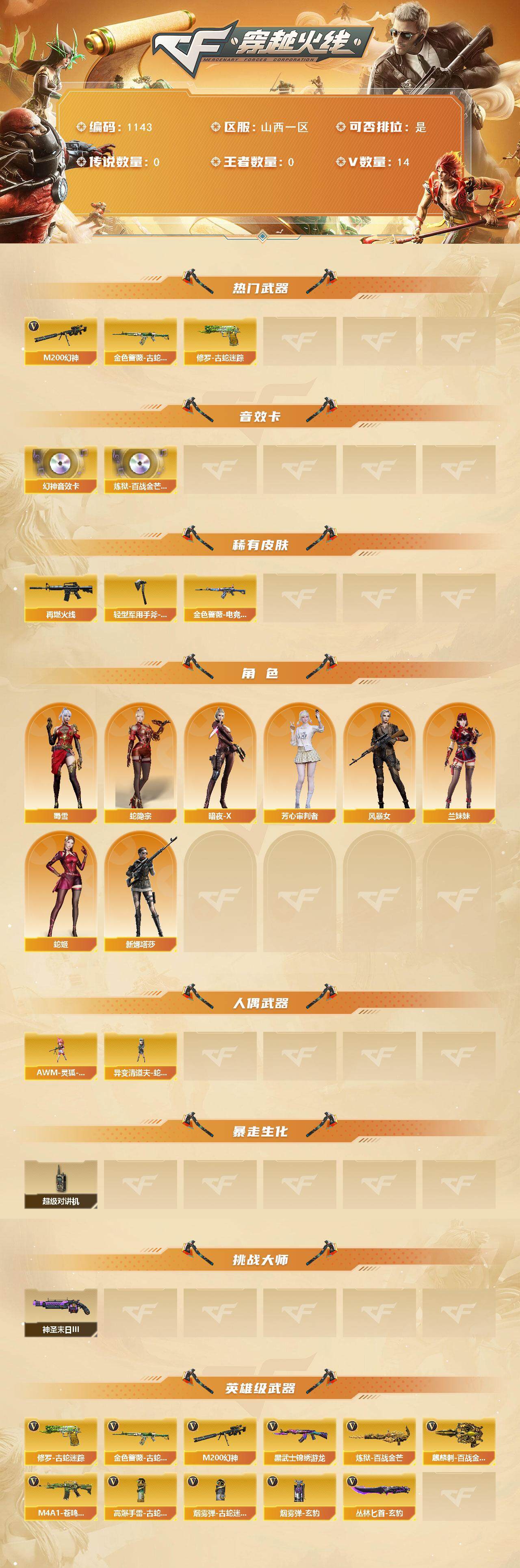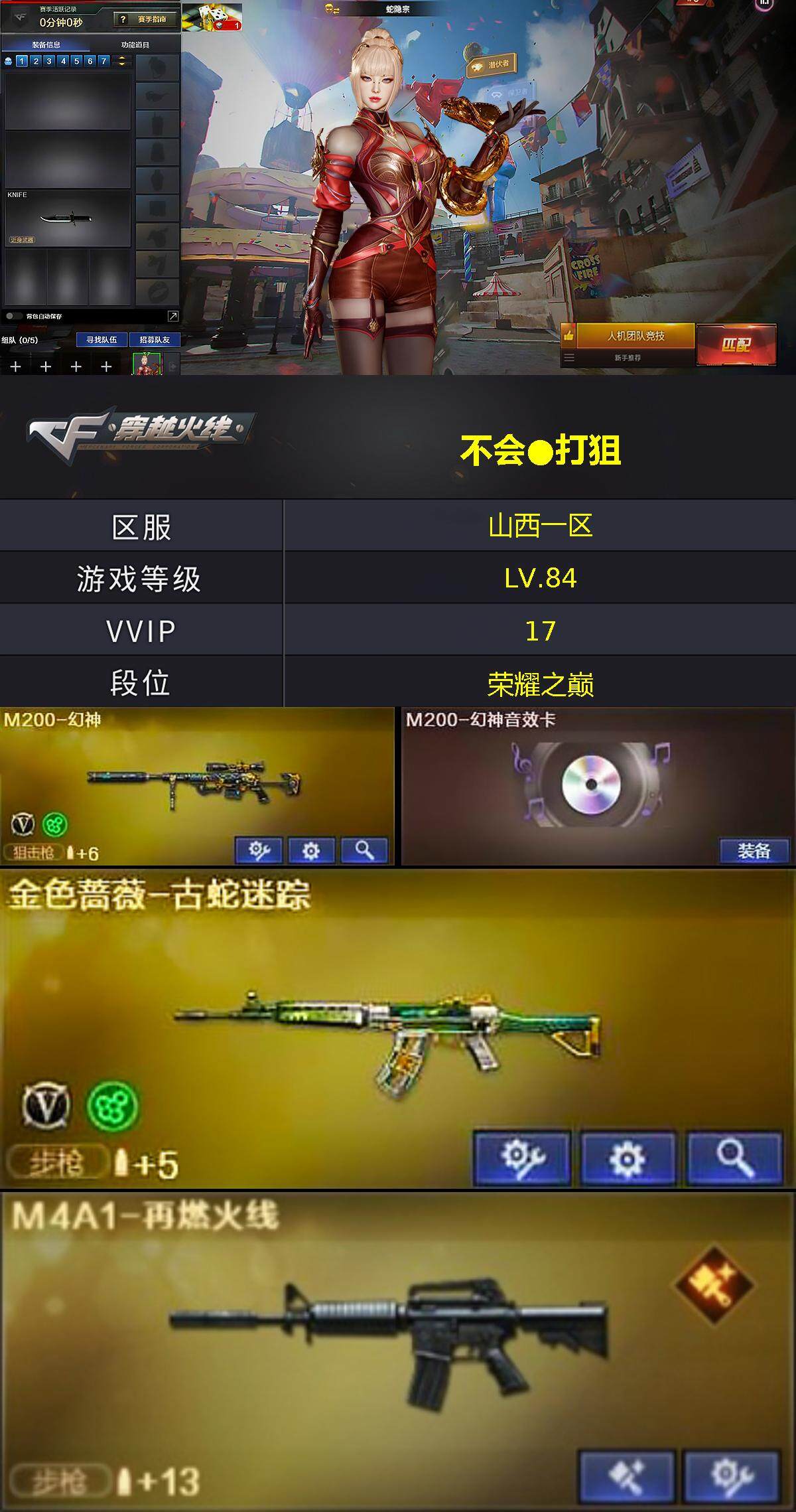 [14917913]山西一区-14v-0王者-0炫金 【热门武器】:m200-幻神,金色蔷薇-古蛇迷踪,修罗-古蛇迷踪 【音效卡】:m200-幻神音效卡,炼狱-百战金芒-庆典舞曲音效卡 【皮肤】:金色蔷薇-电竞之星 皮肤,m4a1-再燃火线,轻型军用手斧-再燃火线 【角色】:蛇隐宗,暗夜-x,芳心审判者,风暴女,兰妹妹,蛇姬,蜀雪,新娜塔莎 【人偶武器】:异变清道夫-蛇影双骄,awm-灵狐-15周年嘉年华 【暴走