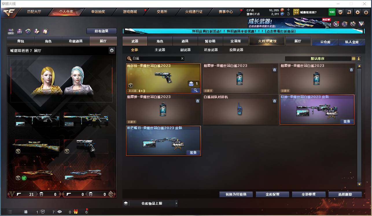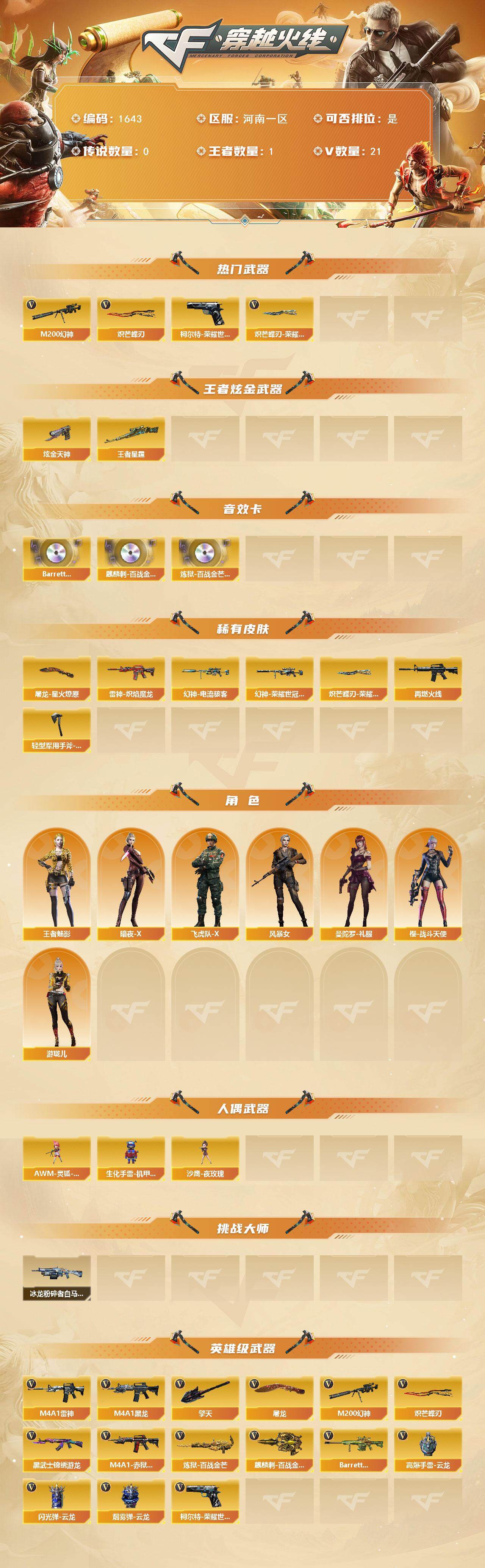 【1643】伊35365可排位-可二次【河南一区/19v/vip4】【白鲨套】【四防王者-魅影】【王者星霆】【白虎-九尾白狐】【m200-幻神/幻神-荣耀世冠白鲨2023皮/幻神-电流骇客皮】【柯尔特-荣耀世冠白鲨2023】【炽芒蝶刃/炽芒蝶刃-荣耀世冠白鲨2023皮】【m4a1-雷神/雷神-炽焰魔龙】【火麒麟-cfstar】【m4a1-黑龙】【黑武士-锦绣游龙】【炼狱-百战金芒】【云龙扇】【麒麟刺-百战金芒】【擎天】【屠龙/屠龙-星火燎原】【王者-魅影/暗夜-x/救世主-x】【黑鲨-电流骇客皮】【colt1911-小故障/colt 1911-大黄蜂/新usp-呛王排位奖励】【沙鹰-夜玫瑰】【盐雾蛋-荣耀世冠白鲨20233】【高爆手蕾-云龙2/闪光丹-云龙3/盐雾蛋-云龙】【炫金天神】【防弹头盔2/防弹衣2/c4工具钳2/手蕾包2/防化服2】【截图展示段位不代表实际段位,如赛季更新等不/拒因素发生变化、时限道具不保证所剩时间。】