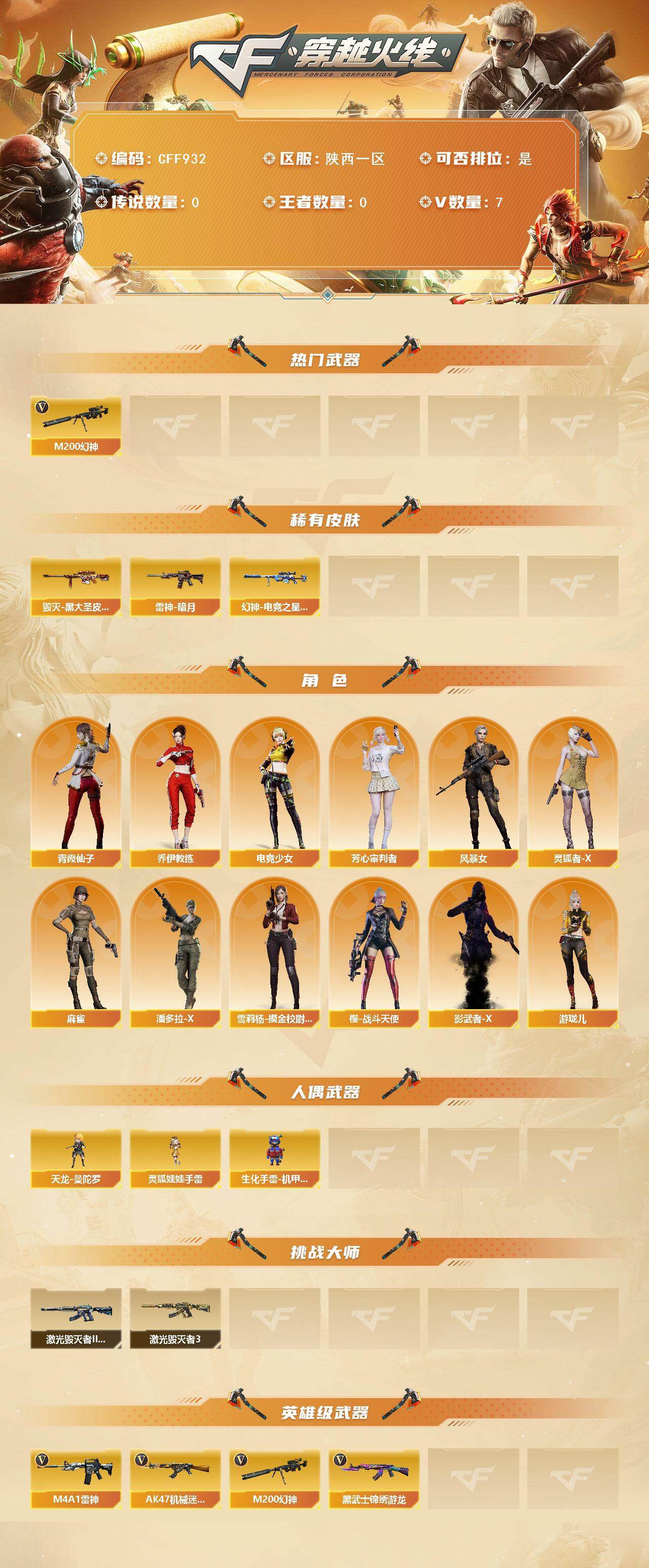【cff932】6v/100级/元帅/1英雄/m200-幻神/幻神-电竞之星 皮肤/雷神-暗月/毁灭-黑大圣皮肤/乔伊教练/电竞少女/芳心审判者/风暴女/灵狐者-x/麻雀/潘多拉-x/青霞仙子/雪莉杨-摸金校尉/樱-战斗天使/影武者-x/游珑儿/天龙-曼陀罗/生化手蕾-机甲核心/灵狐娃娃手蕾/激光毁灭者iii-白马银呛/激光毁灭者iii/m4a1-雷神/ak47-机械迷城/黑武士-锦绣游龙/超级背包/女皇终结者-魔龙之吻/绿色巨人/灵魂忍者/迷雾幽灵/生化弹匣/夺命之镰/防化服/金色流光-呛王排位/星辰流光-呛王排位/呛王排位28赛季金色流光/呛王排位29赛季金色流光/动感闪耀表情/防弹头盔/防弹衣/c4工具钳/手蕾包