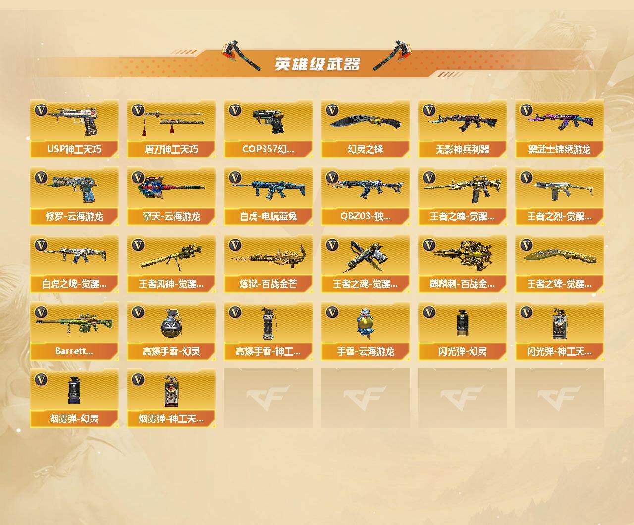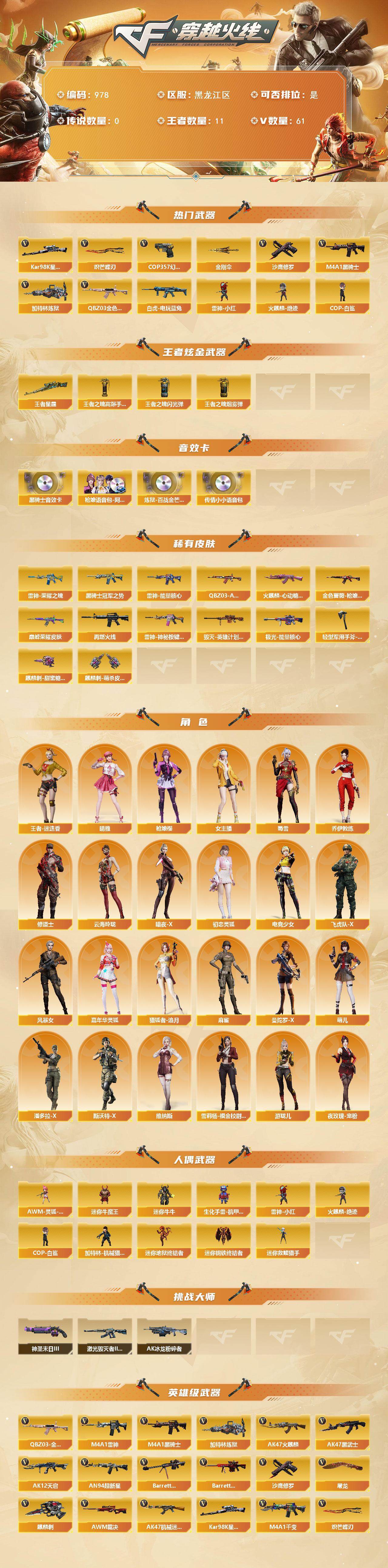 [14923477]黑龙江区-61v-11王者-0炫金 【热门武器】:q03-金色蔷薇2,白虎-电玩蓝兔,kar98k-星神,m4a1-黑骑士,加特林-炼狱,雷神-小红,火麒麟-绝迹,cop-白鲨,cop 357-幻灵,沙鹰-修罗4,炽芒蝶刃,金刚伞 【王者炫金武器】:王者星霆,王者之魄高爆手蕾,王者之魄闪光丹,王者之魄盐雾蛋 【音效卡】:m4a1-黑骑士音效卡,呛娘语音包-阿敏,炼狱-百战金芒-庆典舞曲音效卡,传情小小语音包 【皮肤】:q03-ag-cfpls19冠军,金色蔷薇-呛娘阿敏 皮肤,q03-巅峰荣耀皮肤,雷神-能量核心,雷神-荣耀之魄,m4a1-再燃火线,雷神-神秘按键 皮肤,火麒麟-心动糖果,毁灭-英雄计划 皮肤,黑骑士-冠军之势,极光-能量核心,轻型军用手斧-再燃火线,麒麟刺-甜蜜糖果 皮肤,麒麟刺-萌杀皮肤 【角色】:呛娘樱,晴雅,王者-迷迭香,乔伊教练,修道士,云海玲珑,暗夜-x,初恋灵狐,电竞少女,飞虎队-x,风暴女,嘉年华灵狐,猎狐者-追月,麻雀,曼陀罗-x,萌儿,女主播,潘多拉-x,斯沃特-x,蜀雪,维纳斯,雪莉杨-摸金校尉,夜玫瑰-宠粉,游珑儿 【人偶武器】:雷神-小红,火麒麟-绝迹,cop-白鲨,迷你钢铁终结者,迷你救赎猎手,加特林-机械猎手,迷你地狱终结者,awm-灵狐-15周年嘉年华,迷你牛魔王,迷你牛牛,生化手蕾-机甲核心 【挑战大师】:ak47-冰龙粉碎者,激光毁灭者iii-白马银呛3,神圣爆裂者-末日iii 【英雄级武器】:m4a1-千变2,ak47-火麒麟,m4a1-雷神,m4a1-黑骑士,ak47-黑武士,ak12-天启,an94-超新星,ak47-机械迷城,无影-神兵利器,黑武士-锦绣游龙,q03-独角-iii,q03-金色蔷薇2,王者之魄-觉醒版,王者之烈-觉醒版,白虎-电玩蓝兔,白虎之魄-觉醒版,barrett-毁灭,barrett-极光,awm-裁决,kar98k-星神,王者风神-觉醒版,加特林-炼狱,炼狱-百战金芒,沙鹰-修罗4,cop 357-幻灵,usp-神工天巧,王者之魂-觉醒版,修罗-云海游龙,屠龙,麒麟刺2,幻灵之锋,炽芒蝶刃,唐刀-神工天巧,擎天-云海游龙,麒麟刺-百战金芒,王者之锋-觉醒版,高爆手蕾-幻灵4,高爆手蕾-神工天巧2,手蕾-云海游龙,闪光丹-幻灵4,闪光丹-神工天