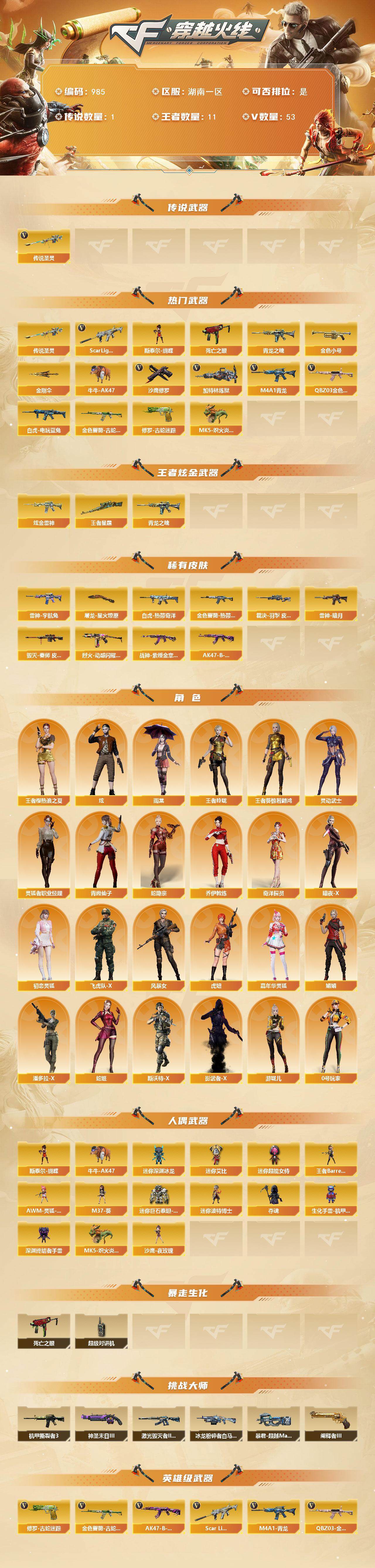 [14923736]湖南一区-53v-11王者-1炫金 【传说武器】:传说圣灵 【热门武器】:传说圣灵,q03-金色蔷薇,scar light-白虎,m4a1-青龙,金色蔷薇-古蛇迷踪,修罗-古蛇迷踪,死亡之眼,青龙之魄,白虎-电玩蓝兔,金色小号,牛牛-ak47,加特林-炼狱3,斯泰尔-蝴蝶,mk5-炽火炎龙,沙鹰-修罗,金刚伞 【王者炫金武器】:青龙之魄,王者星霆,炫金雷神 【皮肤】:白虎-热带奇洋 皮肤,金色蔷薇-热带奇洋 皮肤,裁决-羽掣 皮肤,雷神-暗月,雷神-宇航兔皮肤,毁灭-秦师 皮肤,烈火-动感闪耀 皮肤,战神-紫绶金章皮肤,ak47-b-常胜将军-曹操,屠龙-星火燎原 【角色】:炫,雨棠,王者樱-热浪之夏,王者葵-惊若翩鸿,王者玲珑,蛇隐宗,奇洋探员,乔伊教练,暗夜-x,初恋灵狐,飞虎队-x,风暴女,虎妞,嘉年华灵狐,娟娟,0号玩家,灵动武士,灵狐者-职业经理,潘多拉-x,青霞仙子,蛇姬,斯沃特-x,影武者-x,游珑儿 【人偶武器】:王者barrett-英勇金戈,mk5-炽火炎龙,斯泰尔-蝴蝶,awm-灵狐-15周年嘉年华,m37-葵,牛牛-ak47,迷你深渊冰龙,迷你波特博士,夺魂2,生化手蕾-机甲核心4,深渊终结者手蕾3,迷你艾比,迷你超能女侍,迷你巨石泰坦-魔花研究所,沙鹰-夜玫瑰 【暴走生化】:死亡之眼,超级对讲机 【挑战大师】:暴君乱世-超越max,冰龙粉碎者-白马银呛2,激光毁灭者iii-白马银呛4,机甲撕裂者iii,神圣爆裂者-末日iii3,阐释者iii2 【英雄级武器】:ak47-火麒麟,m4a1-雷神,m4a1-死神,ak12-天启,an94-超新星,ak47-机械迷城,m4a1-青龙,scar light-白虎,无影-神兵利器,黑武士-锦绣游龙,超新星-热带奇洋,金色蔷薇-古蛇迷踪,m4a1-玫瑰精灵,q03-金色蔷薇,ak-47-猩红传说2,ak47-b-战神,ak47-b-常胜将军,王者之烈-觉醒版,王者白虎-觉醒版,王者龙血-觉醒版,白虎-电玩蓝兔,黑武士-cf网剧冠军,awm-裁决,王者幻神-觉醒版,加特林-炼狱3,沙鹰-修罗,沙鹰-天神,cop 357-云龙,天神-动感闪耀,修罗-古蛇迷踪,天神-cf网剧冠军,屠龙2,麒麟刺2,幻灵之锋,龙啸-热带奇洋,擎天-cf网剧冠军,高爆手蕾-幻灵,高爆手蕾-竞技荣光