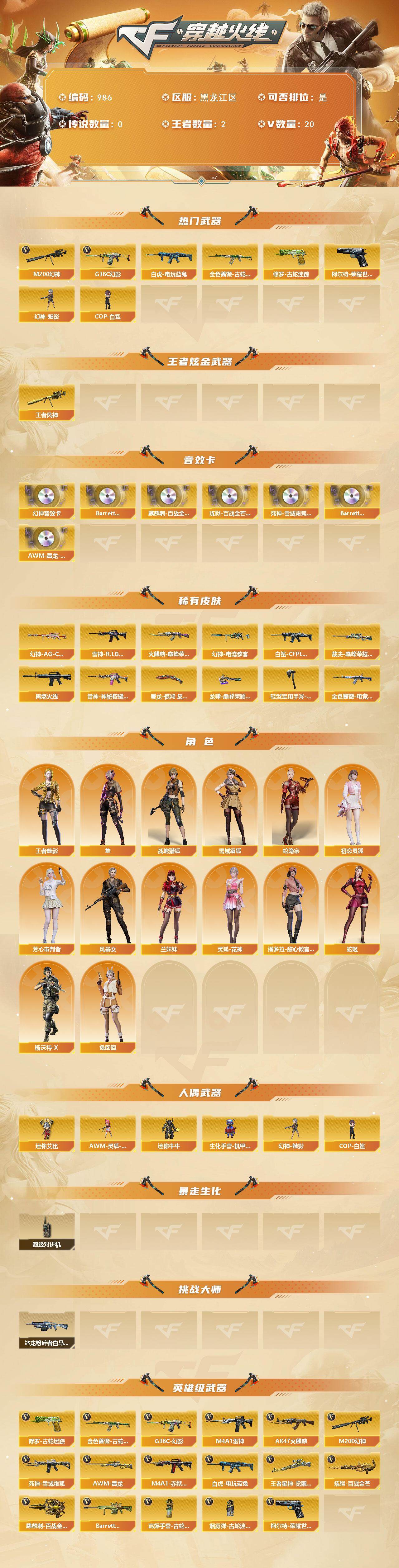 [14923768]黑龙江区-20v-2王者-0炫金 【热门武器】:g36c-幻影,m200-幻神2,柯尔特-荣耀世冠白鲨2023,金色蔷薇-古蛇迷踪,修罗-古蛇迷踪,白虎-电玩蓝兔,幻神-魅影,cop-白鲨 【王者炫金武器】:王者风神 【音效卡】:m200-幻神音效卡,barrett-碧霄极光音效卡,麒麟刺-百战金芒-盛典舞曲音效卡,炼狱-百战金芒-庆典舞曲音效卡,死神-雪域霜狐-怀旧音效卡,barrett-毁灭-怀旧音效卡,awm-昌龙-怀旧音效卡 【皮肤】:幻神-电流骇客 皮肤,幻神-ag-cfpl s24冠军 皮肤,白虎-白鲨-cfpls23冠军,金色蔷薇-电竞之星 皮肤,裁决-巅峰荣耀 皮肤,雷神-r.lgd-cfpls18冠军,m4a1-再燃火线,雷神-神秘按键 皮肤,火麒麟-巅峰荣耀,屠龙-惊鸿 皮肤,龙啸-巅峰荣耀 皮肤,轻型军用手斧-再燃火线 【角色】:隼,战地猎狐,王者-魅影,雪域霜狐,蛇隐宗,初恋灵狐,芳心审判者,风暴女,兰妹妹,灵狐-花神,潘多拉-甜心教官,蛇姬,斯沃特-x,兔囡囡 【人偶武器】:幻神-魅影,cop-白鲨,awm-灵狐-15周年嘉年华,迷你牛牛,生化手蕾-机甲核心,迷你艾比 【暴走生化】:超级对讲机 【挑战大师】:冰龙粉碎者-白马银呛 【英雄级武器】:ak47-火麒麟,m4a1-雷神,g36c-幻影,金色蔷薇-古蛇迷踪,死神-雪域霜狐,白虎-电玩蓝兔,m200-幻神2,王者星神-觉醒版,炼狱-百战金芒,柯尔特-荣耀世冠白鲨2023,修罗-古蛇迷踪,麒麟刺-百战金芒,高爆手蕾-古蛇迷踪,盐雾蛋-古蛇迷踪,m4a1-赤狱骑士,awm-昌龙,barrett-碧霄极光 【道具】:bs战队炫彩背包,云山科技背包,亚洲杯纪念炫彩背包,古蛇迷踪炫彩背包,百战金芒炫彩背包,背包-洛丽塔,超级背包,雪域霜狐炫彩背包,女皇终结者-魔龙之吻,救世主-黑桃战神,黄金生化钩,绿色巨人,灵魂忍者,迷雾幽灵,夺命之镰,防化服3,流光-再燃火线,呛王排位29赛季金色流光,语音特效-盛典烟火,语音特效-怀旧,古蛇迷踪打击特效,雪域霜狐表情,蛇隐宗表情,萌萌小葵表情,c4-再燃火线,防弹头盔3,防弹衣3,c4工具钳3,手蕾包3 【特殊呛械】: