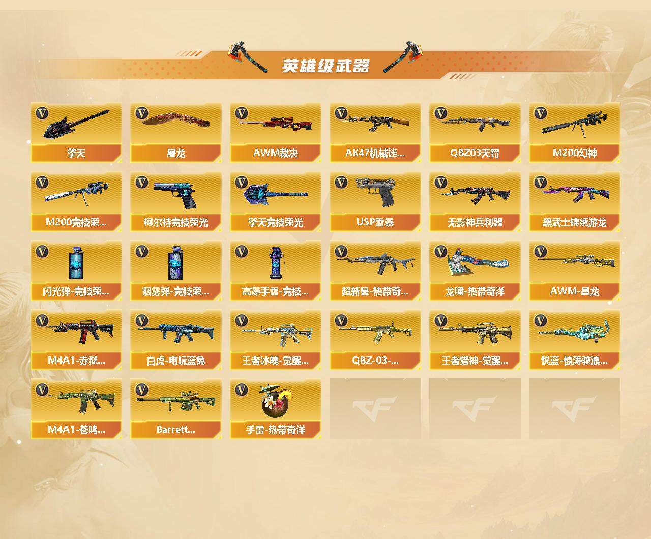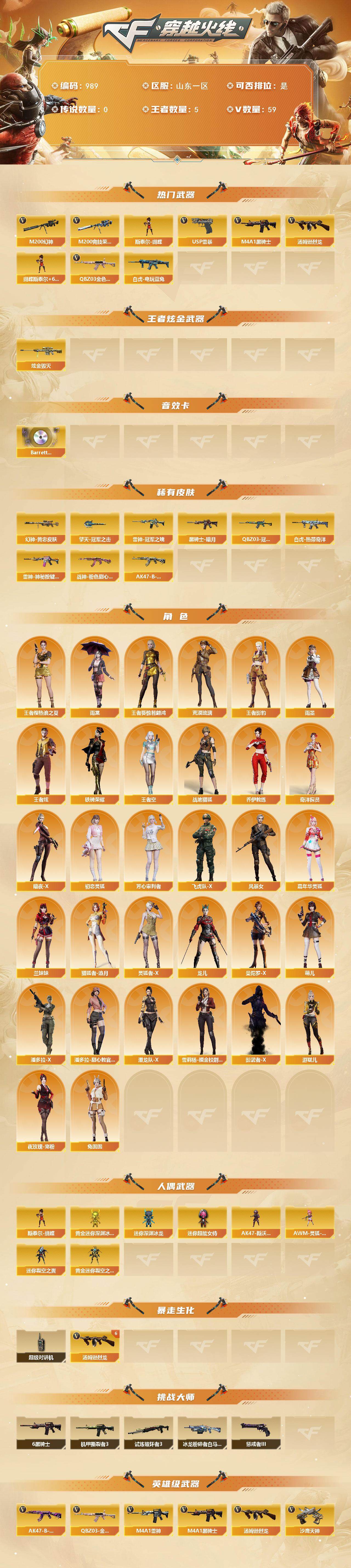 [14923861]山东一区-59v-5王者-1炫金 【热门武器】:q03-金色蔷薇,m200-幻神,m200-竞技荣光,白虎-电玩蓝兔,m4a1-黑骑士6,汤姆逊-烈龙6,斯泰尔-蝴蝶,usp-雷暴 【王者炫金武器】:炫金毁灭 【音效卡】:barrett-碧霄极光音效卡 【皮肤】:m200-幻神-黄忠皮肤,白虎-热带奇洋 皮肤,q03-冠军之薇,雷神-冠军之魄,雷神-神秘按键 皮肤,黑骑士-暗月,战神-粉色甜心皮肤2,ak47-b-常胜将军-刘备,擎天-冠军之击 【角色】:雨棠,荒漠琉璃,雨墨,战地猎狐,王者樱-热浪之夏,王者葵-惊若翩鸿,王者炫,王者影豹,王者空,奇洋探员,乔伊教练,暗夜-x,初恋灵狐,芳心审判者,飞虎队-x,风暴女,嘉年华灵狐,兰妹妹,猎狐者-追月,灵狐者-x,龙儿,曼陀罗-x,萌儿,潘多拉-x,潘多拉-甜心教官,潜龙队-x,铁骑荣耀,兔囡囡,雪莉杨-摸金校尉,夜玫瑰-宠粉,影武者-x,游珑儿 【人偶武器】:斯泰尔-蝴蝶,awm-灵狐-15周年嘉年华3,黄金迷你深渊冰龙,迷你深渊冰龙,迷你裂空之翼,黄金迷你裂空之翼,ak47-斯沃特,迷你超能女侍 【暴走生化】:超级对讲机 【挑战大师】:冰龙粉碎者-白马银呛2,机甲撕裂者iii2,试炼破坏者iii2,惩戒者iii 【英雄级武器】:m4a1-雷神,m4a1-黑骑士6,ak47-机械迷城,q03-天罚,无影-神兵利器,黑武士-锦绣游龙,超新星-热带奇洋,q03-金色蔷薇,王者冰魄-觉醒版,ak47-b-常胜将军,q-03-王者蔷薇-觉醒版,白虎-电玩蓝兔,王者猎神-觉醒版,awm-裁决,m200-幻神,m200-竞技荣光,悦蓝-惊涛骇浪-觉醒版,汤姆逊-烈龙6,沙鹰-天神,usp-雷暴,柯尔特-竞技荣光,屠龙,擎天2,擎天-竞技荣光,龙啸-热带奇洋,高爆手蕾-竞技荣光6,手蕾-热带奇洋,闪光丹-竞技荣光6,盐雾蛋-竞技荣光7,m4a1-赤狱骑士,m4a1-苍鸣雷神,awm-昌龙,barrett-碧霄极光 【道具】:bs战队炫彩背包,cfs限定背包,云山科技背包,亚洲杯纪念炫彩背包,冰冰企鹅背包,奇洋探员-海龟背包,机械魔影背包-红色,炫彩背包,热带奇洋炫彩背包,背包-洛丽塔,臻选金狐背包,虎牙炫彩背包,超级背包,黄金巨石泰坦-魔花研究所背包,黄金曼提柯尔的背包,黄金超能特