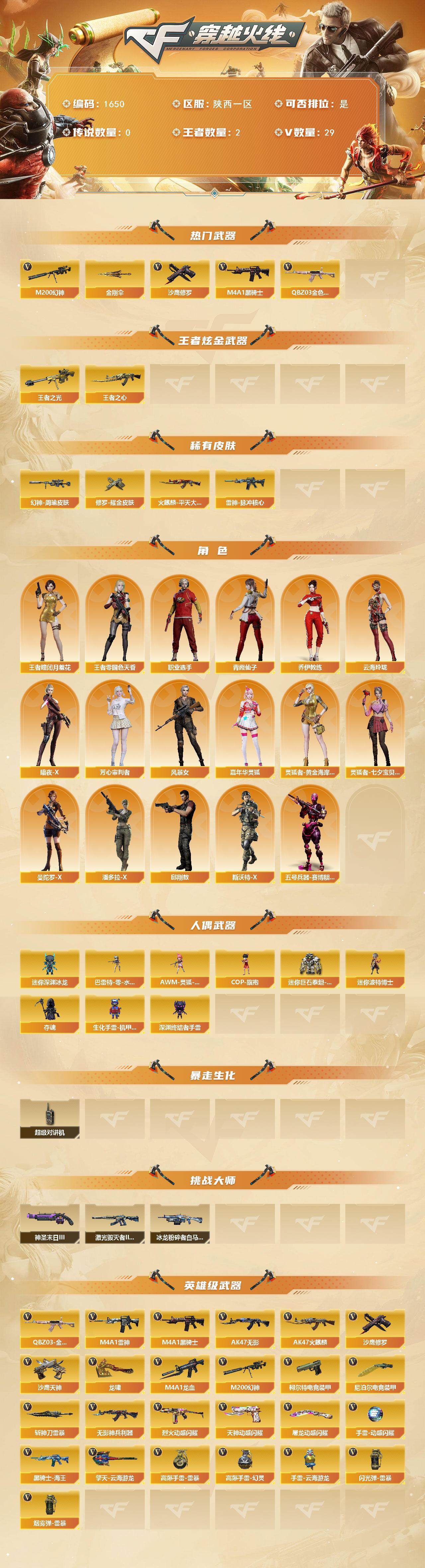 【1650】伊35402可排位-可二次【纯白无封号】【陕西一区/29v/vip1】【幻神3件套/四防王者角色/金刚伞】【m200-幻神/m200-幻神-动感闪耀音效/幻神-周瑜皮肤】【q03-金色蔷薇】【m4a1-雷神/雷神-脉冲核心】【王者之心/王者之光】【柯尔特-电竞装甲】【ak47-火麒麟/火麒麟-cfstar/火麒麟-平天大圣2】【m4a1-黑骑士/黑骑士-海王2】【m4a1-龙血】【ak47-无影/无影-神兵利器】【沙鹰-修罗/修罗耀金皮肤】【沙鹰-天神/天神-动感闪耀】【擎天-云海游龙】【屠龙-动感闪耀】【龙啸】【职业选手/王者-零-国色天香/王者-瞳-闭月羞花/暗夜-x/木兰/云海玲珑/乔伊教练/青霞仙子/灵狐者-黄金海岸/潘多拉-x/斯沃特-x/幻影】【colt,1911-大黄蜂2/柯尔特-萌杀/新usp-呛王排位奖励3】【金刚伞/迷你深渊冰龙/尼泊尔-电竞装甲】【神圣爆裂者-末日iii/激光毁灭者iii-白马银呛/冰龙粉碎者-白马银呛】【cop-旗袍/芭蕾特-零-水下丽影/夺魂】【手蕾-云海游龙】【高爆手蕾-雷暴/闪光丹-雷暴/盐雾蛋-雷暴】【高爆手蕾-幻灵】【闪光丹-电竞装甲/盐雾蛋-电竞装甲】【语音特效-云海游龙】【烟雾保护头盔/闪光护目镜2/超级对讲机/炫彩背包/防弹头盔2/防弹衣/c4工具钳/手蕾包2/防化服】 【稀有套装】:幻神三件套