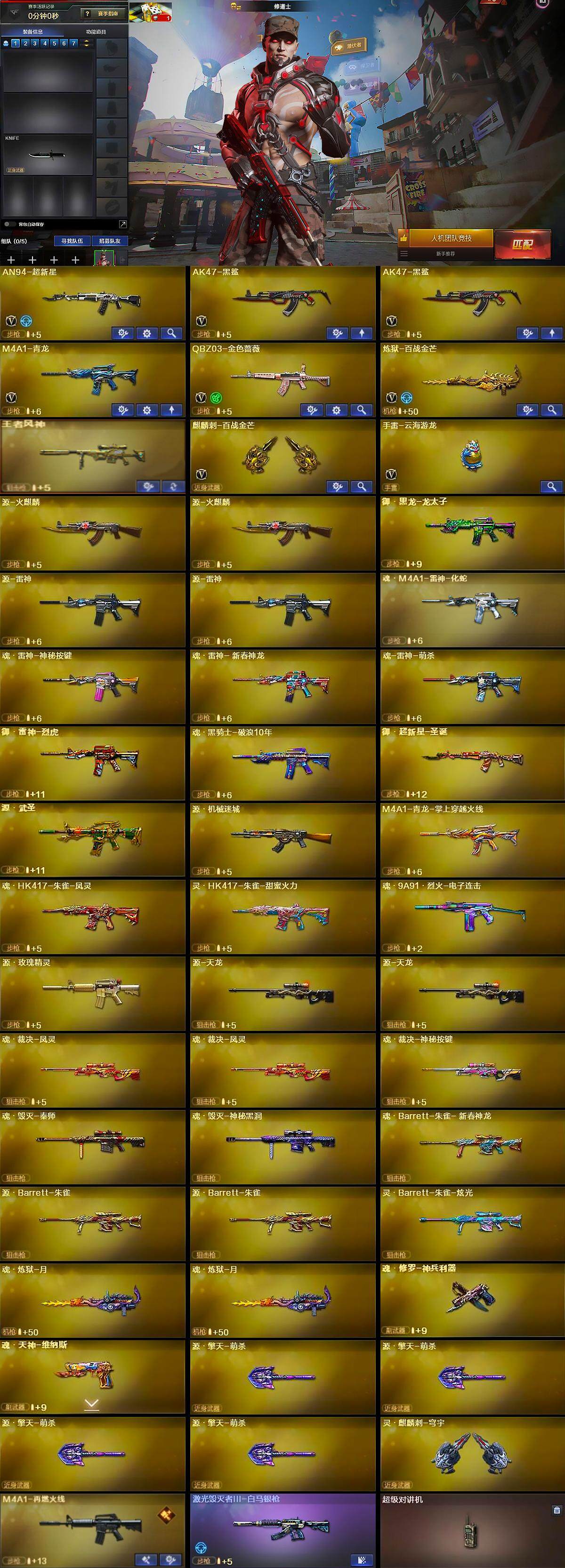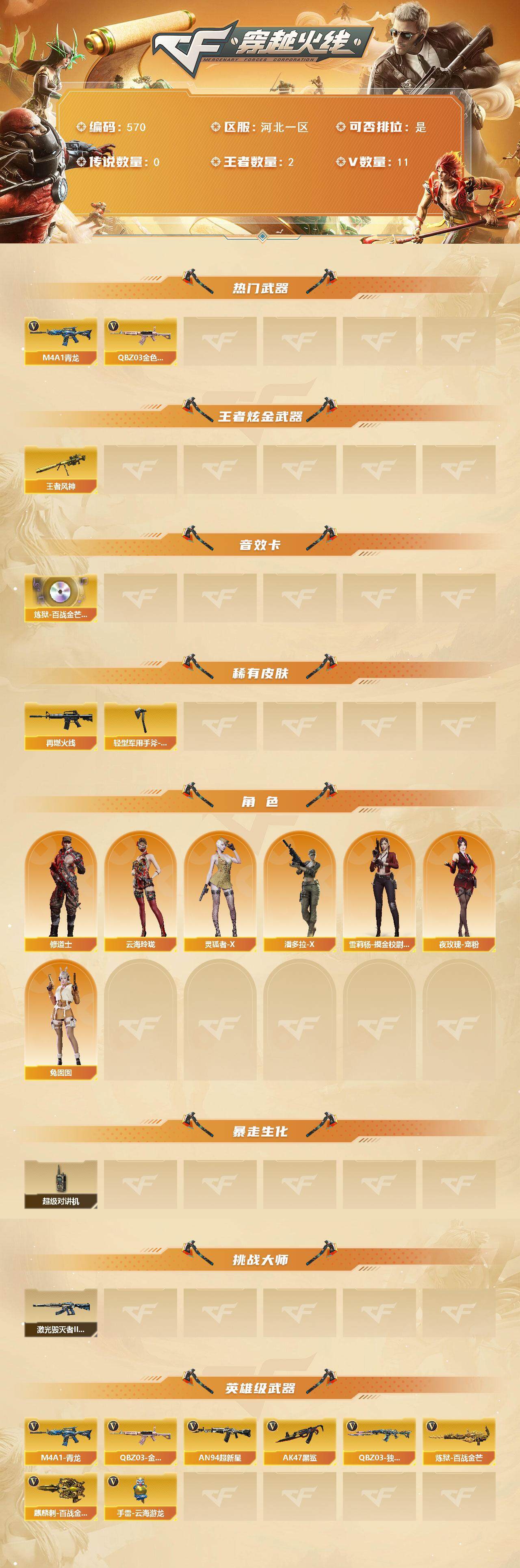 [14928089]河北一区-11v-2王者-0炫金 【热门武器】:q03-金色蔷薇,m4a1-青龙 【王者炫金武器】:王者风神 【音效卡】:炼狱-百战金芒-庆典舞曲音效卡 【皮肤】:m4a1-再燃火线,轻型军用手斧-再燃火线 【角色】:修道士,云海玲珑,灵狐者-x,潘多拉-x,兔囡囡,雪莉杨-摸金校尉,夜玫瑰-宠粉 【暴走生化】:超级对讲机 【挑战大师】:激光毁灭者iii-白马银呛 【英雄级武器】:an94-超新星,ak47-黑鲨2,m4a1-青龙,q03-独角-v,q03-金色蔷薇,炼狱-百战金芒,麒麟刺-百战金芒,手蕾-云海游龙 【道具】:亚洲杯纪念炫彩背包,百战金芒炫彩背包,女皇终结者-魔龙之吻,绿色巨人,灵魂忍者,迷雾幽灵,夺命之镰,防化服2,金色流光-呛王排位,流光-鎏金之域,呛王排位28赛季金色流光,呛王排位29赛季金色流光,语音特效-盛典烟火,语音特效-热带奇洋,零-水下丽影表情,萌萌小葵表情,炽雪表情,防弹头盔3,防弹衣3,c4工具钳3,手蕾包3 【特殊呛械】: