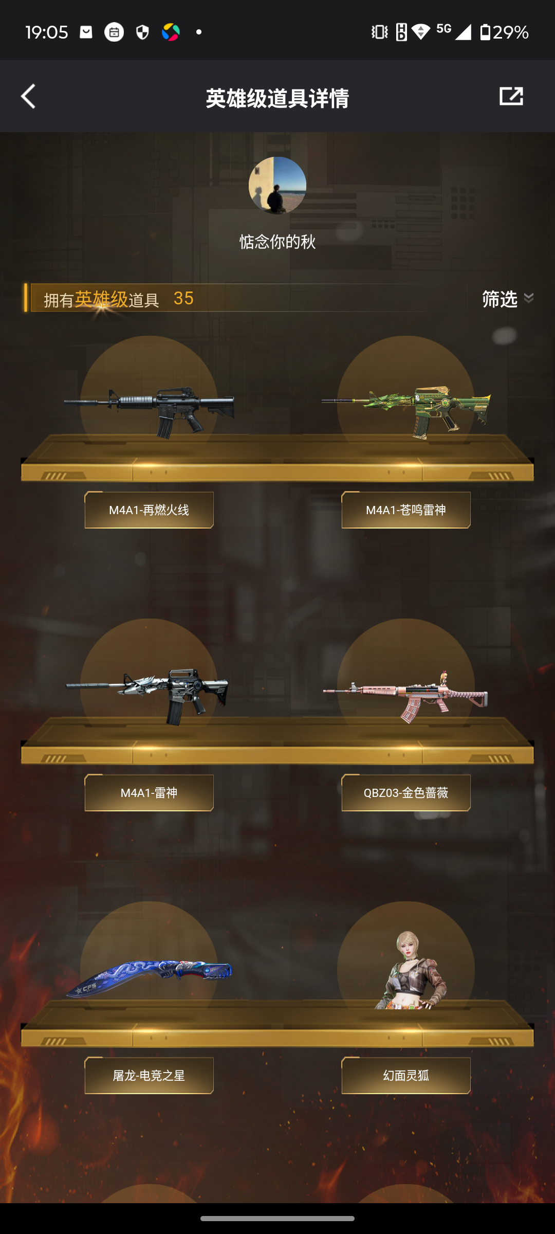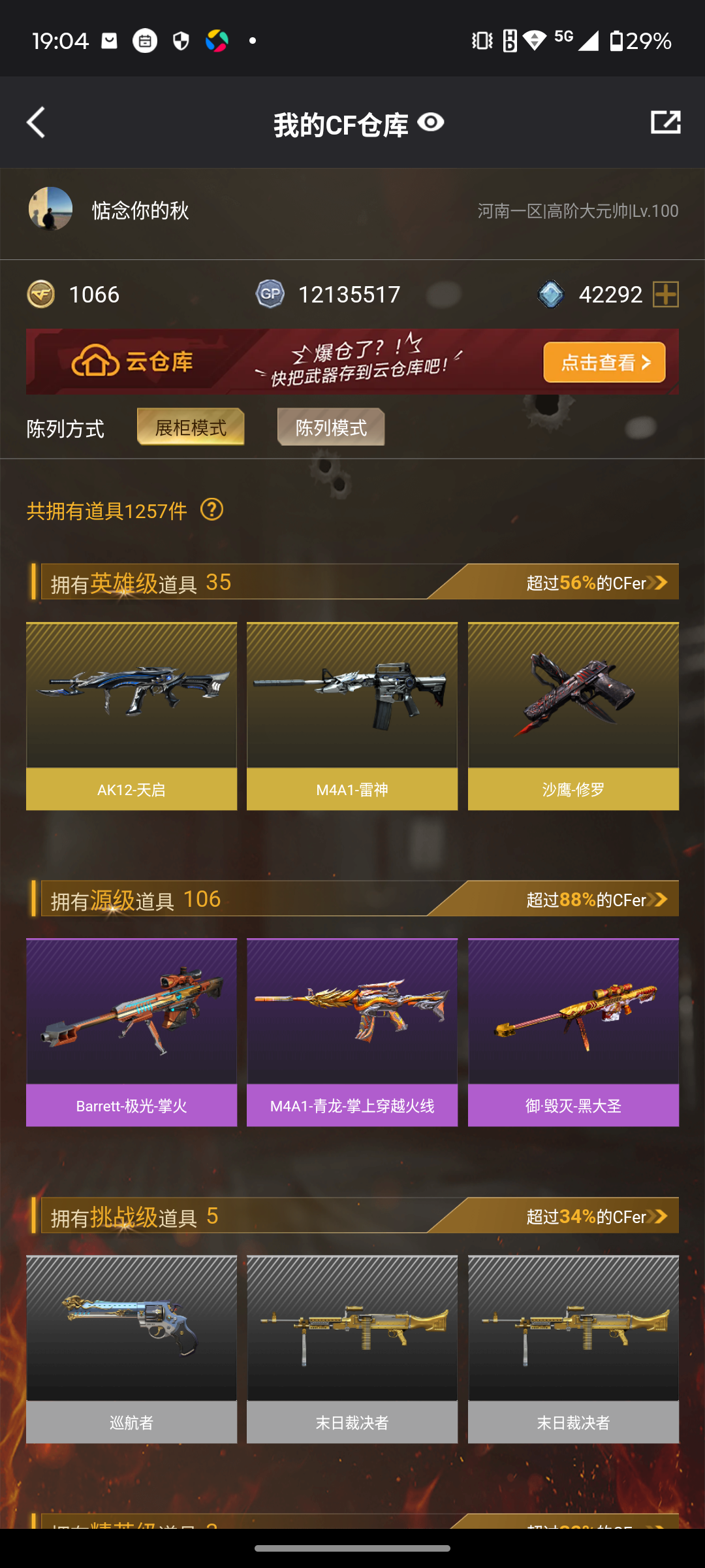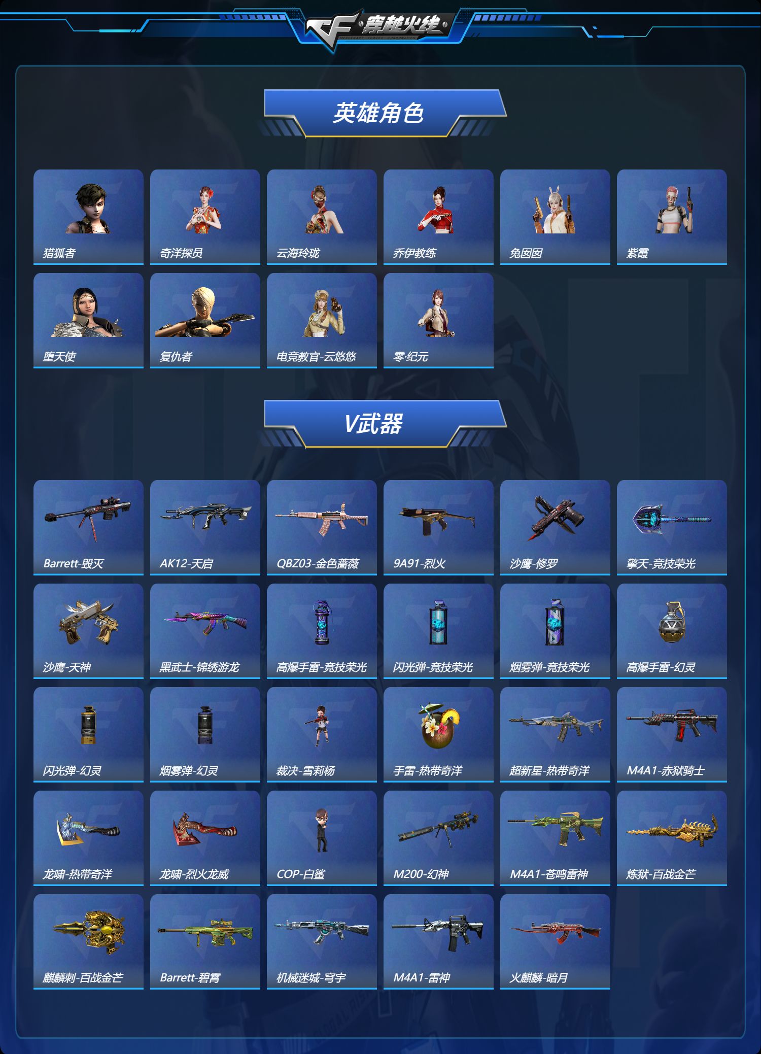 【等级】100【区服】河南一区【段位】荣耀之巅【英雄角色】2【英雄武器】35【英雄级角色】 电竞教官-云悠悠 幻面灵狐 葵-阿尔法武装【英雄级武器】barrett-毁灭 hk417-朱雀-电竞之星 屠龙-电竞之星 m4a1-苍鸣雷神 barrett-碧霄极光 沙鹰-修罗 9a91-烈火 龙啸-烈火龙威 炼狱-百战金芒 ak12-天启 机械迷城-穹宇 麒麟刺-百战金芒 m4a1-再燃火线 m4a1