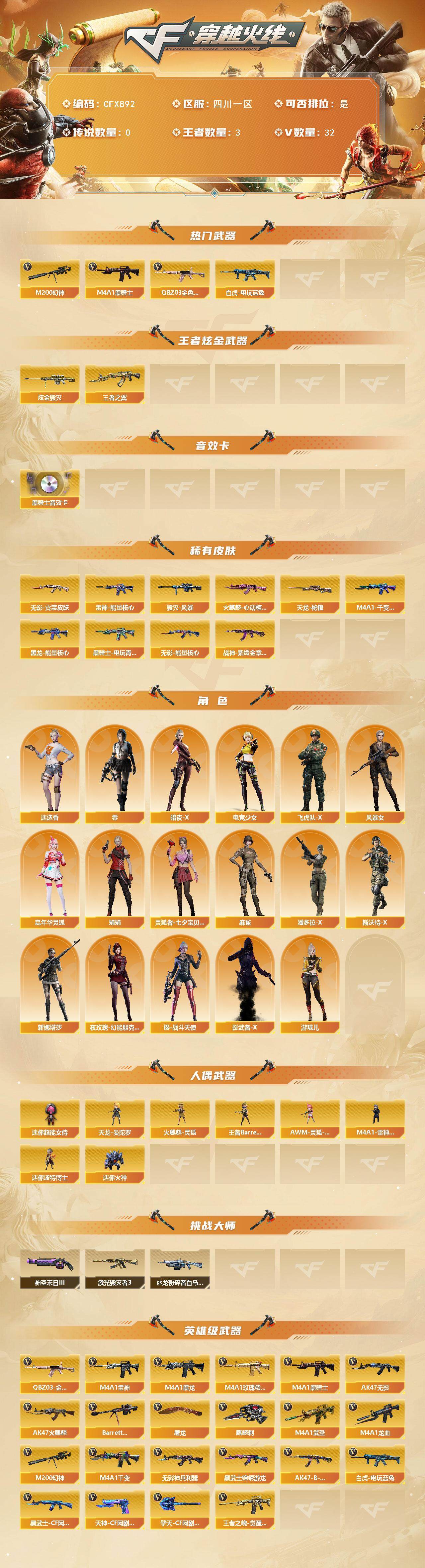 【cfx892】30v/100级/元帅/3王者/1炫金/2英雄/q03-金色蔷薇/m200-幻神/白虎-电玩蓝兔/m4a1-黑骑士/王者之翼/炫金毁灭/m4a1-黑骑士音效卡/雷神-能量核心/火麒麟-心动糖果/毁灭-风暴/m4a1-千变-孔明皮肤/黑龙-能量核心/黑骑士-电玩青兔皮肤/无影-能量核心/无影-霓裳皮肤/战神-紫绶金章皮肤/天龙-秘银/零/迷迭香/暗夜-x/电竞少女/飞虎队-x/风暴女/嘉年华灵狐/娟娟/灵狐者-七夕宝贝/麻雀/潘多拉-x/斯沃特-x/新娜塔莎/夜玫瑰-幻能朋克/樱-战斗天使/影武者-x/游珑儿/天龙-曼陀罗/火麒麟-灵狐/王者barrett-英勇金戈/m4a1-雷神-精英刀锋/awm-灵狐-15周年嘉年华/迷你波特博士/迷你火种/迷你超能女侍/冰龙粉碎者-白马银呛/激光毁灭者iii/神圣爆裂者-末日iii/m4a1-千变/ak47-火麒麟/m4a1-黑龙/m4a1-雷神/ak47-无影/m4a1-武圣/m4a1-龙血/无影-神兵利器/黑武士-锦绣游龙/m4a1-玫瑰精灵/王者之魄-觉醒版/ak47-b-战神/黑武士-cf网剧冠军/barrett-毁灭/天神-cf网剧冠军/屠龙/麒麟刺/擎天-cf网剧冠军/全能呛王背包/炫彩背包/哔哩哔哩名片/绿色巨人/灵魂忍者/变异宝贝/迷雾幽灵/夺命之镰/防化服/金色流光-呛王排位/星辰流光-呛王排位/呛王排位28赛季金色流光/电玩兔兔表情/c4-红龙/防弹头盔/防弹衣/c4工具钳/手蕾包