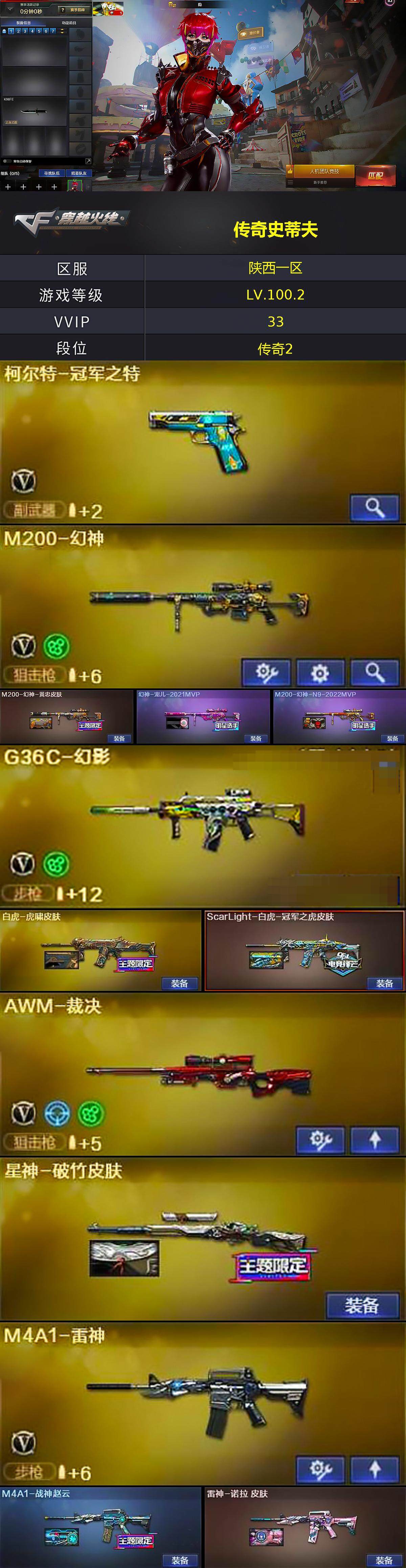 陕西一区-28v-1王者-0炫金 【热门武器】:g36c-幻影,m200-幻神,凤吟之魄,柯尔特-冠军之特,m4a1-黑骑士,加特林-炼狱,羊驼玩偶2,沙鹰-修罗5 【王者炫金武器】:凤吟之魄 【音效卡】:barrett-毁灭音效卡 【皮肤】:m200-幻神-黄忠皮肤,幻神-宠儿-2021mvp,m200-幻神-n9-2022mvp,白虎-虎啸皮肤,scarlight-白虎-冠军之虎皮肤,