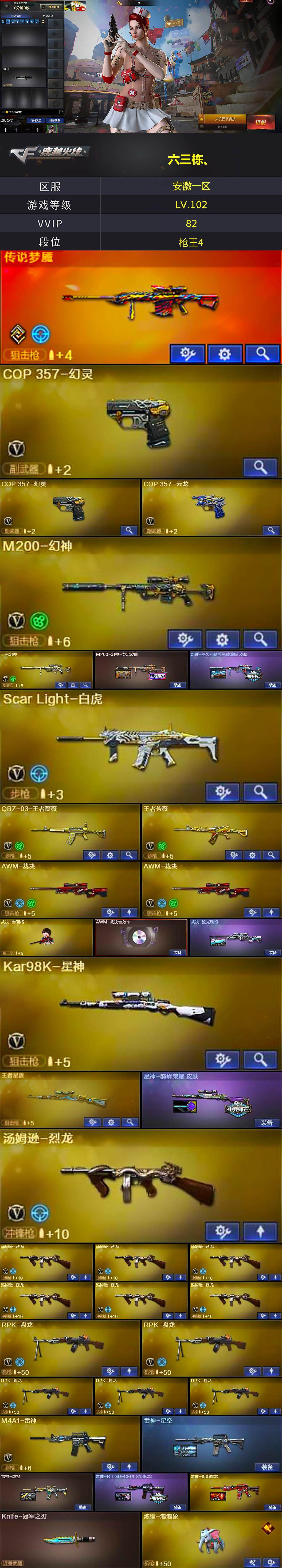 [14962840]安徽一区-79v-9王者-4炫金 【传说武器】:传说梦魇 【热门武器】:传说梦魇,scar light-白虎,m200-幻神,八面凌龙,死亡之眼,q03-街机,kar98k-星神,炼狱-迷你小钢,毒蜂,m4a1-黑骑士2,汤姆逊-烈龙7,rpk-盘龙5,加特林-炼狱2,斯泰尔-蝴蝶,炼狱-呛娘掣电,炼狱-泡泡象,雷神-小红,毁灭-孙三炮,裁决-雪莉杨,cop 357-幻灵2,沙鹰-修罗4,knife-冠军之刃,炽芒蝶刃,炽芒蝶刃-冠军炽芒皮肤,黄金猫猫手套-白鲨 【王者炫金武器】:王者霜心,王者星霆,炫金骑士,炫金毁灭2,炫金天神,王者之魄闪光丹 【音效卡】:ak47-火麒麟音效卡,barrett-极光音效卡,awm-裁决音效卡,barrett-碧霄极光音效卡2 【皮肤】:m200-幻神-黄忠皮肤,幻神-星火小队签名臻藏版 皮肤,裁决-流光秘银,星神-巅峰荣耀 皮肤,雷神-星空,雷神-虎将,雷神-r.lgd-cfpls18冠军,雷神-炽焰魔龙,火麒麟-雷神,火麒麟-冠军之心,火麒麟-平天大圣,火麒麟-心动糖果,毁灭耀金皮肤,毁灭-冠军之怒,黑龙-暗月,无影-霓裳皮肤,战神-紫绶金章皮肤,ak47-b-常胜将军-曹操,awm-天龙-传奇白鲨,极光-高能霹雳 皮肤,炼狱-星空,加特林-炼狱-钟馗皮肤,炼狱-夏佐 皮肤,炼狱-末日审判 皮肤,炼狱-泡泡象,修罗耀金皮肤,屠龙-荣耀世冠ag,屠龙-星火燎原,屠龙-星耀 皮肤,擎天-冠军之击,炽芒蝶刃-冠军炽芒皮肤 【角色】:樱,荒漠琉璃,晴雅,隼,王者-瞳-闭月羞花,王者春,奇洋探员,乔伊教练,修道士,云海玲珑,空,暗夜-x,初恋灵狐,飞虎队-x,嘉年华灵狐,娟娟,卡塔琳娜,葵-赛博朋克,灵动武士,零-水下丽影,灵狐者-职业经理,龙儿,邱刚敖,斯沃特-x,铁骑荣耀,新娜塔莎,樱-青春偶像,游珑儿 【人偶武器】:雷神-小红,毁灭-孙三炮,裁决-雪莉杨,天龙-曼陀罗,炼狱-迷你小钢,炼狱-呛娘掣电,迷你律动酷熊,斯泰尔-蝴蝶,斯泰尔-呛娘暗刃,加特林-机械猎手,迷你深渊冰龙,夺魂,迷你生化手蕾4,迷你超能女侍 【暴走生化】:毒蜂,异变清道夫,kac-狂怒咆哮,双面神,死亡之眼,超级对讲机 【挑战大师】:神圣爆裂者iii,ak47-冰龙粉碎者,冰龙粉碎者-白马银呛,激光毁灭者iii2,kac-圣炎切割者i