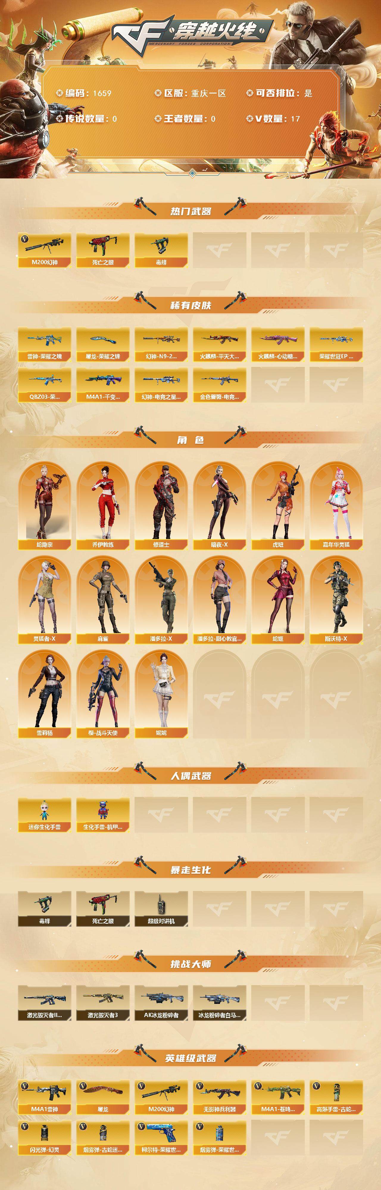 【1659】特29694可排位-可二次【重庆一区/17v/vip6】【纯白无封号/四防妮妮/ep活动打穿/幻神三皮肤/2把ep柯尔特/ep小刀/2ep盐雾蛋】【m200-幻神/幻神-荣耀世冠ep 皮肤/幻神-电竞之星 皮肤m200-幻神-n9-2022mvp】【柯尔特-荣耀世冠ep2】【knife-荣耀世冠ep】【q03-独角/q03-荣耀世冠ep 皮肤】【hk417-朱雀-电竞之星】【m4a1-雷神/雷神-荣耀之魄】【火麒麟-cfstar2/火麒麟-心动糖果/火麒麟-平天大圣】【无影-神兵利器】【天龙-cfstar】【m4a1-千变-孔明皮肤】【死亡之眼/迷你生化手蕾】【修罗-cfstar】【屠龙/屠龙-荣耀之锋】【新海豹突击队/暗夜-x/木兰/乔伊教练/修道士/麻雀/雪莉杨/潘多拉-x/斯沃特-x/幻影/堕天使/复仇者】【colt1911-小故障/colt 1911-大黄蜂3/cop 357-青龙/新usp-呛王排位奖励2】【激光毁灭者iii-白马银呛/激光毁灭者iii2/ak47-冰龙粉碎者/冰龙粉碎者-白马银呛】【斯泰尔-巧克力/轻型军用手斧-镜】【闪光丹-幻灵】【超级护目镜/烟雾保护头盔/闪光护目镜/超级对讲机/超级背包/炫彩背包/防弹头盔6/防弹衣6/c4工具钳6/手蕾包6/防化服3】截图展示段位不代表实际段位,如赛季更新等不/拒因素发生变化、时限道具不保证所剩时间