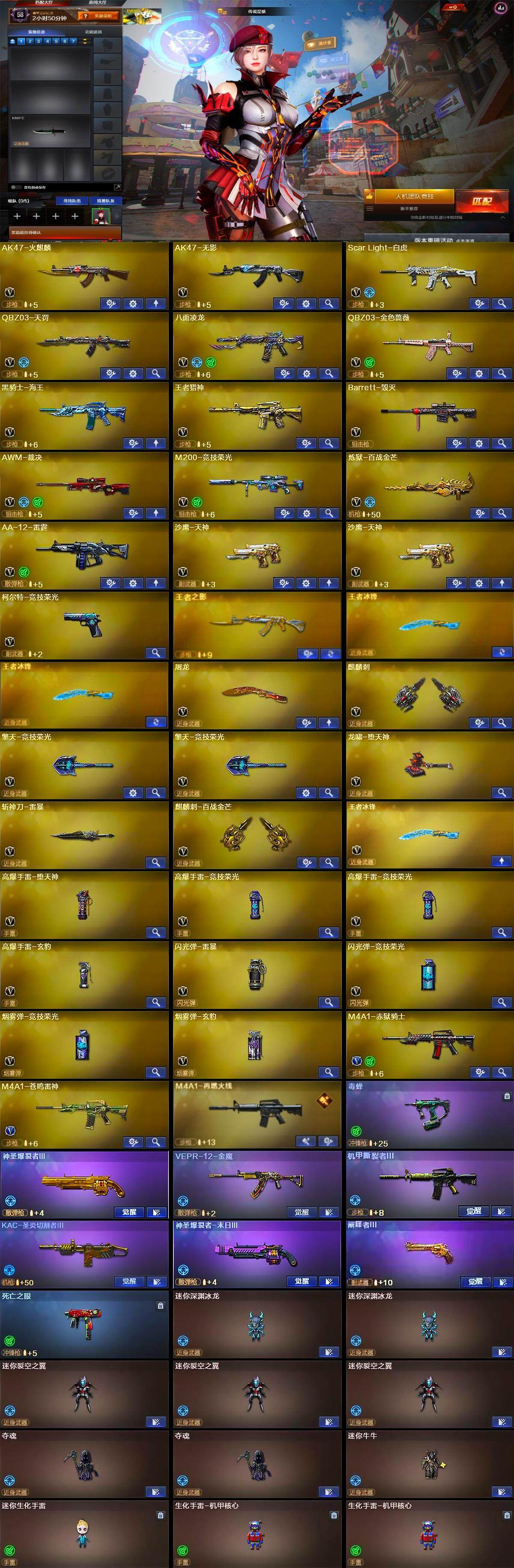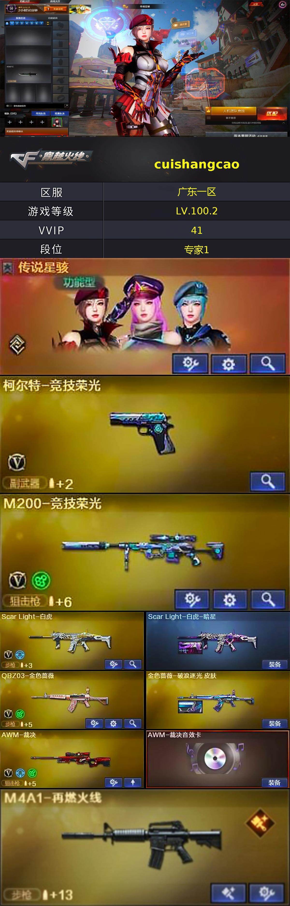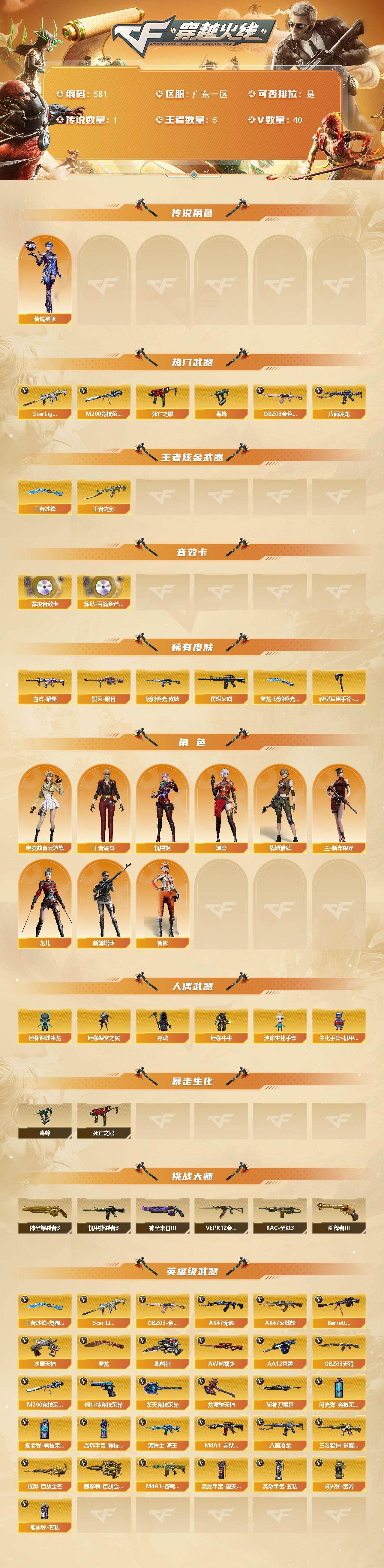 广东一区-40v-5王者-0炫金 【传说角色】:传说星骇 【热门武器】:q03-金色蔷薇,scar light-白虎,m200-竞技荣光,八面凌龙,死亡之眼,毒蜂 【王者炫金武器】:王者之影,王者冰锋 【音效卡】:awm-裁决音效卡,炼狱-百战金芒-庆典舞曲音效卡 【皮肤】:scar light-白虎-暗星,金色蔷薇-破浪逐光 皮肤,m4a1-再燃火线,毁灭-暗月,屠龙-破浪逐光 皮肤,轻