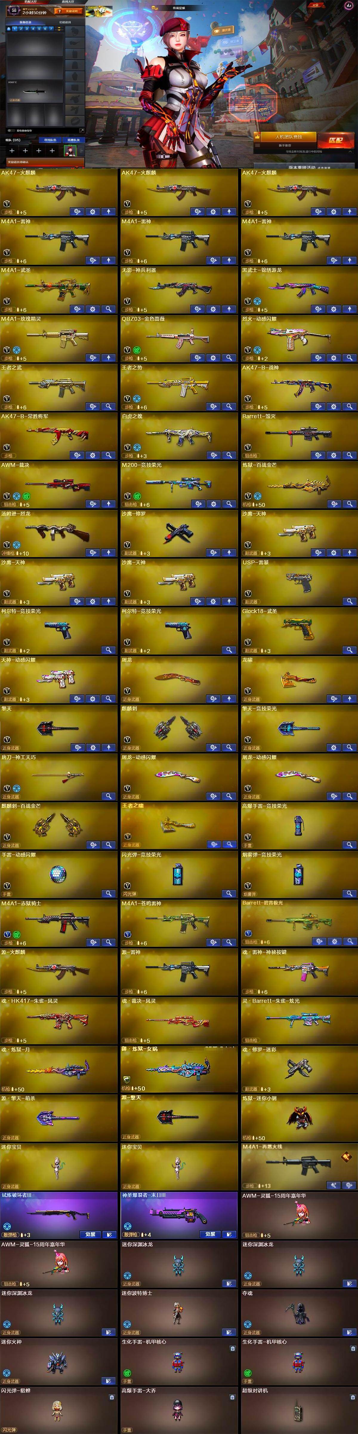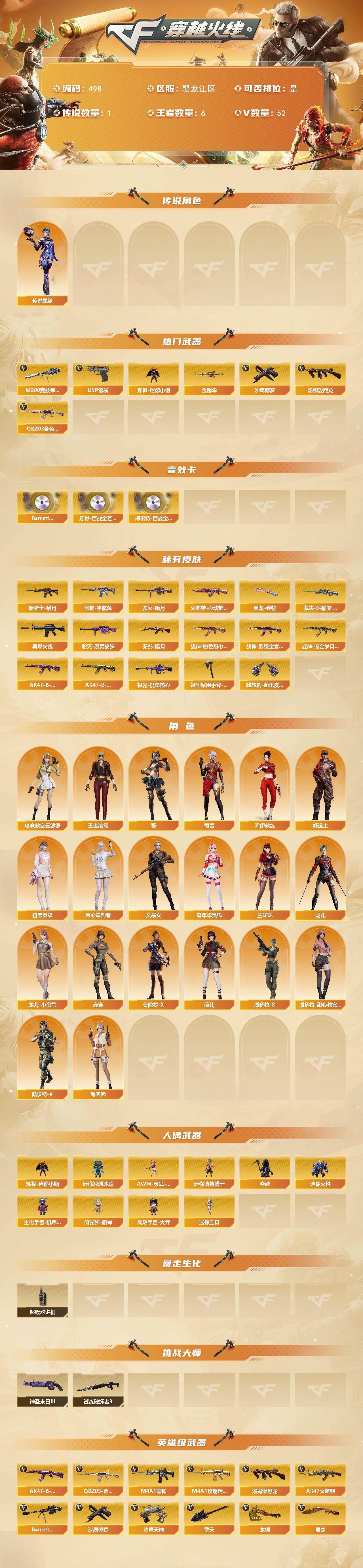 黑龙江区-52v-6王者-0炫金 【传说角色】:传说星骇 【热门武器】:q03-金色蔷薇,m200-竞技荣光,炼狱-迷你小钢,汤姆逊-烈龙,usp-雷暴,沙鹰-修罗,金刚伞 【音效卡】:barrett-碧霄极光音效卡2,炼狱-百战金芒-庆典舞曲音效卡,柯尔特-百战金芒-庆典舞曲音效卡 【皮肤】:裁决-运输船 皮肤,雷神-宇航兔皮肤,m4a1-再燃火线,火麒麟-心动糖果,毁灭-暗月,毁灭-魔灵皮肤,黑骑士-暗月,无影-暗月,战神-粉色甜心皮肤2,战神-紫绶金章皮肤,战神-流金岁月皮肤,ak47-b-常胜将军-曹操,ak47-b-常胜将军-孙权2,极光-能量核心,屠龙-春桃 皮肤,轻型军用手斧-再燃火线,麒麟刺-萌杀皮肤 【角色】:葵,电竞教官-云悠悠,王者凌霄,乔伊教练,修道士,初恋灵狐,芳心审判者,风暴女,嘉年华灵狐,兰妹妹,龙儿,龙儿-小淘气,麻雀,曼陀罗-x,萌儿,潘多拉-x,潘多拉-甜心教官,斯沃特-x,蜀雪,兔囡囡 【人偶武器】:炼狱-迷你小钢,迷你宝贝2,awm-灵狐-15周年嘉年华2,迷你深渊冰龙3,迷你波特博士,夺魂,迷你火种,生化手蕾-机甲核心2,闪光丹-貂蝉,高爆手蕾-大乔 【暴走生化】:超级对讲机 【挑战大师】:试炼破坏者iii,神圣爆裂者-末日iii 【英雄级武器】:ak47-火麒麟3,m4a1-雷神3,m4a1-武圣,无影-神兵利器,黑武士-锦绣游龙,m4a1-玫瑰精灵,q03-金色蔷薇,烈火-动感闪耀,王者之武-觉醒版,王者之势-觉醒版,ak47-b-战神,ak47-b-常胜将军,白虎之魄-觉醒版,barrett-毁灭,awm-裁决,m200-竞技荣光,炼狱-百战金芒,汤姆逊-烈龙,沙鹰-修罗,沙鹰-天神3,usp-雷暴,柯尔特-竞技荣光2,glock18-武圣,天神-动感闪耀,屠龙,龙啸,擎天,麒麟刺,擎天-竞技荣光,唐刀-神工天巧,屠龙-动感闪耀2,麒麟刺-百战金芒,王者之啸-觉醒版,高爆手蕾-竞技荣光,手蕾-动感闪耀,闪光丹-竞技荣光,盐雾蛋-竞技荣光,m4a1-赤狱骑士,m4a1-苍鸣雷神,barrett-碧霄极光 【道具】:cfs限定背包,云山科技背包,亚洲杯纪念炫彩背包,全能呛王背包,战舰背包,炫彩背包-诺拉,炫彩背包,百战金芒炫彩背包,虎牙炫彩背包,超级背包,女皇终结者-魔龙之吻,救世主-黑桃战神,绿色巨人,灵魂忍者,变异宝贝,迷雾幽灵,生化弹匣,夺命之镰,防化服3,金色流光-呛王排位2,星辰流光-呛王排位,呛王排位28赛季金色流光,呛王排位29赛季金色流光,语音特效-盛典烟火,萌萌小葵表情,动感闪耀表情,云海游龙表情,ep战队名片,ep战队喷图,ep战队击杀图标,防弹头盔4,防弹衣4,c4工具钳3,手蕾包3 【特殊呛械】:1烈龙