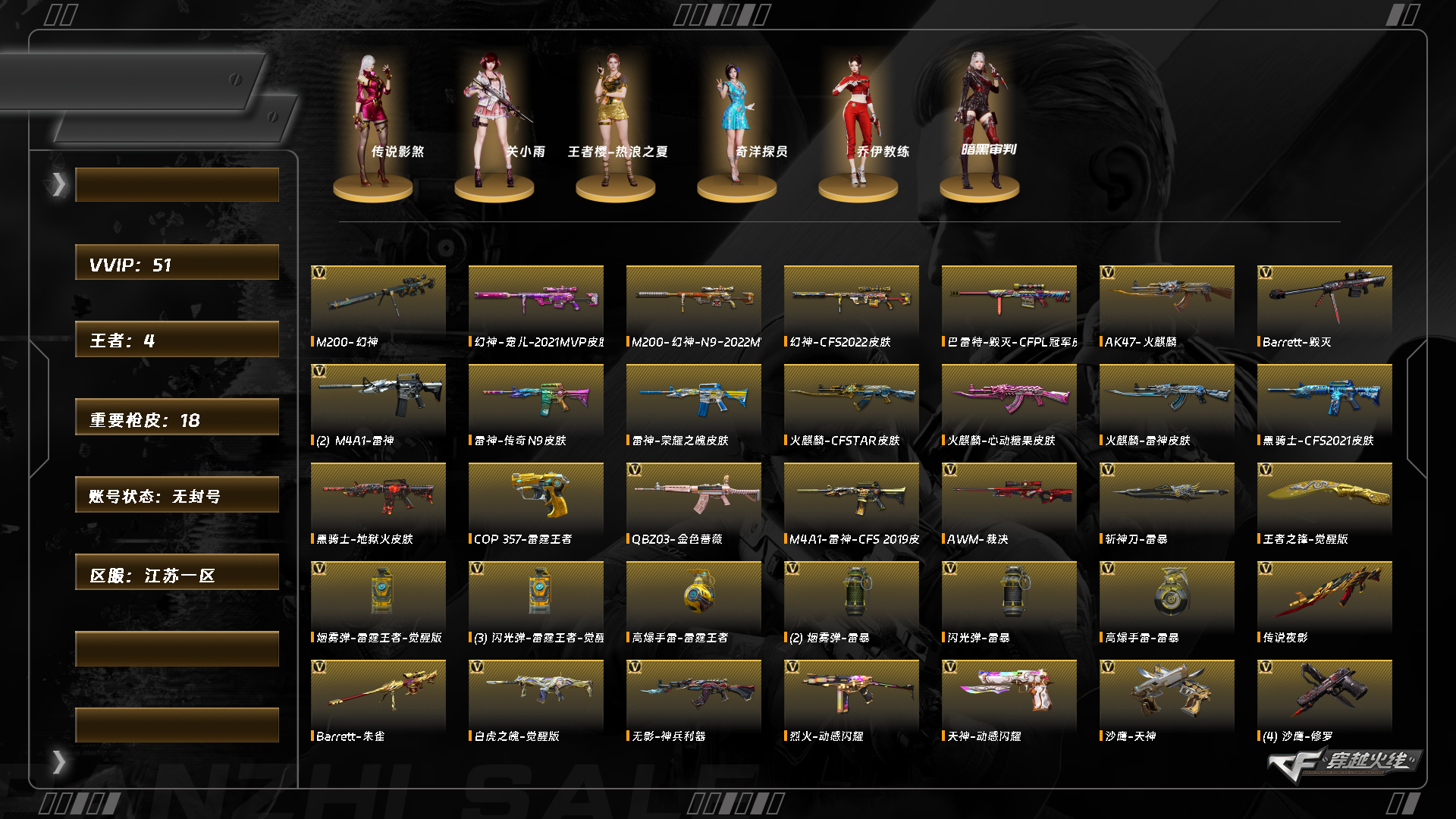abc9443/东部/江苏一区/钱包注销/可排位/可二次/掌火id;/53v/【双传说/幻神三件套】/传说影煞/传说夜影/幻神/幻神音效卡/幻神宠儿/幻神n9/幻神cfs2022/王者星霆/白虎之魄/裁决/朱雀电竞之星/q金色蔷薇/柯尔特无冕之王/usp神功天巧/炽芒蝶刃/天龙