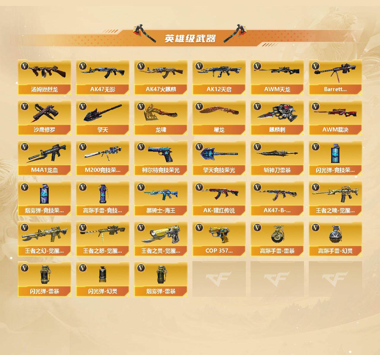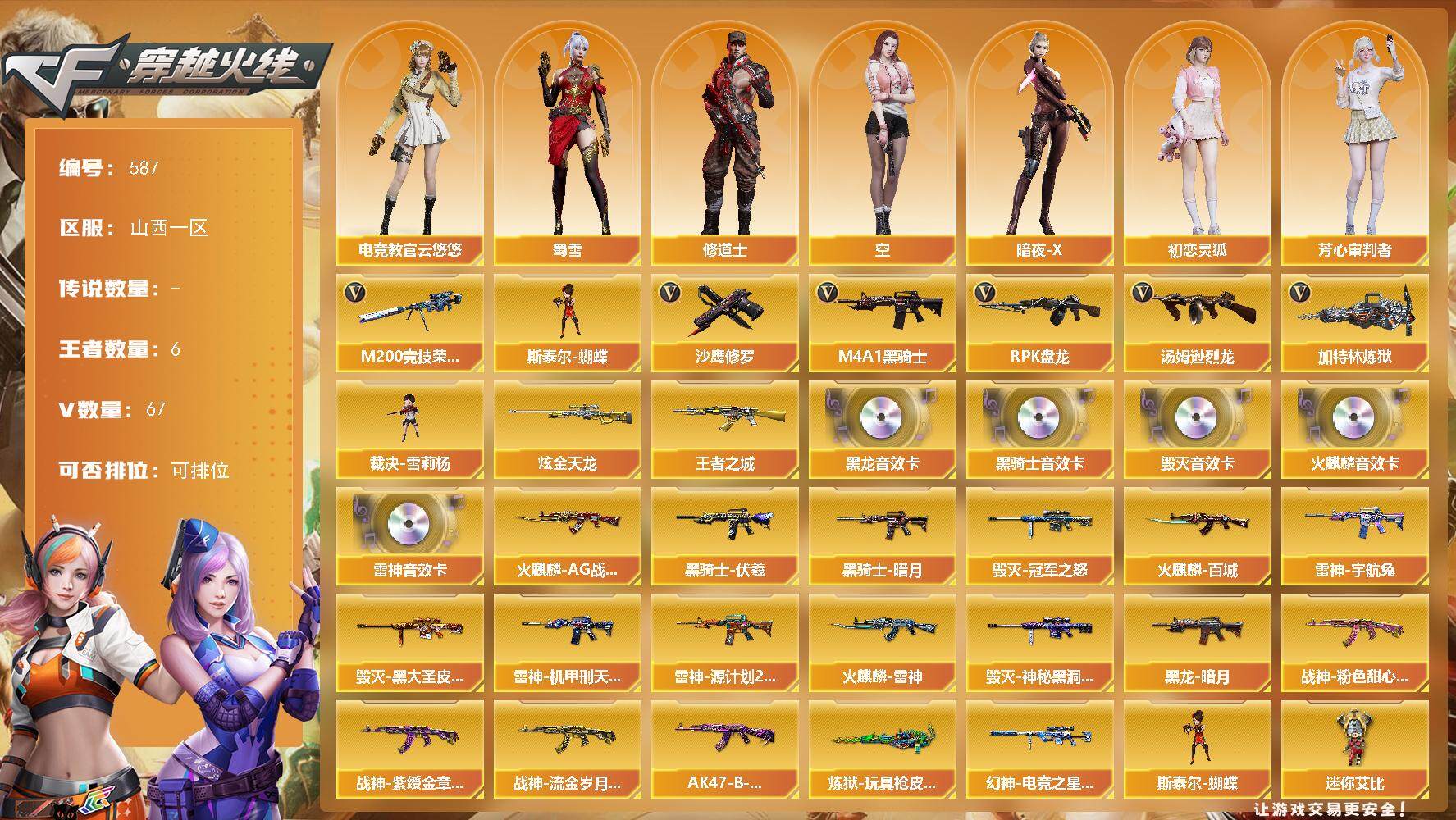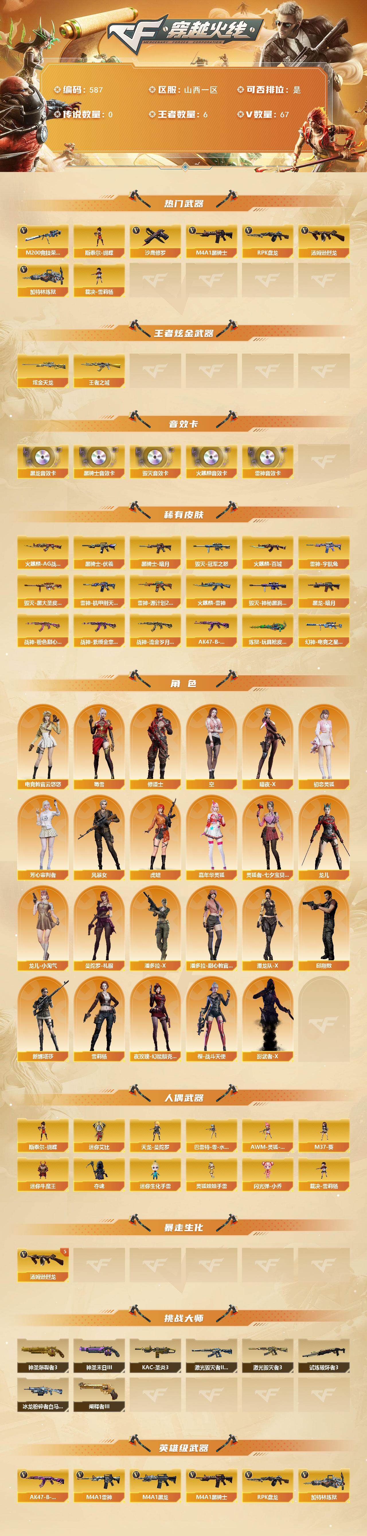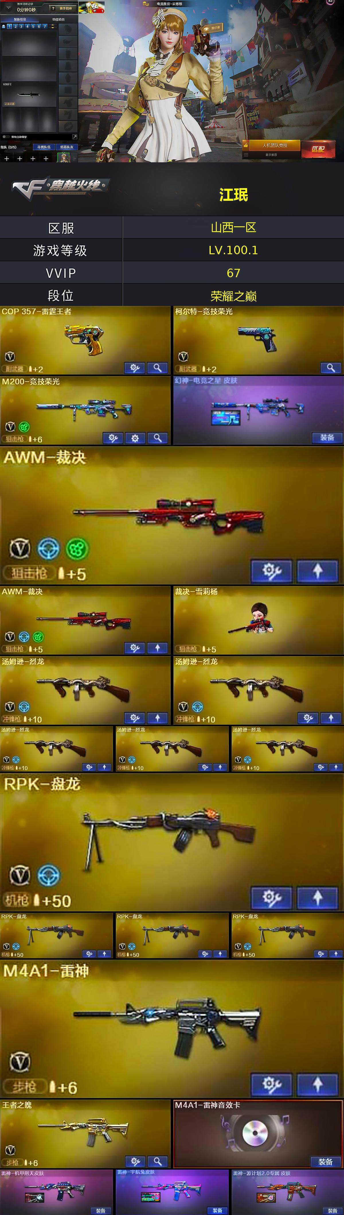山西一区-67v-6王者-1炫金 【热门武器】:m200-竞技荣光,m4a1-黑骑士,汤姆逊-烈龙5,rpk-盘龙4,加特林-炼狱,斯泰尔-蝴蝶,裁决-雪莉杨,沙鹰-修罗 【王者炫金武器】:王者之城,炫金天龙 【音效卡】:ak47-火麒麟音效卡,m4a1-雷神音效卡,m4a1-黑龙音效卡,m4a
