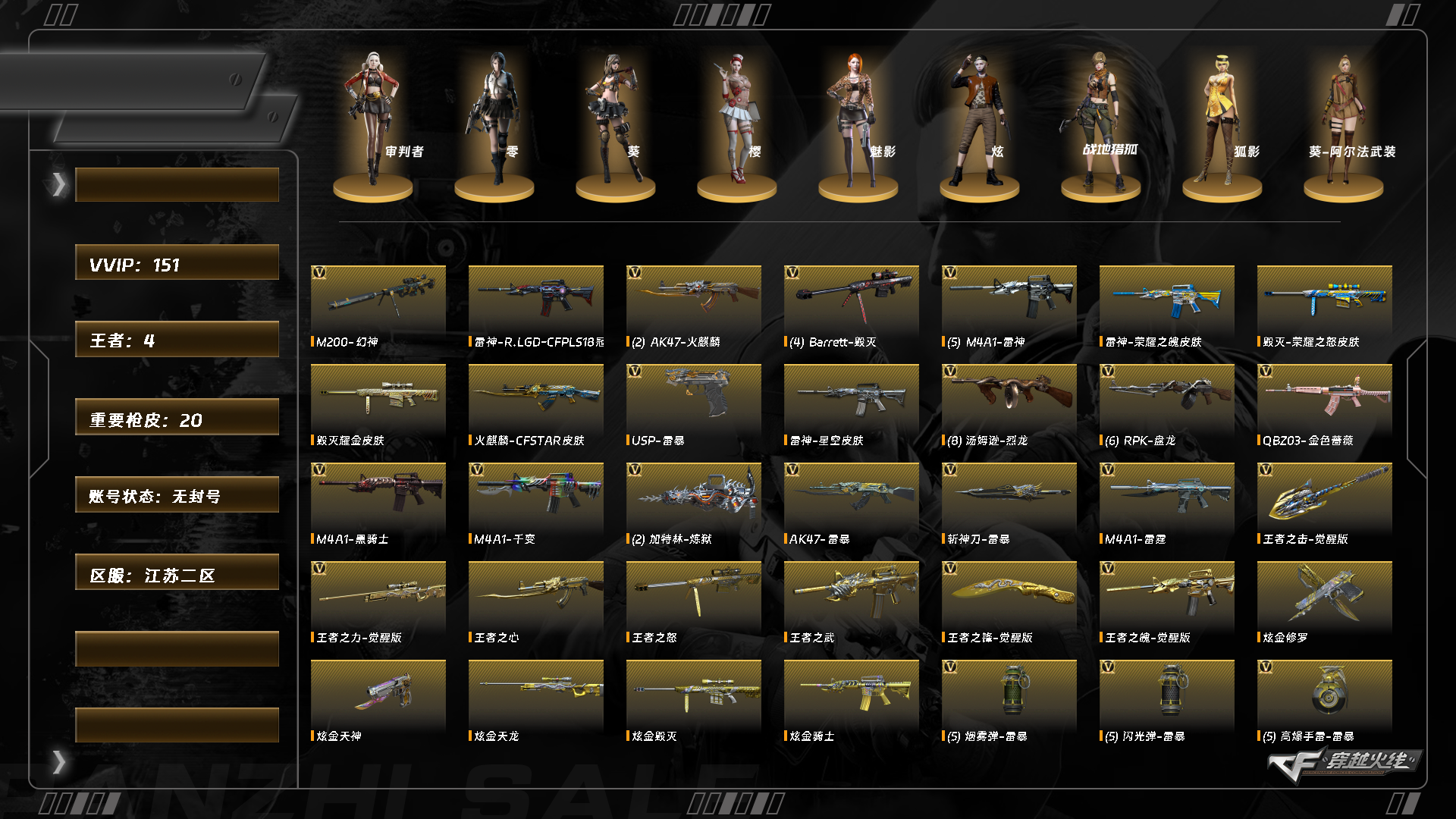 abc9449/东部/江苏二区/可排位/可二次/掌火id;/150v/幻神/幻神ag-cfpls24冠军/6盘龙/6烈龙/雷霆套/雷暴套/q金色蔷薇/白虎电玩蓝兔/火麒麟/雷神/无影/黑骑士/黑鲨/毁灭/王者之魄/王者之力/王者之锋/王者之击/王者之武/王者之心/王者之怒/炫金骑