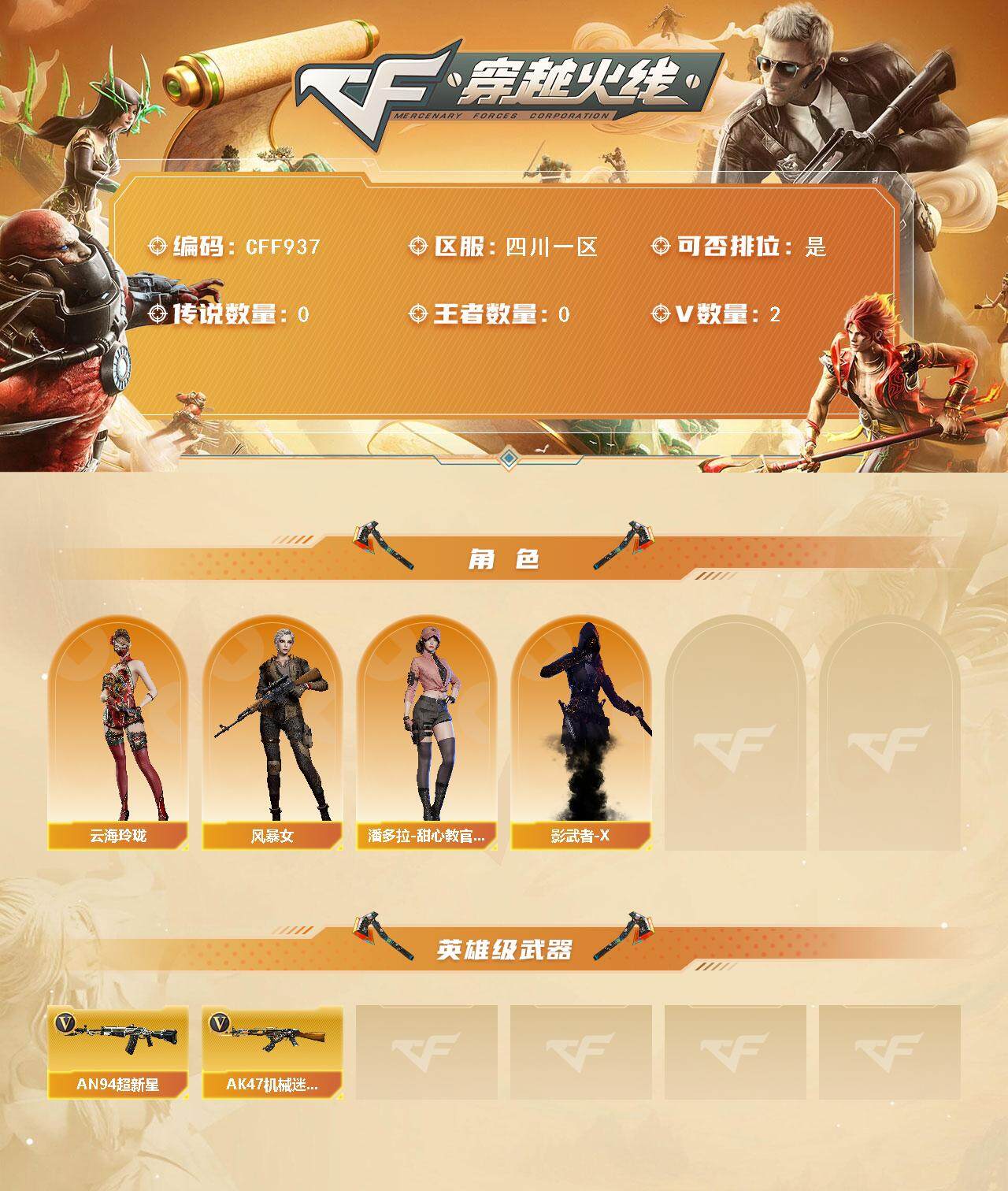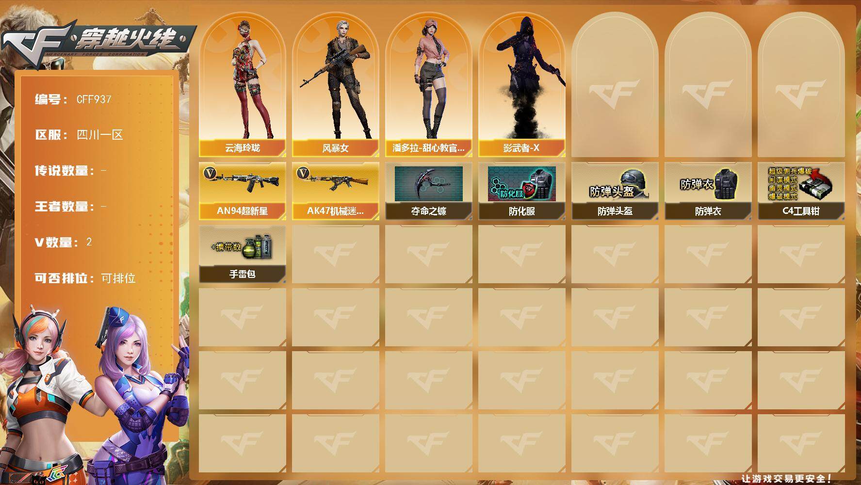 【cff937】2v/68级/校官/云海玲珑/风暴女/潘多拉-甜心教官/影武者-x/an94-超新星/ak47-机械迷城/夺命之镰/防化服/防弹头盔/防弹衣/c4工具钳/手蕾包