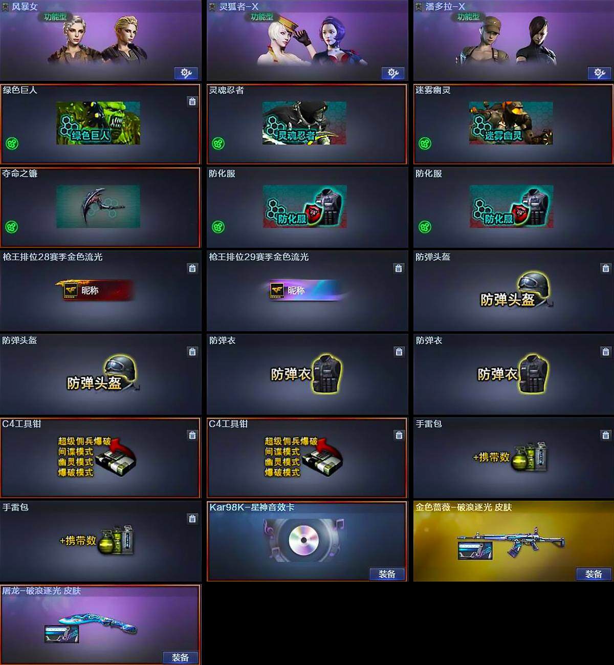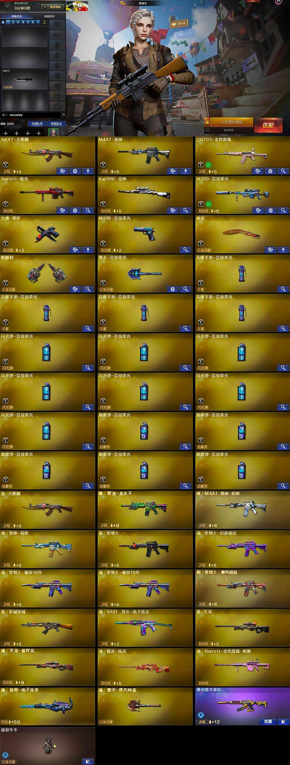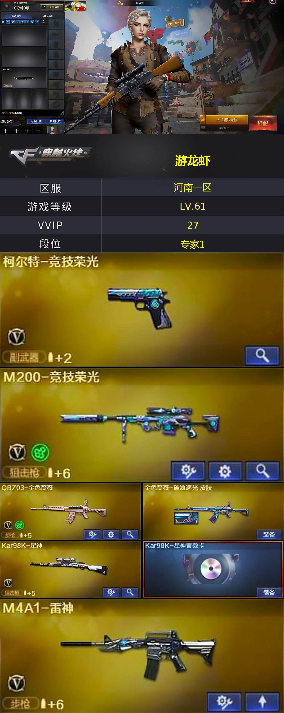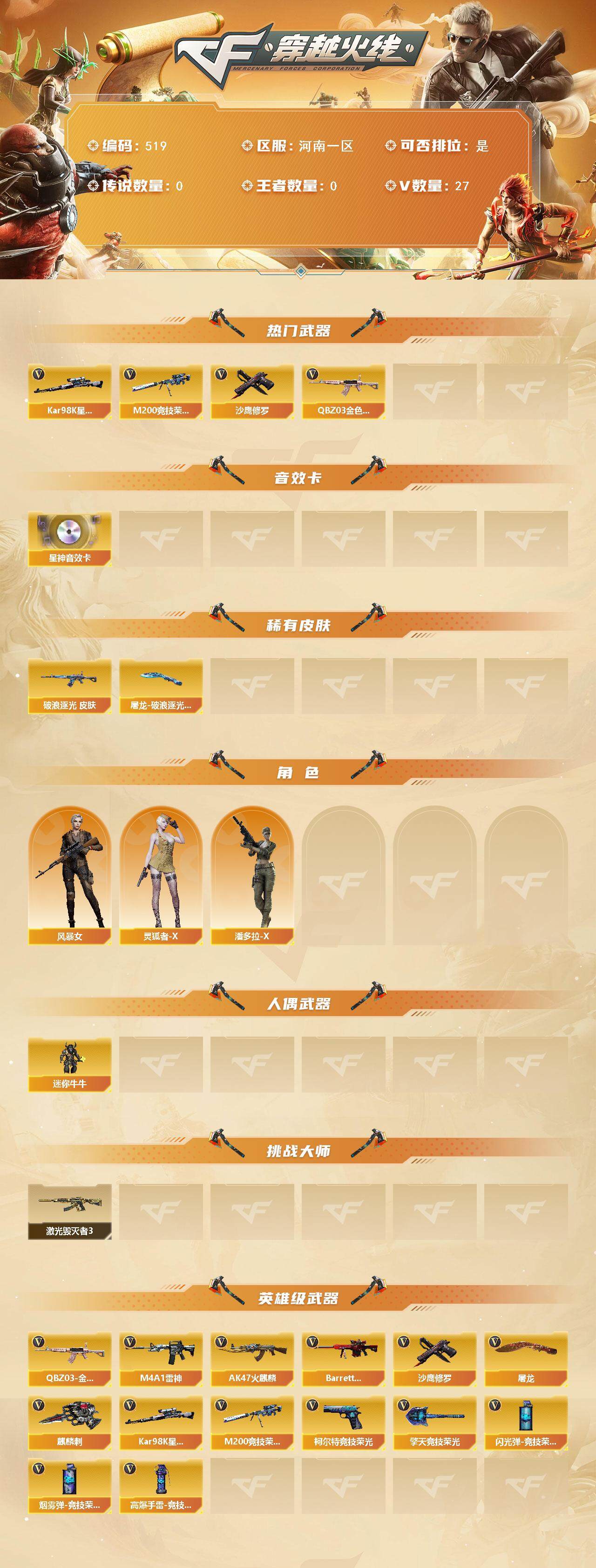 河南一区-27v-0王者-0炫金 【热门武器】:q03-金色蔷薇,m200-竞技荣光,kar98k-星神,沙鹰-修罗 【音效卡】:kar98k-星神音效卡 【皮肤】:金色蔷薇-破浪逐光 皮肤,屠龙-破浪逐光 皮肤 【角色】:风暴女,灵狐者-x,潘多拉-x 【人偶武器】:迷你牛牛 【挑战大师】:激