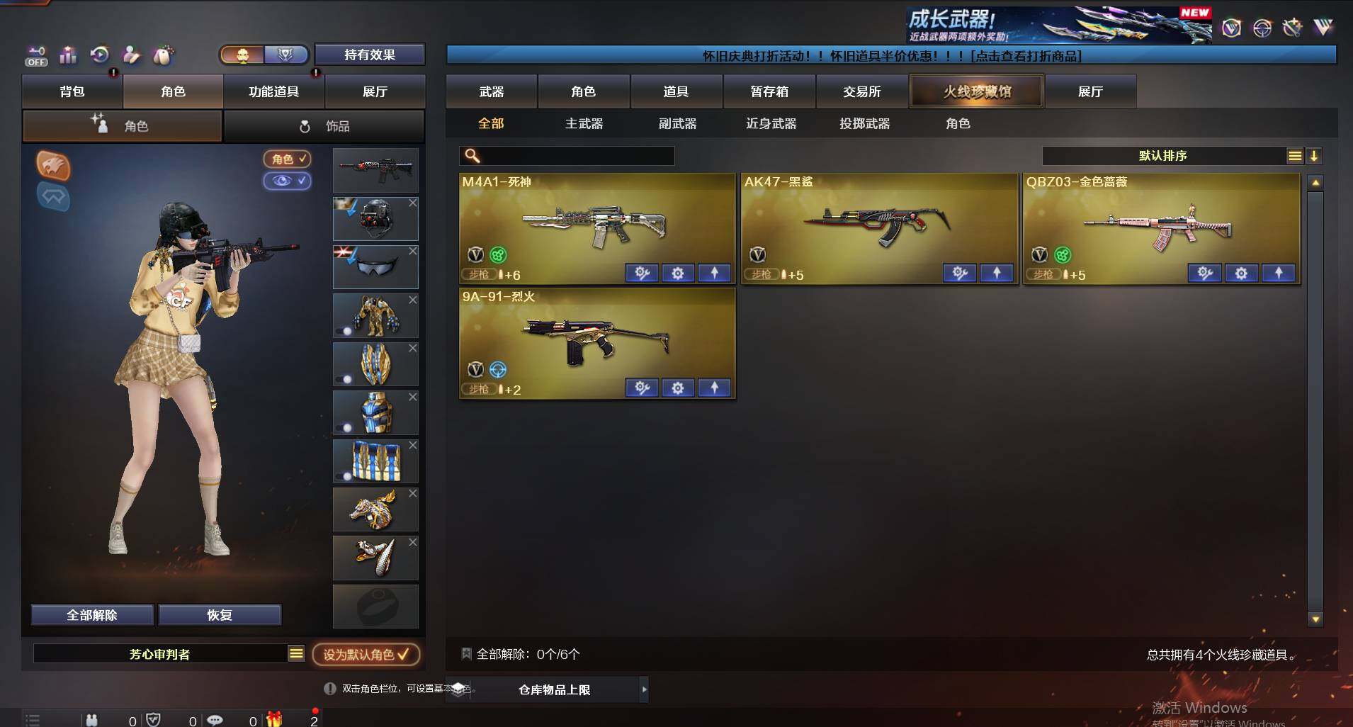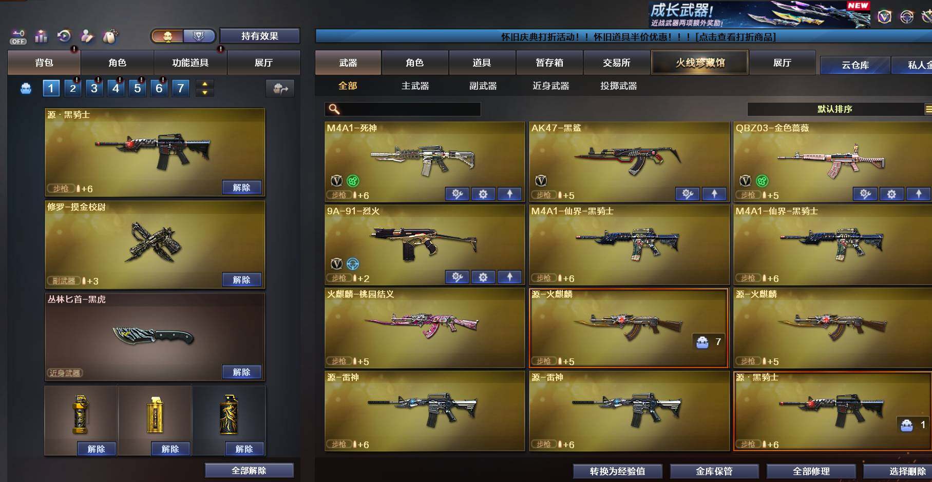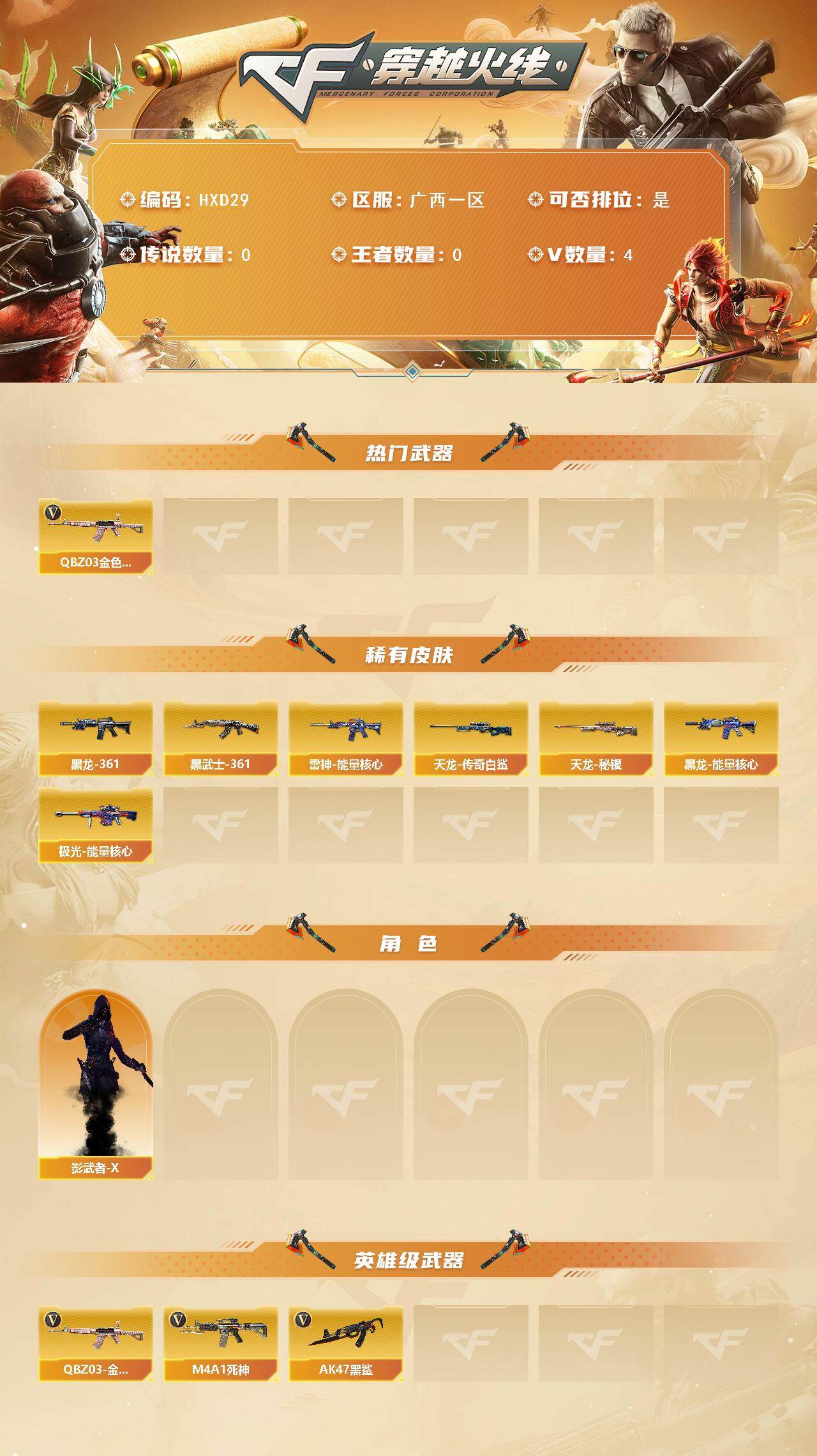 【hxd29】4v/78级/将帅/q03-金色蔷薇/雷神-能量核心/黑龙-能量核心/m4a1-黑龙-361/ak47-黑武士-361/天龙-秘银/awm-天龙-传奇白鲨/极光-能量核心/影武者-x/m4a1-死神/ak47-黑鲨/战舰背包/夺命之镰/防化服/防弹头盔/防弹衣/c4工具钳/手蕾包