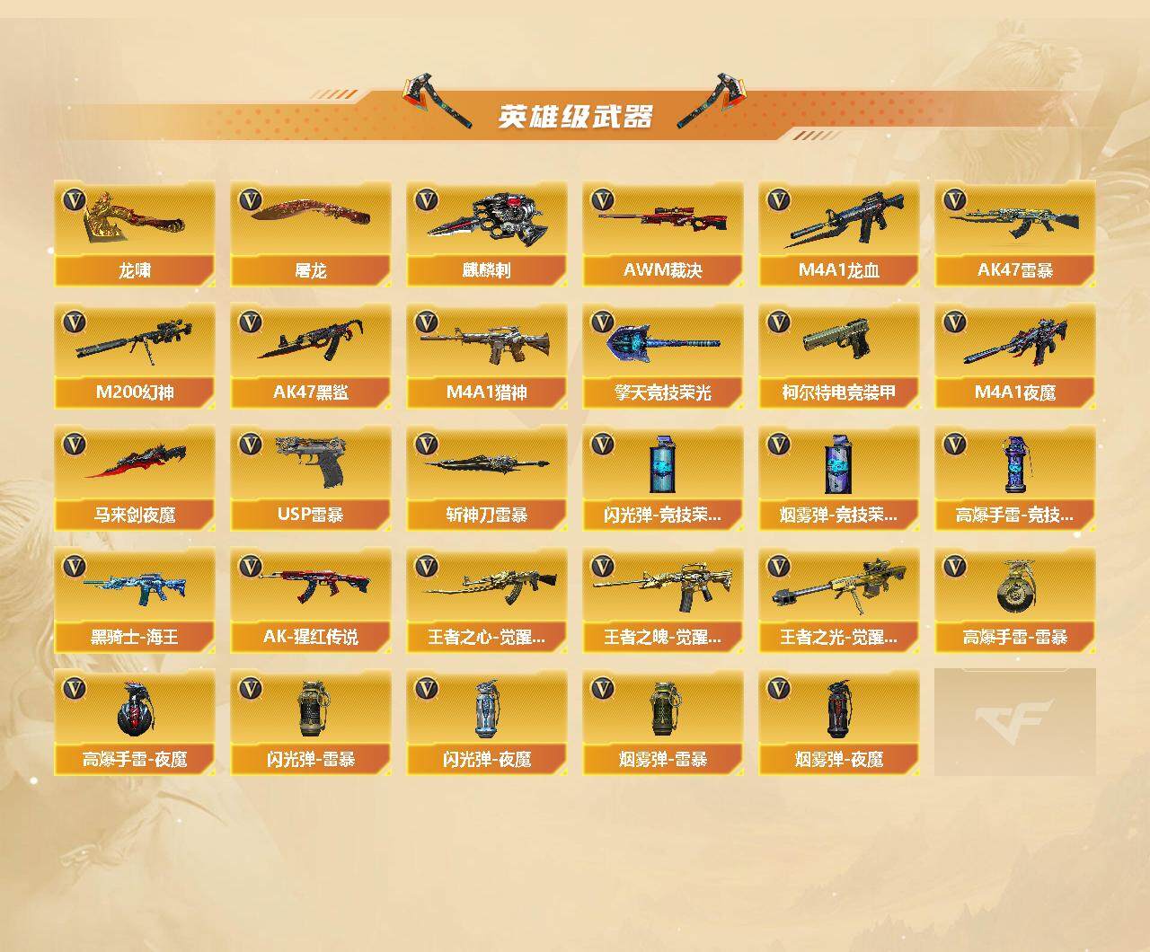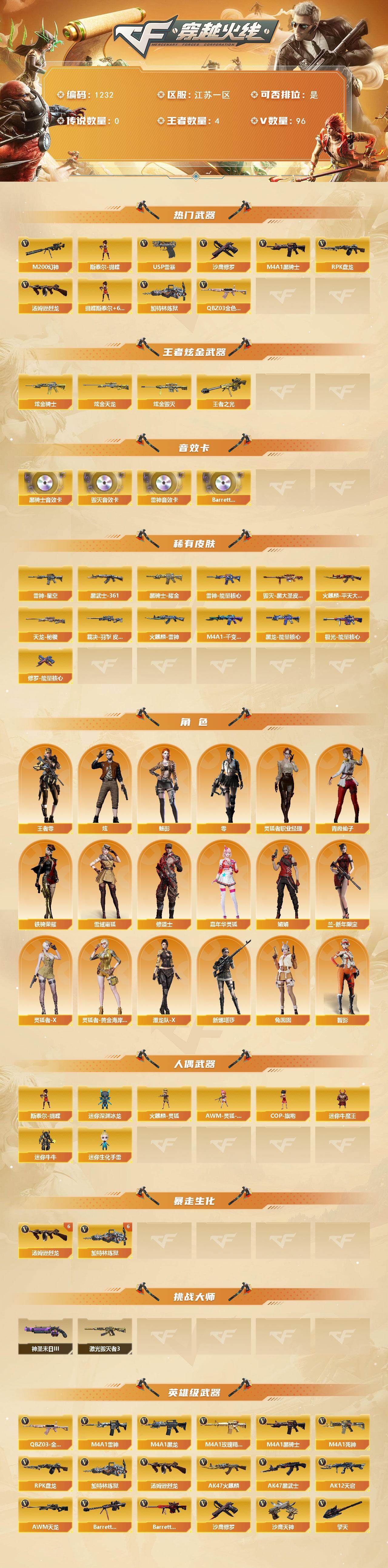 [15017492]江苏一区-96v-4王者-5炫金 【热门武器】:q03-金色蔷薇,m200-幻神,m4a1-黑骑士,汤姆逊-烈龙6,rpk-盘龙,加特林-炼狱6,斯泰尔-蝴蝶,usp-雷暴,沙鹰-修罗6 【王者炫金武器】:王者之光,炫金骑士,炫金毁灭3,炫金天龙 【音效卡】:m4a1-雷神音效卡,m4a1-黑骑士音效卡,barrett-毁灭音效卡,barrett-碧霄极光音效卡 【皮肤】:裁决-羽
