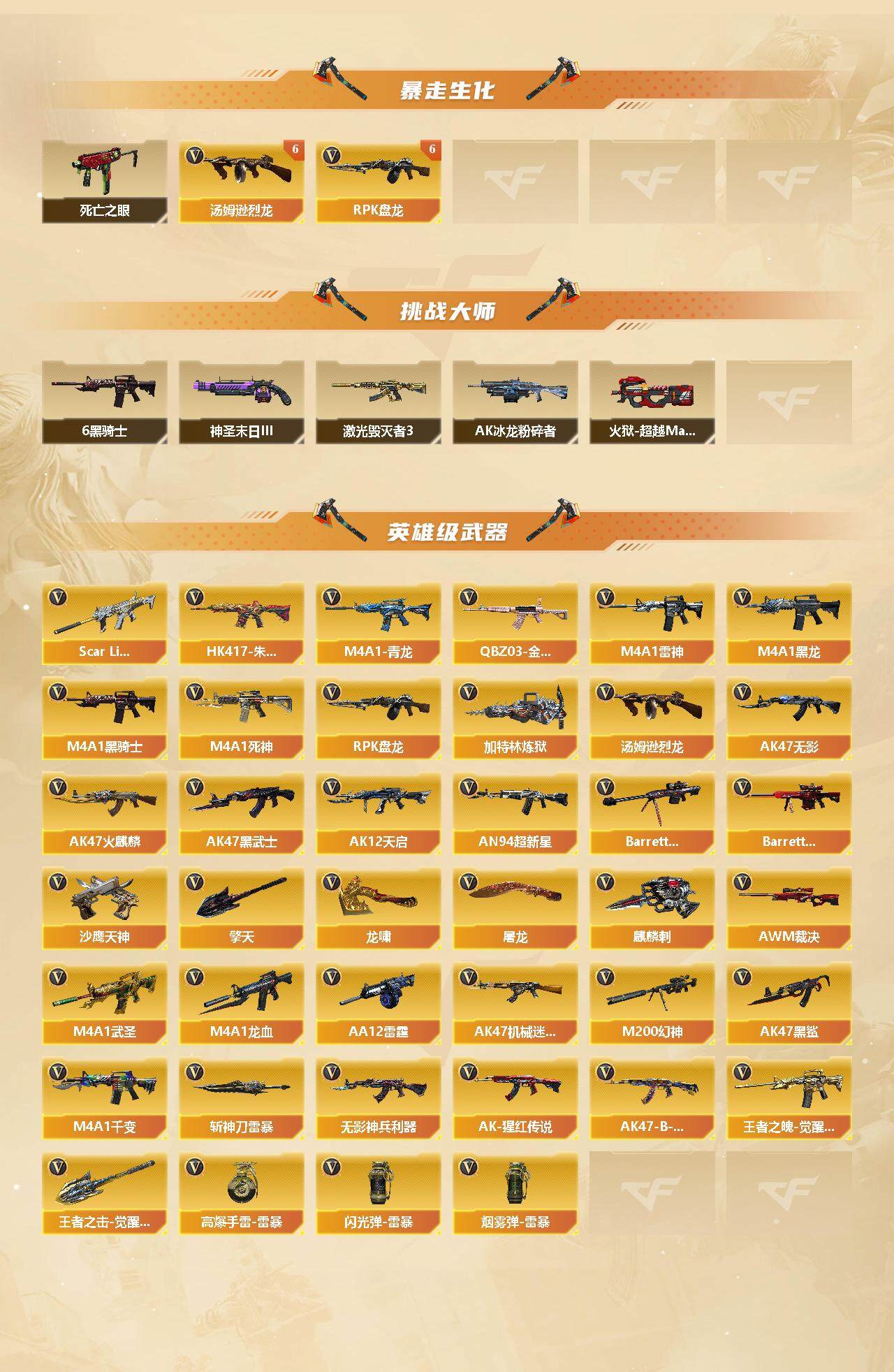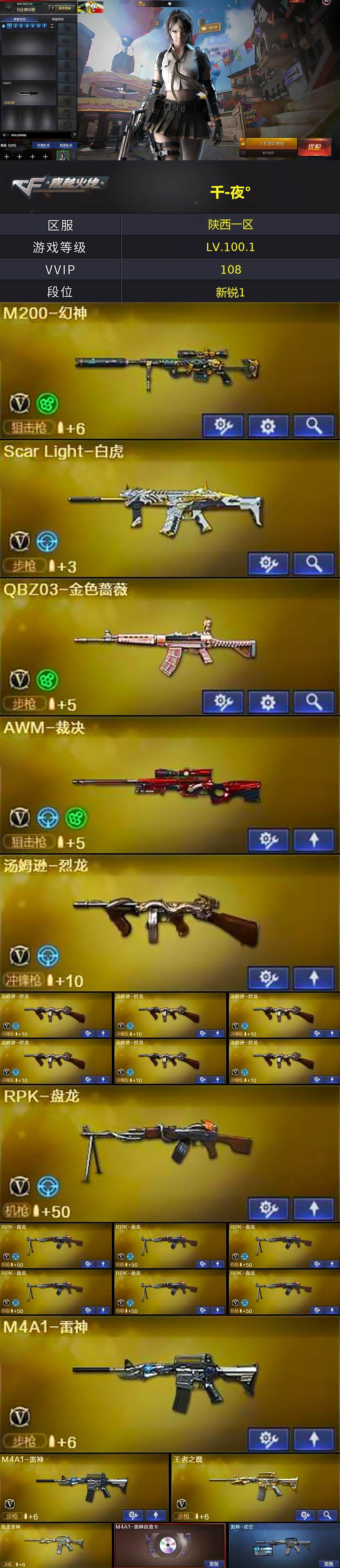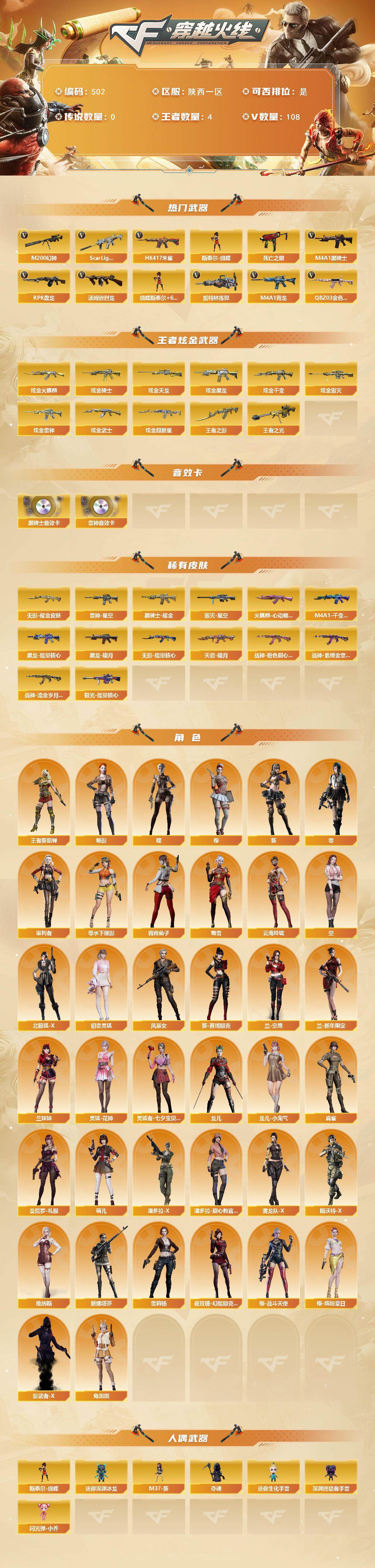 陕西一区-108v-4王者-10炫金 【热门武器】:q03-金色蔷薇,scar light-白虎,hk417-朱雀,m4a1-青龙,m200-幻神,死亡之眼2,m4a1-黑骑士6,汤姆逊-烈龙7,rpk-盘龙7,加特林-炼狱2,斯泰尔-蝴蝶 【王者炫金武器】:王者之影,王者之光,炫金火麒麟,炫金骑士,炫金黑龙,炫金千变,炫金雷神,炫金武士,炫金超新星2,炫金毁灭,炫金天龙 【音