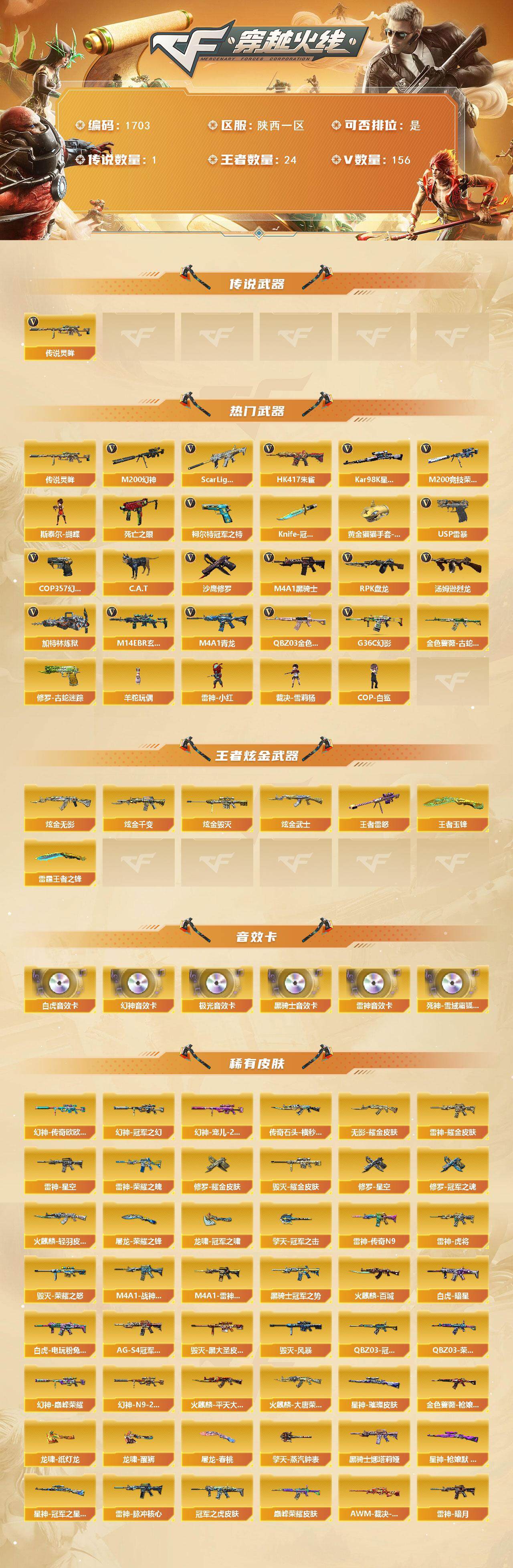 【1703】xg52417陕西一区-156v-24王者-4炫金 【传说武器】:传说灵眸 【热门武器】:传说灵眸,g36c-幻影,q03-金色蔷薇,m14ebr-玄武,scar light-白虎,hk417-朱雀,m4a1-青龙2,m200-幻神,金色蔷薇-古蛇迷踪,修罗-古蛇迷踪,m200-竞技荣光,死亡之眼,柯尔特-冠军之特,kar98k-星神,c.a.t,m4a1-黑骑士,汤姆逊-烈龙5,rpk-盘龙6,加特林-炼狱,斯泰尔-蝴蝶,羊驼玩偶,雷神-小红,裁决-雪莉杨,cop-白鲨,usp-雷暴,cop 357-幻灵3,沙鹰-修罗2,knife-冠军之刃,黄金猫猫手套-白鲨 【王者炫金武器】:王者雷怒,雷霆王者之锋,王者玉锋,炫金无影,炫金千变,炫金武士,炫金毁灭 【音效卡】:m200-幻神音效卡,m4a1-雷神音效卡,m4a1-黑骑士音效卡,barrett-极光音效卡,scar light-白虎音效卡,死神-雪域霜狐-怀旧音效卡 【皮肤】:幻神-冠军之幻,幻神-宠儿-2021mvp,幻神-巅峰荣耀,m200-幻神-n9-2022mvp,幻神-传奇欧欧 皮肤,scar light-白虎-暗星,白虎-电玩粉兔皮肤,scarlight-白虎-冠军之虎皮肤,q03-冠军之薇,金色蔷薇-呛娘阿敏 皮肤,q03-荣耀世冠白鲨,q03-巅峰荣耀皮肤,awm-裁决-凤灵皮肤,星神-璀璨皮肤,星神-呛娘默 皮肤,kar98k-星神-冠军之星皮肤,雷神-暗月,雷神-荣耀之魄,雷神-星空,m4a1-雷神-cfs 2019,雷神-虎将,雷神-耀金皮肤,雷神-传奇n9,m4a1-战神赵云,雷神-脉冲核心,雷神-维纳斯皮肤,火麒麟-轻羽皮肤,传奇石头-横秒之巅2,火麒麟-平天大圣,火麒麟-百城2,火麒麟-大唐荣光,毁灭-荣耀之怒,毁灭耀金皮肤,毁灭-黑大圣皮肤,毁灭-风暴,毁灭-纸鸢皮肤,毁灭-百城浙江 皮肤,毁灭-虹光风暴 皮肤2,毁灭-秦师 皮肤,m4a1-千变-孔明皮肤,黑龙-暗月,黑骑士-冠军之势,黑骑士-ag-s4冠军典藏,黑骑士-破浪10年皮肤,m4a1-黑骑士-娜塔莉娅 皮肤,黑骑士-破界 皮肤,无影耀金皮肤,死神-机甲核心皮肤,烈火-动感闪耀 皮肤,炼狱-玩具呛皮肤,炼狱-月 皮肤,修罗-能量核心,修罗耀金皮肤,修罗-星空,修罗-冠军之魂,天神-幻能朋克 皮肤,屠龙-荣耀之锋,屠龙-qq会员,屠龙-春桃 皮肤,龙啸-冠军之啸,龙啸-纸灯龙皮肤,龙啸-醒狮 皮肤,擎天-冠军之击,擎天-蒸汽钟表 皮肤,麒麟刺-萌杀皮肤,麒麟刺-月皮肤 【角色】:葵,影豹,电竞教官-云悠悠,鹰,荒漠琉璃,关小雨,晴雅,岚兮儿,隼,机械姬,司雨,战地猎狐,王者樱-热浪之夏,王者-零-国色天香,王者-葵-貂蝉,王者葵-惊若翩鸿,王者春,王者炫,王者凌霄,王者涂鸦,王者玲珑,王者影豹,王者-迷迭香,王者潘多拉,雪域霜狐,蛇隐宗,奇洋探员,云海玲珑,炽天使,空,北极狐-x,初恋灵狐,电竞少女,芳心审判者,飞虎队-x,风暴女,虎妞,嘉年华灵狐,荆棘玫瑰,葵-赛博朋克,猎狐者-追月,0号玩家,灵动武士,灵狐-花神,灵狐者-x,灵狐者-黄金海岸,灵狐者-七夕宝贝,灵狐者-职业经理,龙儿-小淘气,麻雀,曼陀罗-x,玫瑰花神,萌儿,娜塔莉娅,潘多拉-x,潘多拉-甜心教官,潜龙队-x,青霞仙子,蛇姬,斯沃特-x,甜心偶像,蜀雪,兔囡囡,维纳斯,新娜塔莎,雪莉杨-摸金校尉,夜玫瑰-幻能朋克,夜玫瑰-宠粉,樱-战斗天使,幽,游珑儿 【人偶武器】:雷神-小红,cop-白鲨,裁决-雪莉杨,星神-炽天使,火麒麟-灵狐,迷你宝贝,迷你律动酷熊,斯泰尔-蝴蝶,cop-旗袍,c.a.t,迷你波特博士,夺魂,迷你生化手蕾,生化手蕾-机甲核心2,深渊终结者手蕾,灵狐娃娃手蕾 【暴走生化】:死亡之眼,超级对讲机 【挑战大师】:神圣爆裂者iii,激光毁灭者iii-白马银呛,机甲撕裂者iii,试炼破坏者iii,kac-圣炎切割者iii 【英雄级武器】:m4a1-千变,ak47-火麒麟,ak47-麒麟,m4a1-黑龙,m4a1-雷神,m4a1-黑骑士,ak47-无影,m4a1-死神,ak47-黑武士,ak12-天启,an94-超新星,ak47-机械迷城,ak47-黑鲨,m4a1-龙血,m4a1-青龙2,hk417-朱雀,scar light-白虎,m4a1-幻灵,m14ebr-玄武,g36c-幻影,黑武士-锦绣游龙,超新星-热带奇洋,金色蔷薇-古蛇迷踪,死神-雪域霜狐,m4a1-玫瑰精灵,q03-金色蔷薇,m4a1-猎神,王者之翼-觉醒版,王者之魄-觉醒版,王者之势-觉醒版,王者炎心-觉醒版,王者之烈-觉醒版,m4a1-雷霆王者-觉醒版,q-03-王者蔷薇-觉醒版,王者芳薇-觉醒版,awm-天龙,barrett-毁灭,barrett-极光,awm-裁决,m200-幻神,kar98k-星神,m200-竞技荣光,barrett-金色蔷薇,王者之怒-觉醒版,王者之力-觉醒版,王者风神-觉醒版,rpk-盘龙6,加特林-炼狱,炼狱-悦蓝-觉醒版,悦蓝-惊涛骇浪-觉醒版,汤姆逊-烈龙5,烈龙-云海游龙,烈龙-悦心-觉醒版,aa-12-雷霆,沙鹰-修罗2,沙鹰-天神2,usp-雷暴,cop 357-雷霆王者-觉醒版,cop 357-幻灵3,柯尔特-冠军之特,柯尔特-竞技荣光,修罗-云海游龙,修罗-古蛇迷踪,屠龙,龙啸,擎天,麒麟刺,幻灵之锋,擎天-竞技荣光,擎天-云海游龙,龙啸-热带奇洋,斩神刀-雷暴,屠龙-云海游龙,王者之锋-觉醒版,王者之啸-觉醒版,王者之刺-觉醒版,高爆手蕾-雷霆,高爆手蕾-雷暴4,高爆手蕾-幻灵9,高爆手蕾-竞技荣光8,手蕾-云海游龙,手蕾-热带奇洋,高爆手蕾-古蛇迷踪,闪光丹-雷霆2,闪光丹-雷暴6,闪光丹-幻灵7,闪光丹-竞技荣光10,闪光丹-云龙,闪光丹-雷霆王者-觉醒版,盐雾蛋-雷霆,盐雾蛋-雷暴4,盐雾蛋-幻灵7,盐雾蛋-竞技荣光9,盐雾蛋-云龙,盐雾蛋-古蛇迷踪,盐雾蛋-雷霆王者-觉醒版,m4a1-赤狱骑士 【道具】:喜狮迎春背包,cfs限定背包,edg炫彩背包,qq会员专属背包,云山科技背包,云海游龙炫彩背包,亚洲杯纪念炫彩背包,古蛇迷踪炫彩背包,奇洋探员-海龟背包,战舰背包,次元之矛-黄金背包,热带奇洋炫彩背包,老虎背包,背包-洛丽塔,虎牙炫彩背包,超级背包,雪域霜狐炫彩背包,女皇终结者-魔龙之吻,救世主-黑桃战神,黄金生化钩,绿色巨人,灵魂忍者2,变异宝贝,迷雾幽灵3