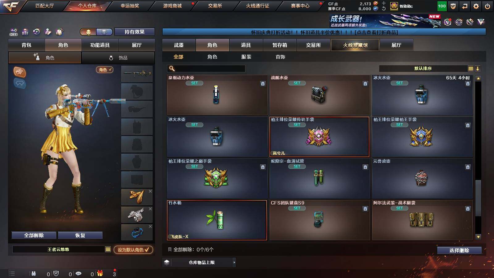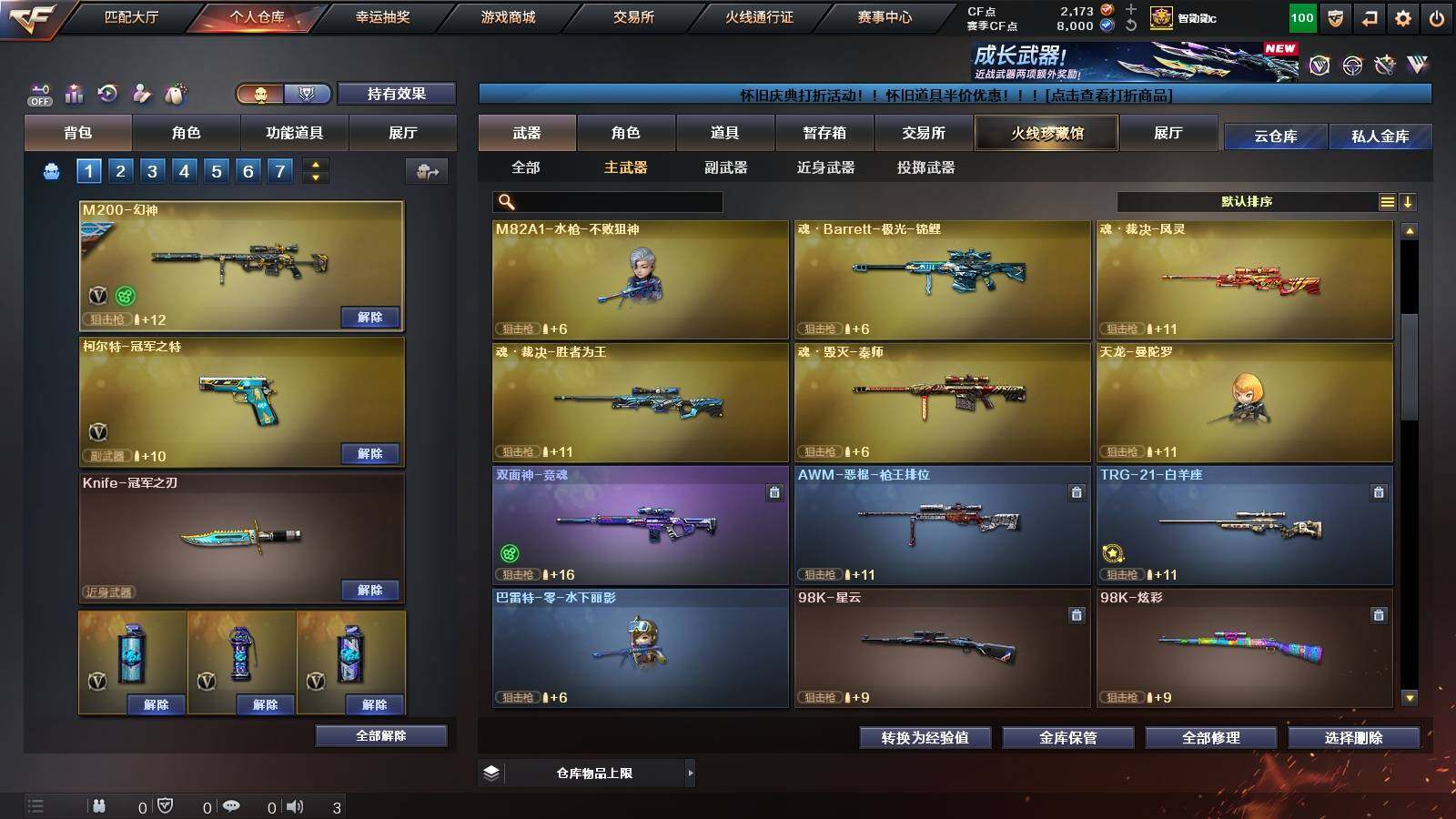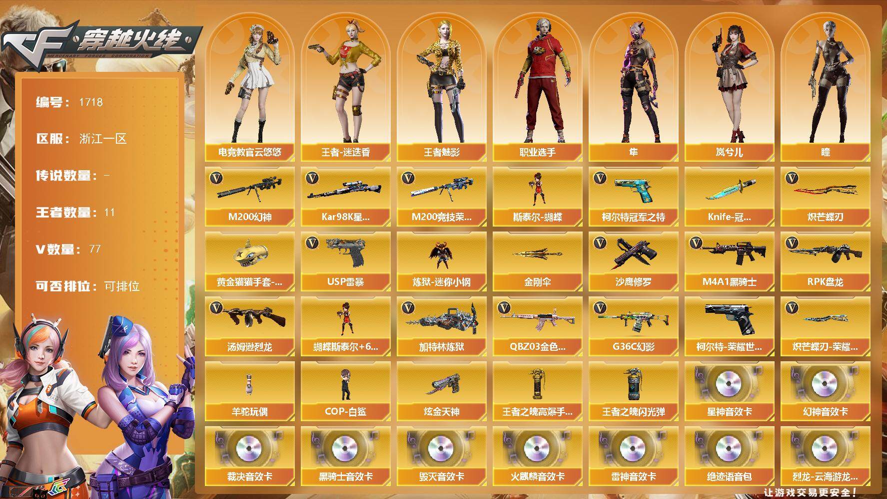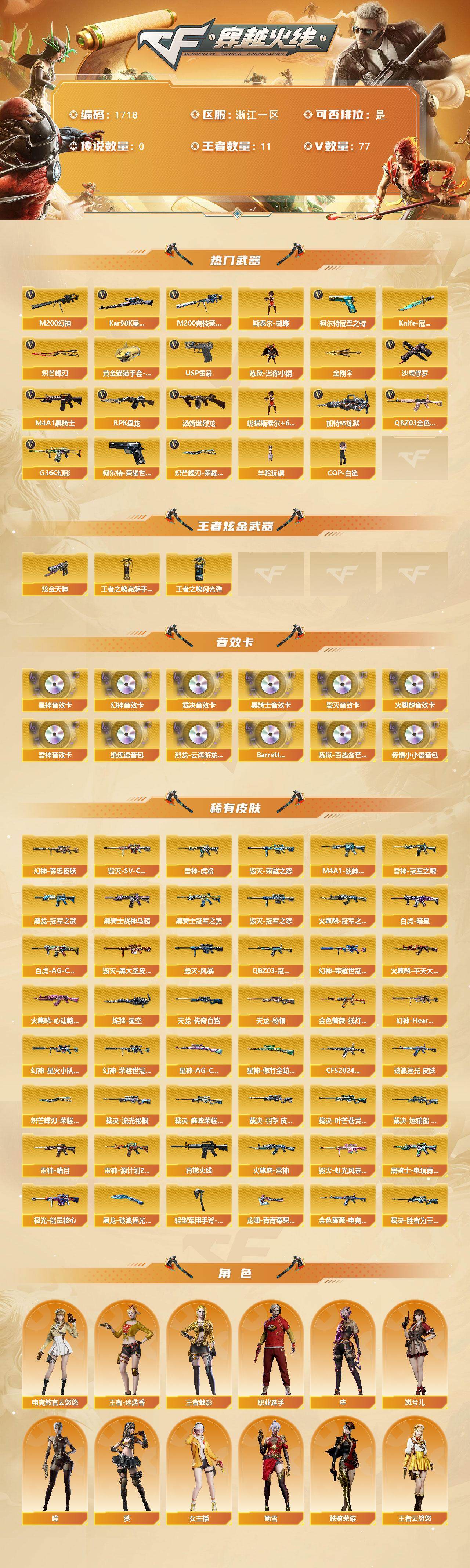 【1718】伊41408可排位-可二次【浙江一区/77v/vip6】【爆破生化全能/幻神三件套5皮肤/裁决三件套6皮服/星神三件套2皮肤/6烈龙蝴蝶/6盘龙炼狱小钢/竞技荣光套/10手呛质量拉满/5四防角色/多张音效卡/蝴蝶刀带皮/主流武器都带皮】【m200-幻神/m200-幻神音效卡/幻神-星火小队签名臻藏版 皮肤/m200-幻神-荣耀世冠白鲨/m200-幻神-黄忠皮肤/幻神-heartshot 皮肤/幻神-荣耀世冠白鲨2023 皮肤】【kar98k-星神/kar98k-星神音效卡】【awm-裁决/awm-裁决音效卡/裁决-巅峰荣耀 皮肤/羽掣 皮肤/流光秘银/胜者为王/叶芒苍灵/运输船】【m200-竞技荣光】【白虎之魄】【g36c-幻影】【炽芒蝶刃/炽芒蝶刃-荣耀世冠白鲨2023 皮肤】【knife-冠军之刃/黄金猫猫手套-白鲨】【usp-冥王/柯尔特-冠军之特/柯尔特-竞技荣光/usp-雷暴2/柯尔特-荣耀世冠白鲨2023】【scar light-白虎-暗星/白虎-ag-cfpls20冠军】【q03-金色蔷薇/q03-金色蔷薇音效卡/q03-cfs2024 皮肤/q03-冠军之薇/金色蔷薇-纸灯龙皮肤/金色蔷薇-破浪逐光 皮肤】【隼】【q03-天罚】【m4a1-雷神/m4a1-雷神音效卡/m4a1-雷神-白鲨皮肤/雷神-冠军之魄/m4a1-战神赵云/雷神-暗月/雷神-虎将】【glock18-武圣/雷霆之契】【barrett-毁灭/barrett-毁灭音效卡/毁灭-荣耀之怒/毁灭-冠军之怒/毁灭-sv-cfpls16冠军/毁灭-风暴/毁灭-虹光风暴 皮肤】【ak47-火麒麟/ak47-火麒麟音效卡/火麒麟-冠军之心/火麒麟-心动糖果/火麒麟-雷神/火麒麟-平天大圣】【m4a1-黑骑士/m4a1-黑骑士音效卡/黑骑士-冠军之势/黑骑士-战神马超/黑骑士-电玩青兔皮肤】【m4a1-黑龙/黑龙-冠军之武】【黑武士-锦绣游龙】【awm-天龙/awm-天龙-传奇白鲨/天龙-秘银】【barrett-极光/barrett-极光音效卡/极光-能量核心】【m4a1-死神】【汤姆逊-烈龙6/烈龙-云海游龙音效卡】【rpk-盘龙6】【加特林-炼狱/炼狱-星空】【斯泰尔-蝴蝶/迷你生化手蕾】【沙鹰-修罗/修罗-cfstar】【沙鹰-天神】【麒麟刺】【擎天/擎天-竞技荣光