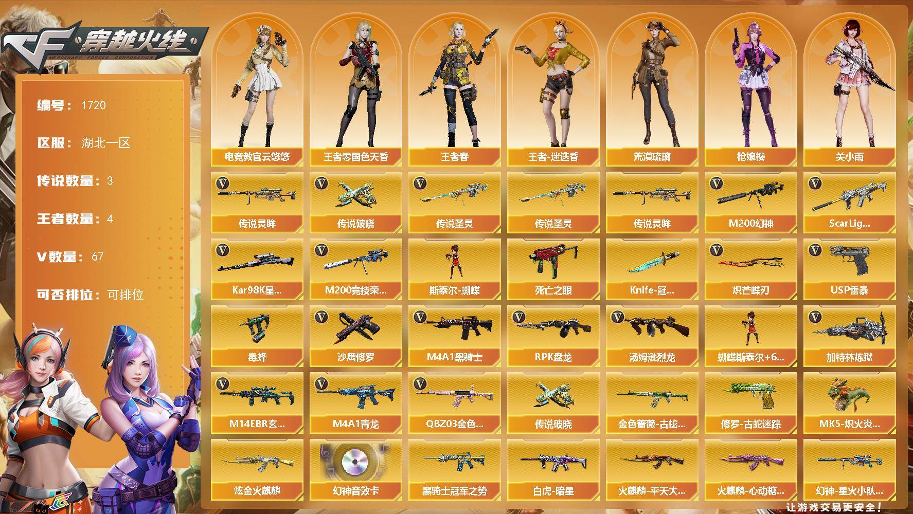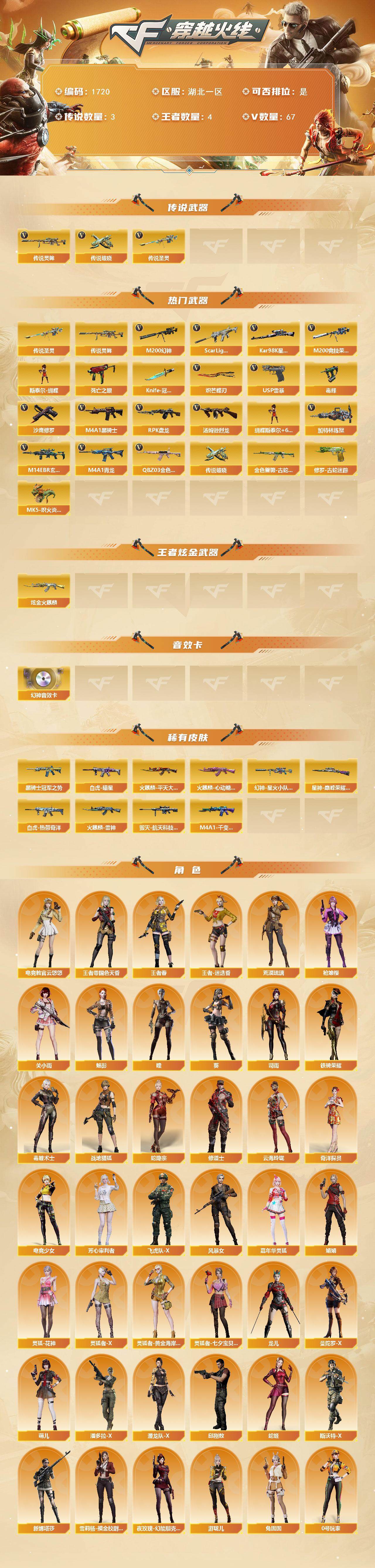 【1720】伊15508可排位-可二次【湖北一区/81v/vip6/3传说】【无十年/生化挑战爆破号/传说圣灵/传说灵眸/传说破晓/幻神三件套/6烈龙蝴蝶清道夫毒蜂/6盘龙/6黑骑士/臻选次元套擎天柱/8四防角色/生化角色毒蝰术士/星神带皮/2把蝴蝶刀/竞技荣光套】【m200-幻神/m200-幻神音效卡/幻神-星火小队签名臻藏版,皮肤】【m200-竞技荣光】【kar98k-星神/星神-巅峰荣耀,皮肤】【炽芒蝶刃2】【knife-冠军之刃】【柯尔特-竞技荣光/usp-雷暴】【scar,light-白虎/scar,light-白虎-暗星/白虎-热带奇洋,皮肤】【q03-金色蔷薇】【荒漠琉璃】【m4a1-雷神】【毁灭-航天科技皮肤】【ak47-火麒麟/火麒麟-cfstar/火麒麟-心动糖果/火麒麟-雷神/火麒麟-平天大圣2】【m4a1-黑骑士6/黑骑士-冠军之势】【无影-神兵利器】【黑武士-锦绣游龙】【awm-裁决】【m4a1-千变-孔明皮肤2】【汤姆逊-烈龙6/烈龙-云海游龙】【rpk-盘龙6】【加特林-炼狱2】【斯泰尔-蝴蝶/死亡之眼/迷你生化手蕾2】【沙鹰-修罗】【麒麟刺】【擎天-云海游龙/擎天-竞技荣光】【屠龙】【龙啸-烈火龙威】【电竞教官-云悠悠/王者春/呛娘樱/关小雨/王者-迷迭香/王者-零-国色天香/魅影/龙儿/司雨/木兰/奇洋探员/云海玲珑/修道士/兔囡囡/超能特工/灵狐-花神/萌儿/灵狐者-黄金海岸/妲己/娟娟/潘多拉-x/斯沃特-x/铁骑荣耀/新娜塔莎/幻影/堕天使/复仇者】【m14ebr-玄武/m4a1-青龙/m4a1-武圣】【ak-47-猩红传说】【aa-12-雷霆】【an94-超新星/超新星-热带奇洋】【colt1911-小故障/新usp-呛王排位奖励2】【龙啸-热带奇洋/迷你深渊冰龙6】【神圣爆裂者iii/机甲撕裂者iii2/vepr-12-金魔/vepr-12-紫魔/kac-圣炎切割者iii/激光毁灭者iii-白马银呛2/激光毁灭者iii2/冰龙粉碎者-白马银呛2/巨龙咆哮-深渊蓝2/阐释者iii】【异变清道夫/异变清道夫/轻型军用手斧-镜2】【猫猫手套/黄金迷你深渊冰龙/黄金迷你裂空之翼/迷你裂空之翼4/夺魂2/mk5-炽火炎龙】【王者芳薇/王者之戮/王者之啸】【高爆手蕾-竞技荣光/闪光丹-竞技荣光/盐雾蛋-竞技荣光】【高爆手蕾-云龙/闪光丹-云龙/盐雾蛋-云龙/手蕾-云海游龙】【高爆手蕾-幻灵/闪光丹-幻灵/盐雾蛋-幻灵】【手蕾-热带奇洋】【炫金火麒麟】【语音特效-云海游龙/语音特效-生化/语音特效-机器人】【超级护目镜/烟雾保护头盔/闪光护目镜/超级对讲机/超级背包/炫彩背包/防弹头盔9/防弹衣8/c4工具钳7/手蕾包6/防化服3】截图展示段位不代表实际段位,如赛季更新等不/拒因素发生变化、时限道具不保证所剩时间 1550809979 4470 【稀有套装】:幻神三件套