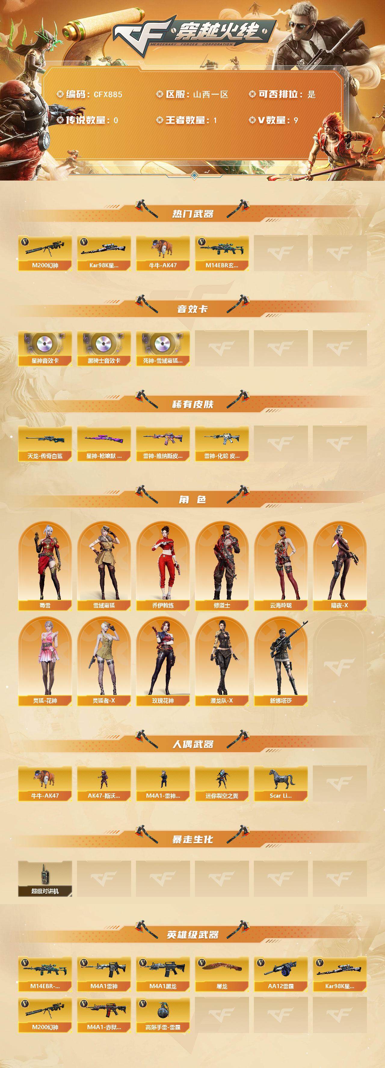 【cfx885】9v/87级/将帅/1王者/m14ebr-玄武/m200-幻神/kar98k-星神/牛牛-ak47/m4a1-黑骑士音效卡/kar98k-星神音效卡/死神-雪域霜狐-怀旧音效卡/星神-呛娘默 皮肤/雷神-维纳斯皮肤/雷神-化蛇 皮肤/awm-天龙-传奇白鲨/雪域霜狐/乔伊教练/修道士/云海玲珑/暗夜-x/灵狐-花神/灵狐者-x/玫瑰花神/潜龙队-x/蜀雪/新娜塔莎/m4a1-雷神-精英刀锋/scar light-马呛/迷你裂空之翼/ak47-斯沃特/超级对讲机/m4a1-黑龙/m4a1-雷神/aa-12-雷霆/屠龙/高爆手蕾-雷霆/m4a1-赤狱骑士/亚洲杯纪念炫彩背包/炫彩背包-诺拉/炫彩背包/背包-洛丽塔/虎牙炫彩背包/雪域霜狐炫彩背包/救世主-黑桃战神/绿色巨人/灵魂忍者/迷雾幽灵/夺命之镰/防化服/流光-再燃火线/呛王排位29赛季金色流光/语音特效-怀旧/雪域霜狐表情/电玩兔兔表情/斯沃特表情/防弹头盔/防弹衣/c4工具钳/手蕾包