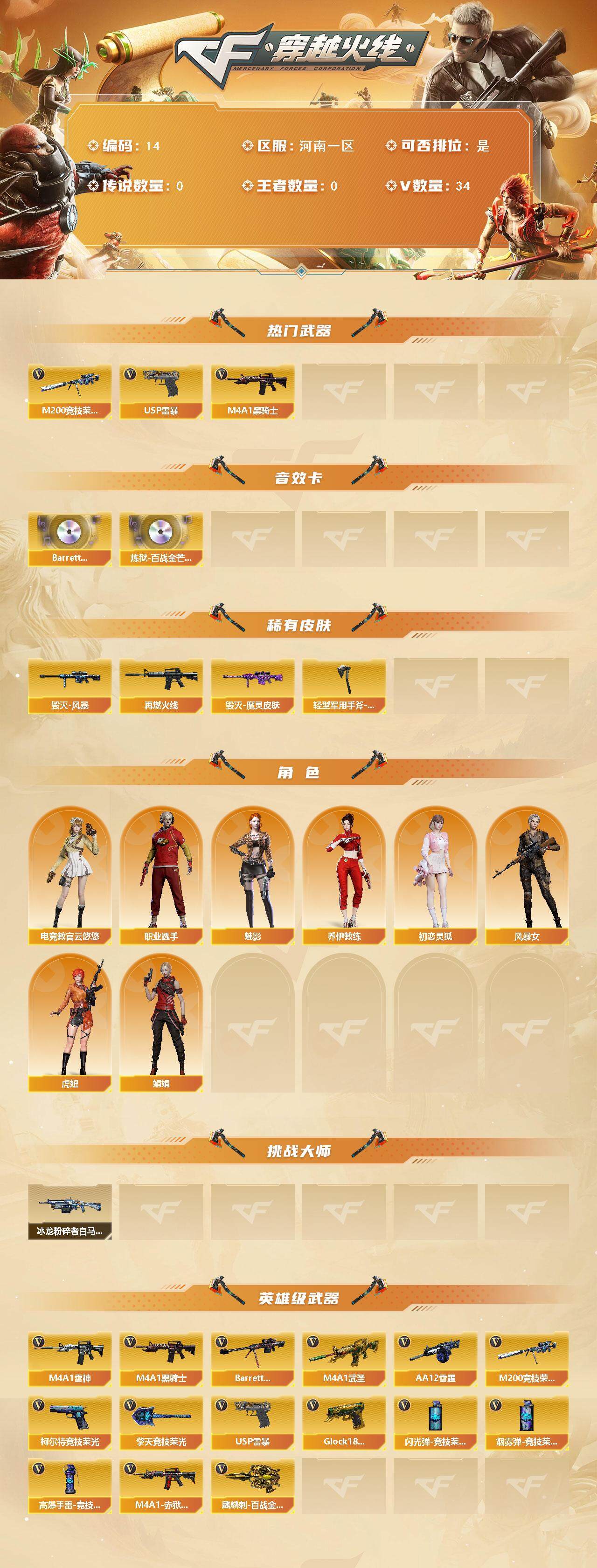 【等级】83【区服】河南一区【英雄角色】3【英雄武器】31【英雄级角色】魅影 电竞教官-云悠悠 幻面灵狐 葵-阿尔法武装【英雄级武器】m4a1-再燃火线 麒麟刺-百战金芒 m4a1-武圣 glock18-武圣 m4a1-雷神 aa-12-雷霆 m4a1-黑骑士 barrett-毁灭 盐雾蛋-竞技荣光 usp-雷暴 盐雾蛋-竞技荣光 高爆手蕾-竞技荣光 闪光丹-竞技荣光 高爆手蕾