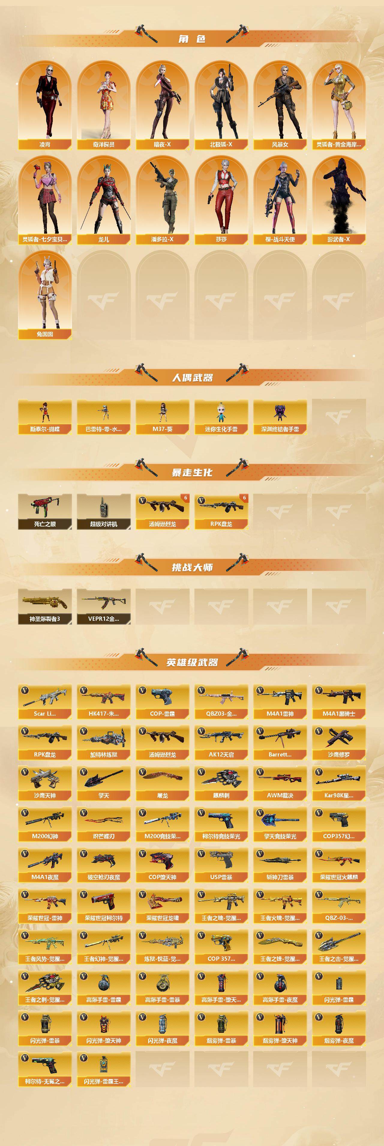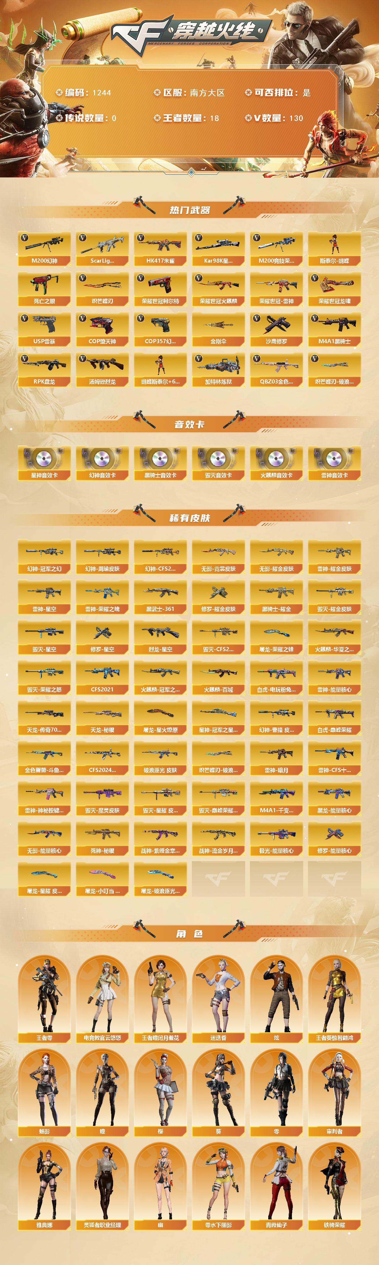 南方大区-130v-18王者-0炫金 【热门武器】:q03-金色蔷薇2,scar light-白虎,hk417-朱雀,m200-幻神,m200-竞技荣光,死亡之眼,荣耀世冠-火麒麟,荣耀世冠-雷神,荣耀世冠-柯尔特,kar98k-星神,m4a1-黑骑士,汤姆逊-烈龙7,rpk-盘龙6,加特林-炼狱,斯泰尔-蝴蝶,usp-雷暴2,cop-堕天神3,cop 357-幻灵,沙鹰-修罗