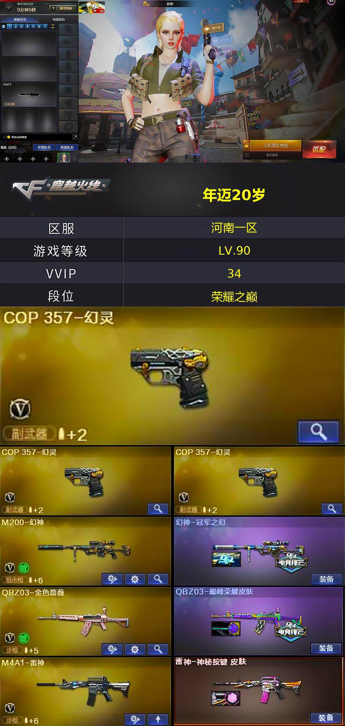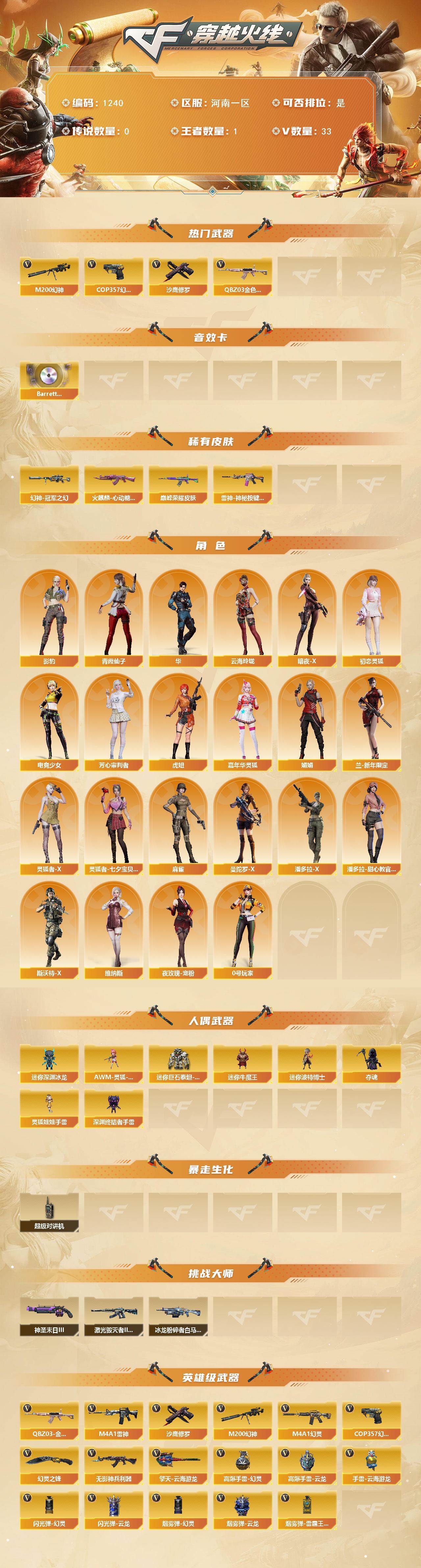 河南一区-33v-1王者-0炫金 【热门武器】:q03-金色蔷薇,m200-幻神,cop 357-幻灵3,沙鹰-修罗3 【音效卡】:barrett-碧霄极光音效卡 【皮肤】:幻神-冠军之幻,q03-巅峰荣耀皮肤,雷神-神秘按键 皮肤,火麒麟-心动糖果 【角色】:影豹,华,云海玲珑,暗夜-x,初恋灵狐,电竞少女,芳心审判者,虎妞,嘉年华灵狐,娟娟,兰-新年限定,0号玩家,灵狐者-x,