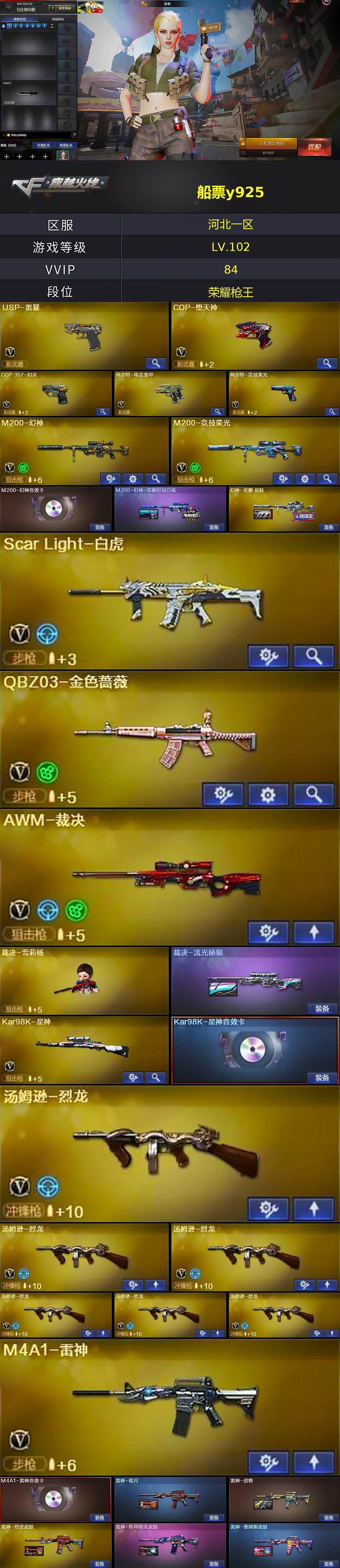 河北一区-84v-0王者-0炫金 【热门武器】:q03-金色蔷薇,scar light-白虎,m200-幻神,m200-竞技荣光,kar98k-星神,cat-刀锋,m4a1-黑骑士2,汤姆逊-烈龙6,雷神-小红,裁决-雪莉杨,cop-白鲨,usp-雷暴,cop-堕天神,cop 357-幻灵,沙鹰-修罗 【音效卡】:m200-幻神音效卡,m4a1-雷神音效卡,m4a1-黑骑士音效卡,ba