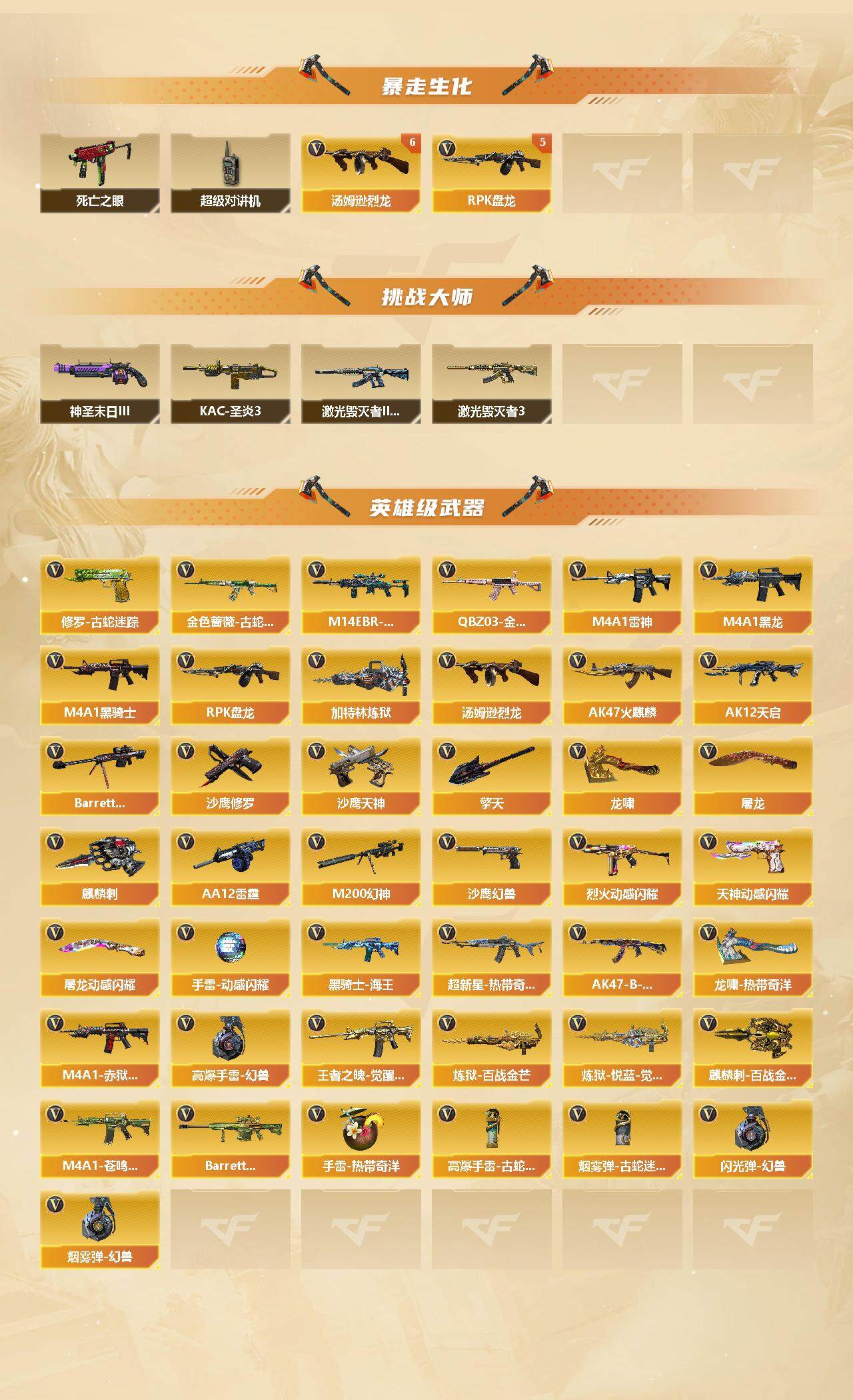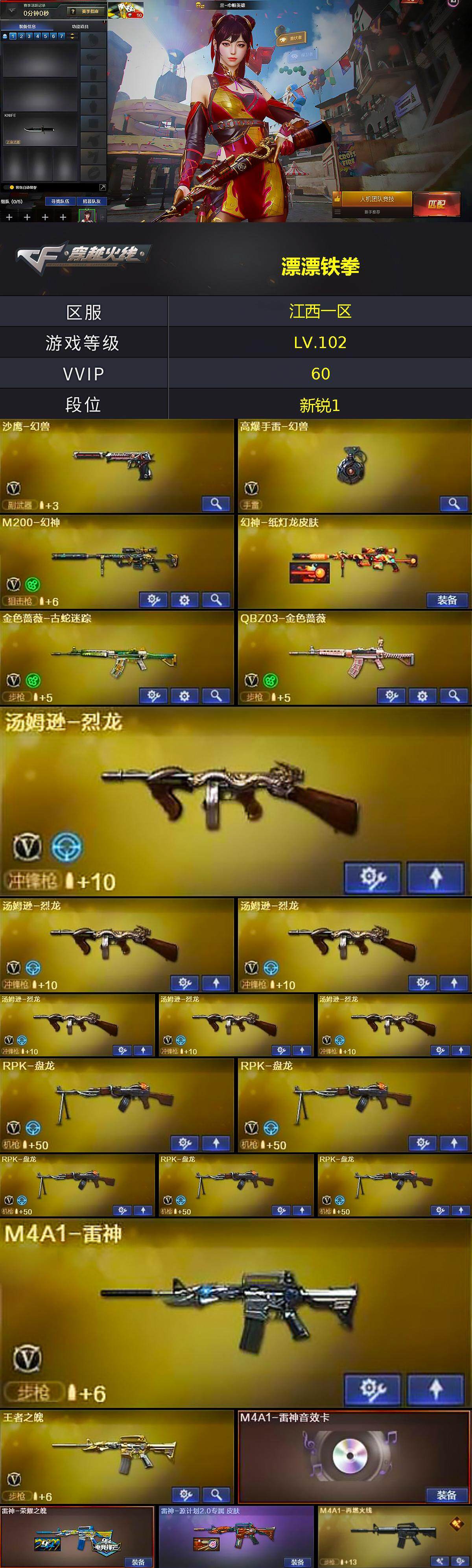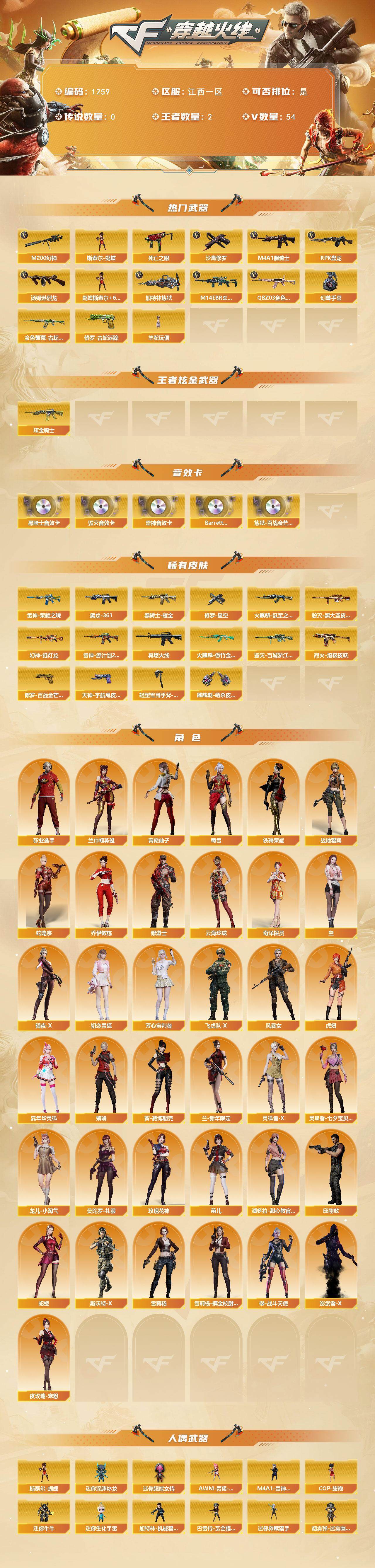 江西一区-54v-2王者-1炫金 【热门武器】:q03-金色蔷薇,m14ebr-玄武,m200-幻神,金色蔷薇-古蛇迷踪,修罗-古蛇迷踪,死亡之眼,m4a1-黑骑士,汤姆逊-烈龙6,rpk-盘龙5,加特林-炼狱,斯泰尔-蝴蝶,羊驼玩偶,沙鹰-修罗4,高爆手蕾-幻兽 【王者炫金武器】:炫金骑士 【音效卡】:m4a1-雷神音效卡,m4a1-黑骑士音效卡,barrett-毁灭音效卡,bar