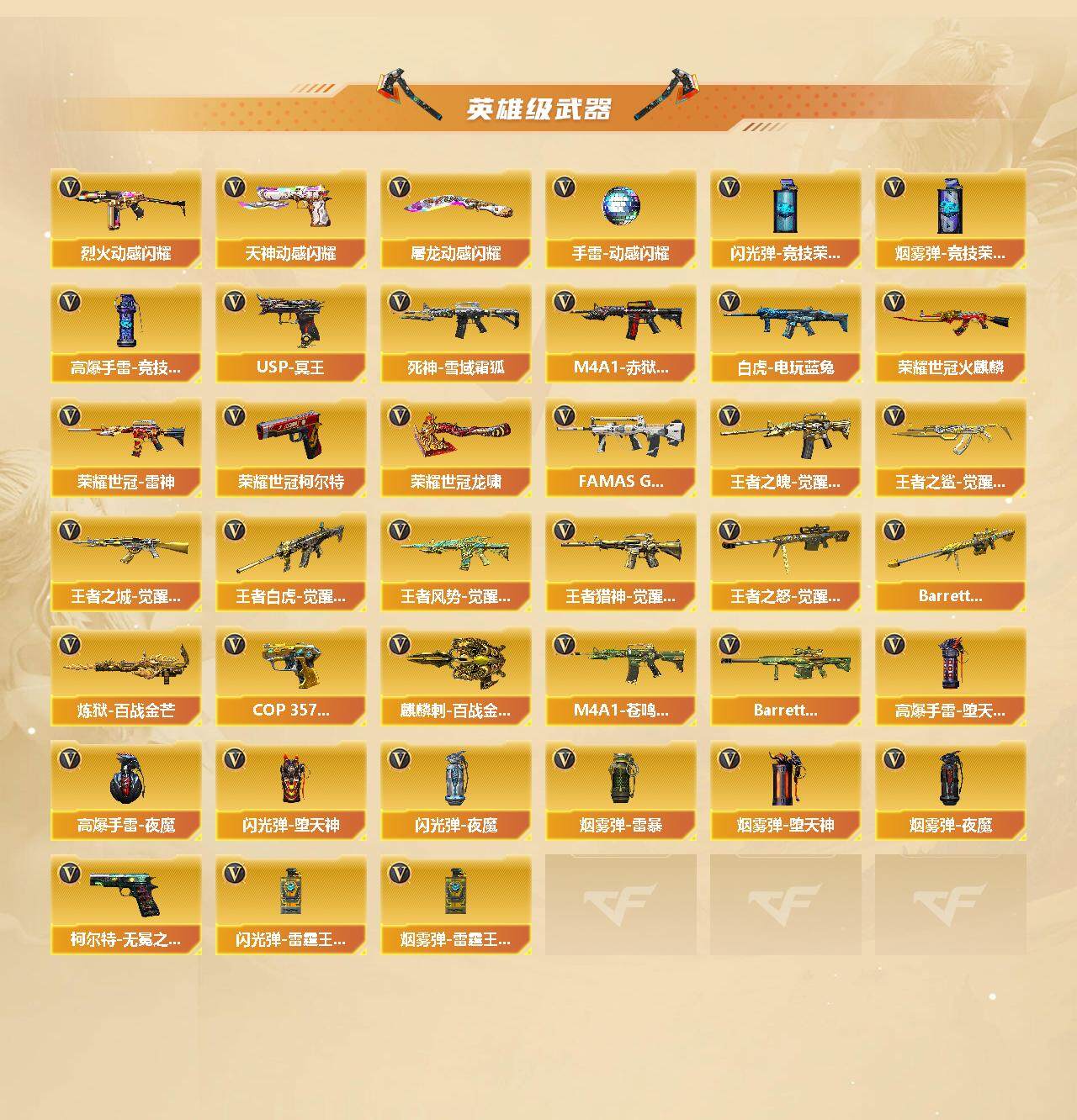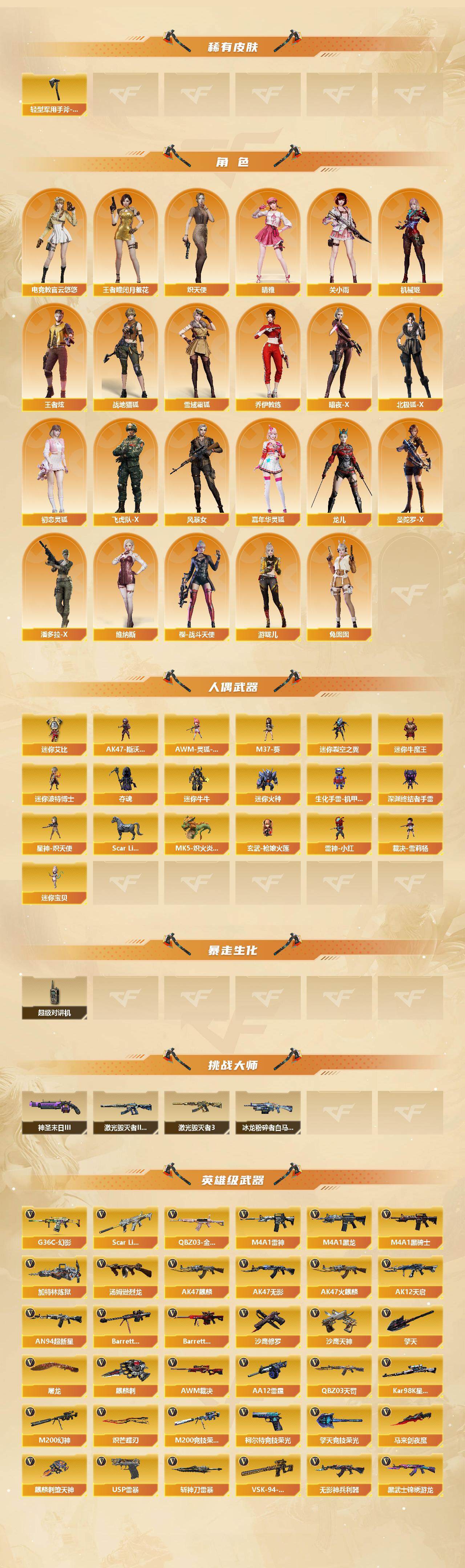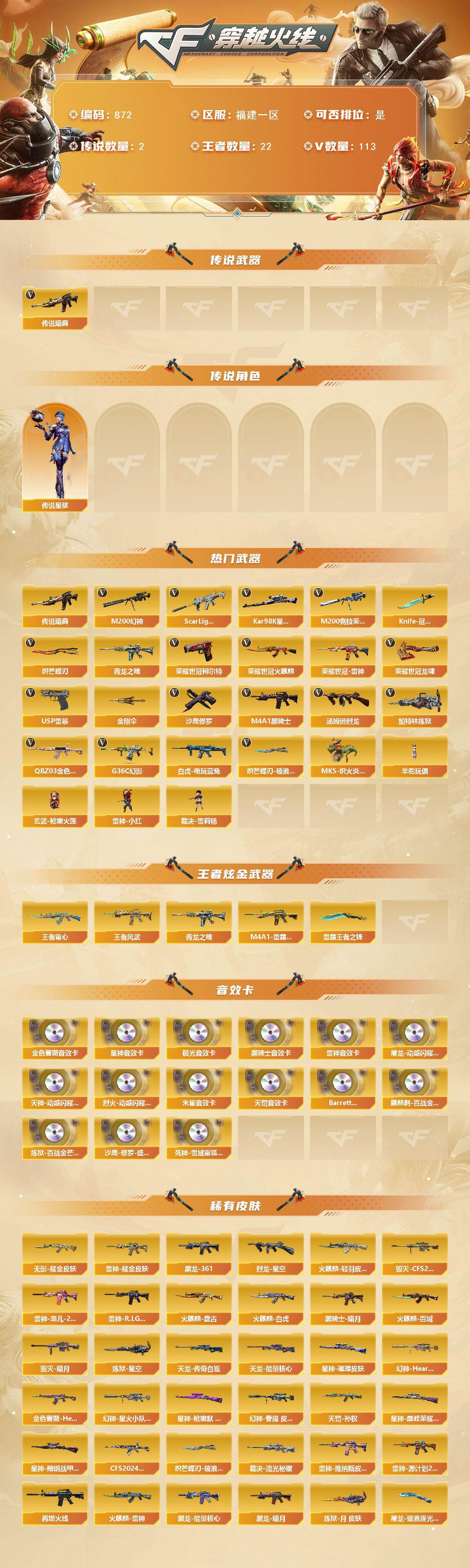 [15054688]福建一区-113v-22王者-0炫金 【传说武器】:传说暗裔 【传说角色】:传说星骇 【热门武器】:传说暗裔,g36c-幻影,q03-金色蔷薇,scar light-白虎,m200-幻神,m200-竞技荣光,青龙之魄,荣耀世冠-火麒麟,荣耀世冠-雷神3,白虎-电玩蓝兔,荣耀世冠-柯尔特,kar98k-星神,m4a1-黑骑士,汤姆逊-烈龙,加特林-炼狱2,mk5-炽火炎龙,羊驼玩偶,玄武-呛娘火莲,雷神-小红,裁决-雪莉杨,usp-雷暴,沙鹰-修罗,knife-冠军之刃,炽芒蝶刃,炽芒蝶刃-破浪逐光 皮肤,荣耀世冠-龙啸2,金刚伞 【王者炫金武器】:m4a1-雷霆王者,王者霜心,王者风武,青龙之魄,雷霆王者之锋 【音效卡】:屠龙-动感闪耀 音效卡,天神-动感闪耀 音效卡,烈火-动感闪耀 音效卡,m4a1-雷神音效卡,m4a1-黑骑士音效卡,barrett-极光音效卡,q03-金色蔷薇音效卡,kar98k-星神音效卡,hk417-朱雀音效卡,q03-天罚音效卡,barrett-碧霄极光音效卡,麒麟刺-百战金芒-盛典舞曲音效卡,炼狱-百战金芒-庆典舞曲音效卡,沙鹰-修罗-盛典舞曲音效卡,死神-雪域霜狐-怀旧音效卡 【皮肤】:幻神-heartshot 皮肤,幻神-星火小队签名臻藏版 皮肤,幻神-曹操 皮肤,金色蔷薇-heartshot皮肤,q03-cfs2024 皮肤,裁决-流光秘银,星神-璀璨皮肤,星神-呛娘默 皮肤,星神-巅峰荣耀 皮肤,星神-黯钢战甲 皮肤,烈龙-星空,雷神-耀金皮肤,雷神-宠儿-2019mvp,雷神-r.lgd-cfpls18冠军,雷神-维纳斯皮肤,雷神-源计划2.0专属 皮肤,m4a1-再燃火线,火麒麟-雷神2,火麒麟-轻羽皮肤,火麒麟-盘古,火麒麟-白虎,火麒麟-百城,毁灭-暗月3,毁灭-cfs2020,黑龙-能量核心2,黑龙-暗月,m4a1-黑龙-361,黑骑士-暗月,无影耀金皮肤,天罚-孙权 皮肤,天龙-能量核心,awm-天龙-传奇白鲨,炼狱-星空,炼狱-月 皮肤,屠龙-破浪逐光 皮肤,轻型军用手斧-再燃火线,炽芒蝶刃-破浪逐光 皮肤 【角色】:电竞教官-云悠悠,关小雨,晴雅,机械姬,战地猎狐,王者-瞳-闭月羞花,王者炫,雪域霜狐,乔伊教练,炽天使,暗夜-x,北极狐-x,初恋灵狐,飞虎队-x,风暴女,嘉年华灵狐,