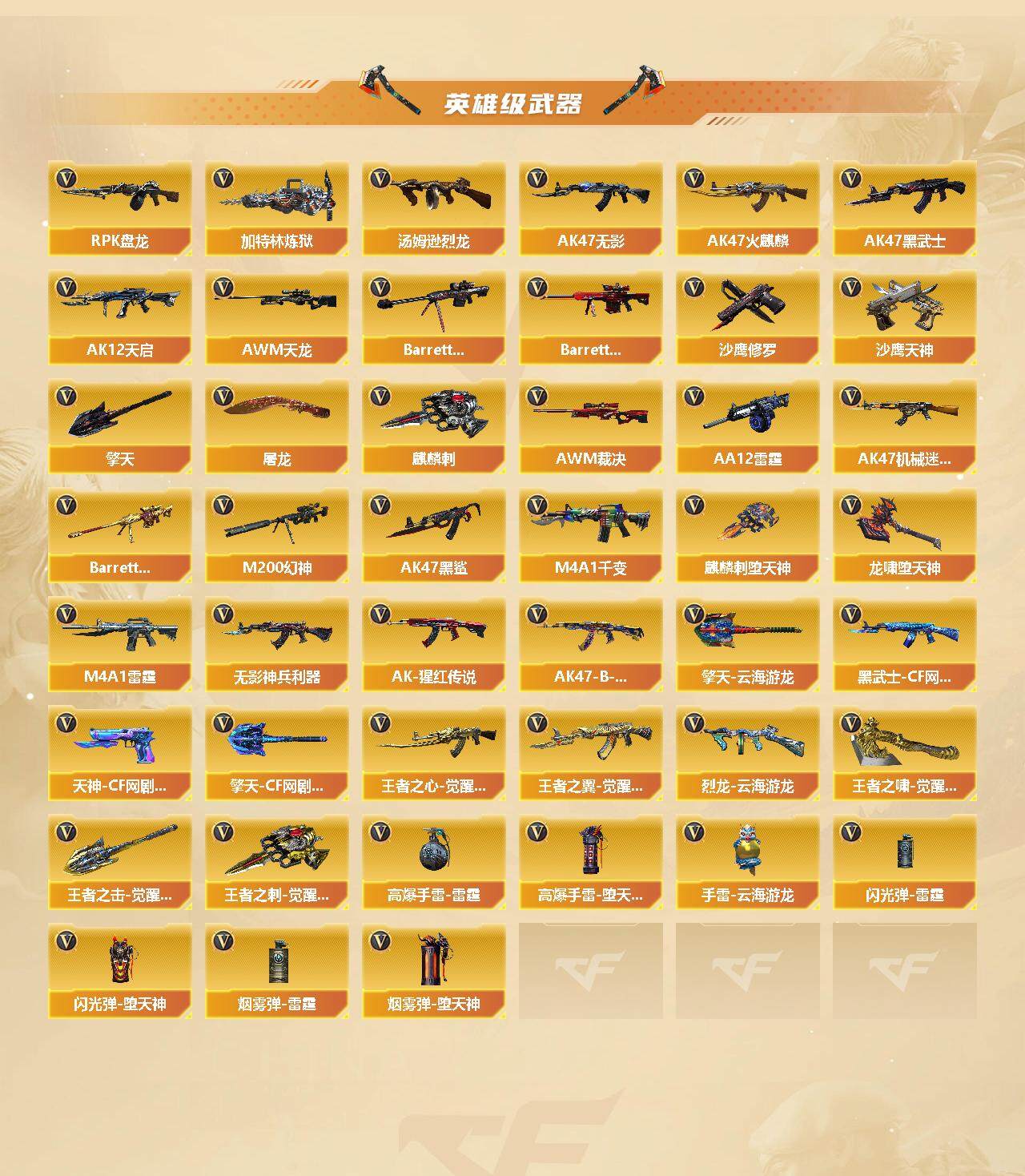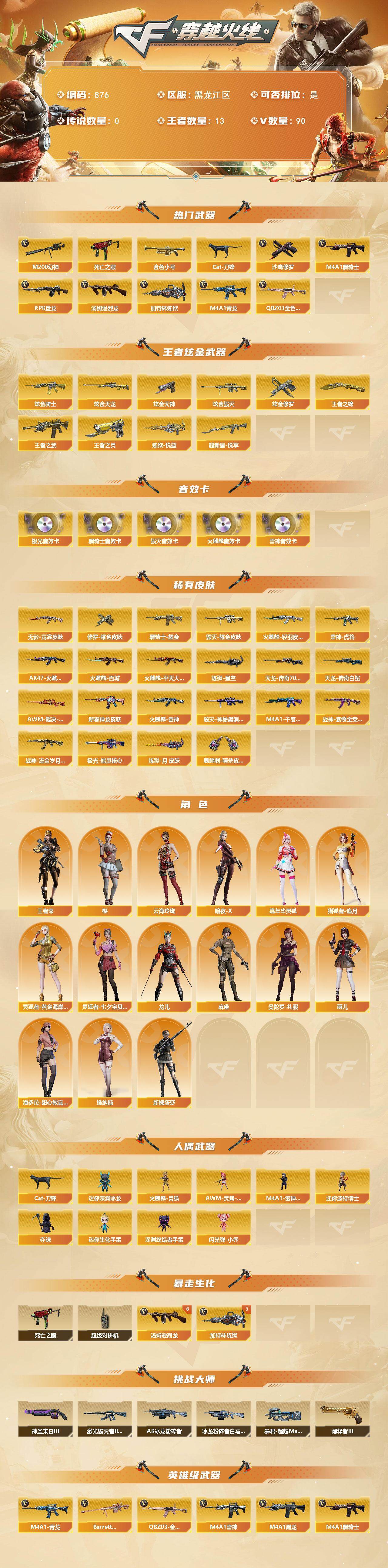 [15057532]黑龙江区-90v-13王者-10炫金 【热门武器】:q03-金色蔷薇2,m4a1-青龙,m200-幻神,死亡之眼,金色小号,cat-刀锋,m4a1-黑骑士,汤姆逊-烈龙8,rpk-盘龙,加特林-炼狱5,沙鹰-修罗 【王者炫金武器】:超新星-悦享,王者之武,炼狱-悦蓝,王者之灵2,王者之锋,炫金骑士,炫金毁灭2,炫金天龙3,炫金天神,炫金修罗3 【音效卡】:ak47-火麒麟音效卡,m4a1-雷神音效卡2,m4a1-黑骑士音效卡,barrett-毁灭音效卡,barrett-极光音效卡 【皮肤】:awm-裁决-凤灵皮肤,雷神-虎将,m4a1-雷神-新春神龙皮肤,火麒麟-雷神,ak47-火麒麟-传奇even,火麒麟-轻羽皮肤,火麒麟-平天大圣,火麒麟-百城,毁灭耀金皮肤2,毁灭-神秘黑洞皮肤,m4a1-千变-孔明皮肤2,黑骑士耀金皮肤,无影-霓裳皮肤,战神-紫绶金章皮肤4,战神-流金岁月皮肤6,awm-天龙-传奇70kg2,awm-天龙-传奇白鲨,极光-能量核心,炼狱-星空,炼狱-月 皮肤,修罗耀金皮肤,麒麟刺-萌杀皮肤 【角色】:樱,王者-零,云海玲珑,暗夜-x,嘉年华灵狐,猎狐者-追月,灵狐者-黄金海岸,灵狐者-七夕宝贝,龙儿,麻雀,曼陀罗-礼服,萌儿,潘多拉-甜心教官,维纳斯,新娜塔莎 【人偶武器】:火麒麟-灵狐,m4a1-雷神-精英刀锋2,awm-灵狐-15周年嘉年华,cat-刀锋,迷你深渊冰龙,迷你波特博士,夺魂,迷你生化手蕾,深渊终结者手蕾3,闪光丹-小乔 【暴走生化】:死亡之眼,超级对讲机 【挑战大师】:暴君乱世-超越max,ak47-冰龙粉碎者,冰龙粉碎者-白马银呛,激光毁灭者iii-白马银呛,神圣爆裂者-末日iii,阐释者iii 【英雄级武器】:m4a1-千变,ak47-火麒麟,m4a1-黑龙3,m4a1-雷神2,m4a1-黑骑士,ak47-无影,ak47-黑武士,ak12-天启2,ak47-机械迷城,ak47-黑鲨4,m4a1-雷霆,m4a1-青龙,无影-神兵利器,q03-金色蔷薇2,王者之心-觉醒版,王者之翼-觉醒版,ak-47-猩红传说6,ak47-b-战神,黑武士-cf网剧冠军,awm-天龙,barrett-毁灭3,barrett-极光,awm-裁决2,m200-幻神,barrett-朱雀,b