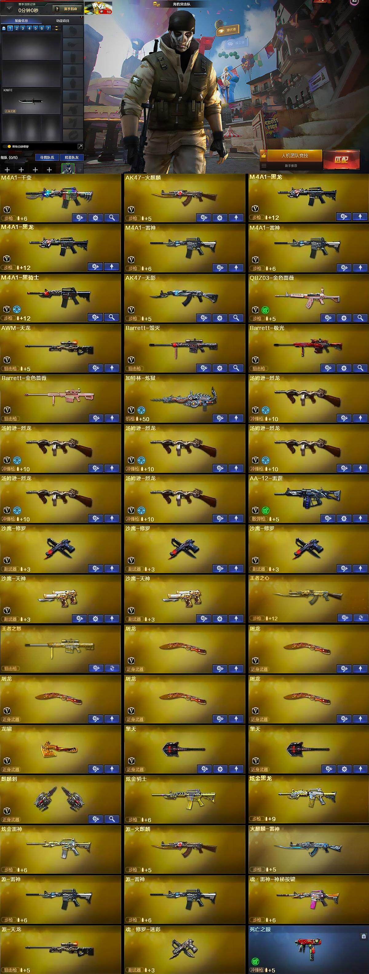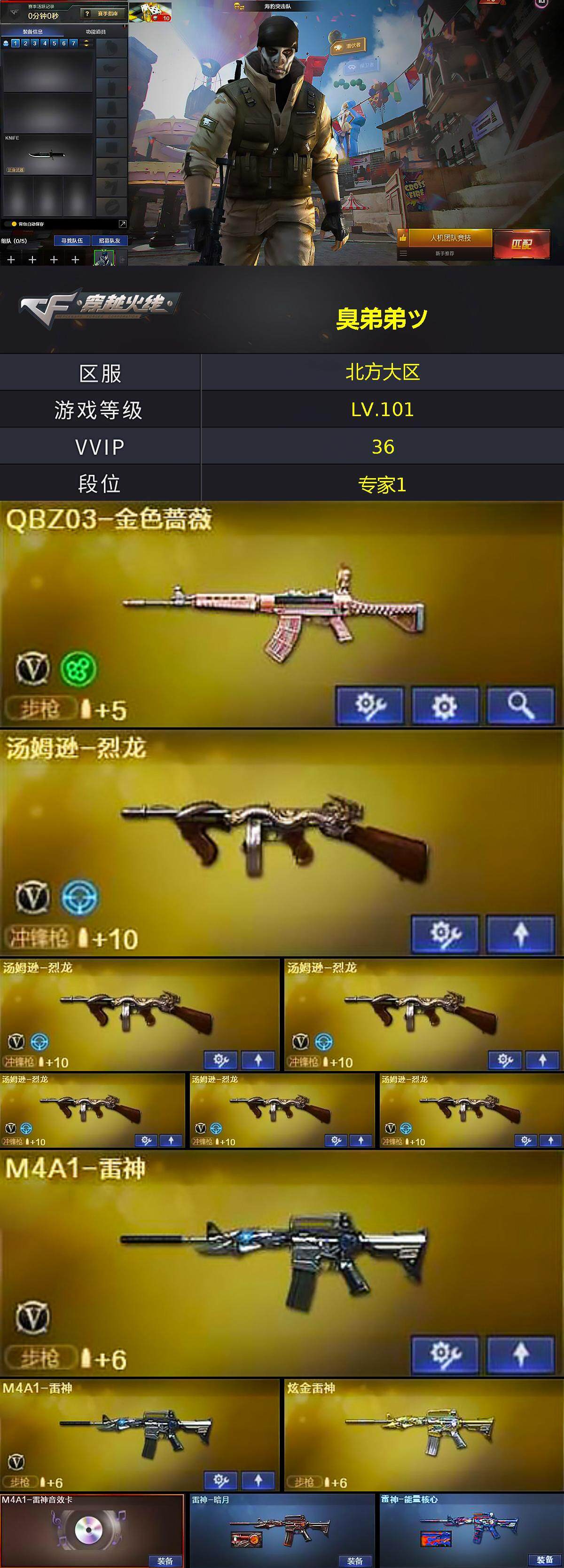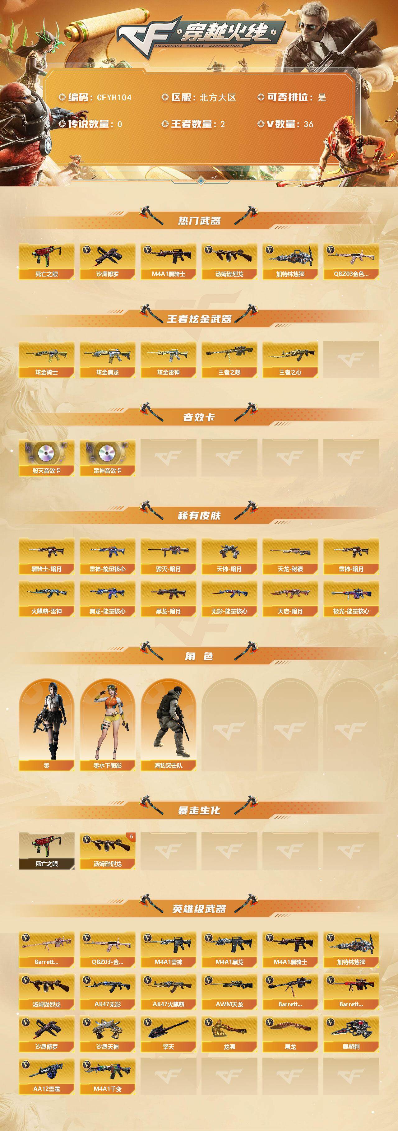 【cfyh104】35v/101级/大元首/2王者/3炫金/1英雄/q03-金色蔷薇/死亡之眼/m4a1-黑骑士/汤姆逊-烈龙/加特林-炼狱/沙鹰-修罗/王者之心/王者之怒/炫金骑士/炫金黑龙/炫金雷神/m4a1-雷神音效卡/barrett-毁灭音效卡/雷神-暗月/雷神-能量核心/火麒麟-雷神/毁灭-暗月/黑龙-能量核心/黑龙-暗月/黑骑士-暗月/无影-能量核心/天启-暗月/天龙-秘银/极光-能量核心/天神-暗月/零/零-水下丽影/海豹突击队/6烈龙/m4a1-千变/ak47-火麒麟/m4a1-黑龙/m4a1-雷神/ak47-无影/awm-天龙/barrett-毁灭/barrett-极光/barrett-金色蔷薇/aa-12-雷霆/沙鹰-天神/屠龙/龙啸/擎天/麒麟刺/战舰背包/炫彩背包/超级背包/绿色巨人/灵魂忍者/变异宝贝/迷雾幽灵/夺命之镰/防化服/防弹头盔/防弹衣/c4工具钳/手蕾包