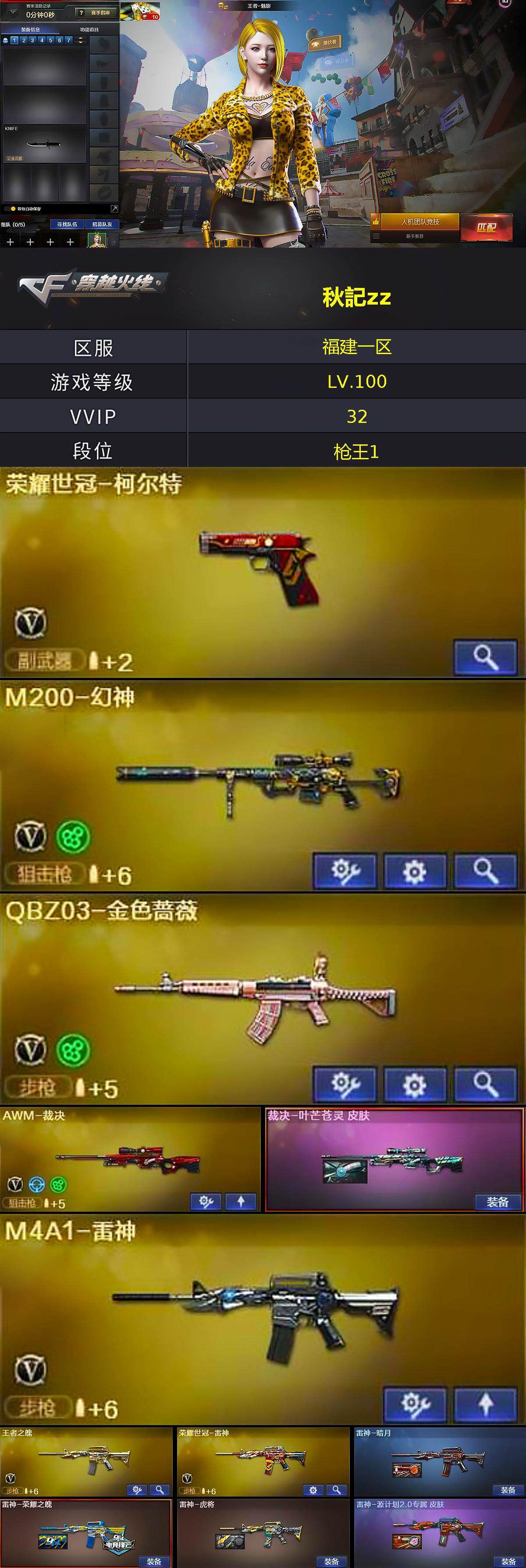 福建一区-29v-9王者-0炫金 【热门武器】:q03-金色蔷薇,hk417-朱雀,m200-幻神,荣耀世冠-雷神,荣耀世冠-柯尔特,m4a1-黑骑士,加特林-炼狱 【王者炫金武器】:王者之魄闪光丹 【音效卡】:m4a1-黑骑士音效卡 【皮肤】:金色蔷薇-热带奇洋 皮肤,裁决-叶芒苍灵 皮肤,雷神-暗月,雷神-荣耀之魄,雷神-虎将,雷神-源计划2.0专属 皮肤,火麒麟-平天大圣,毁灭-黑大