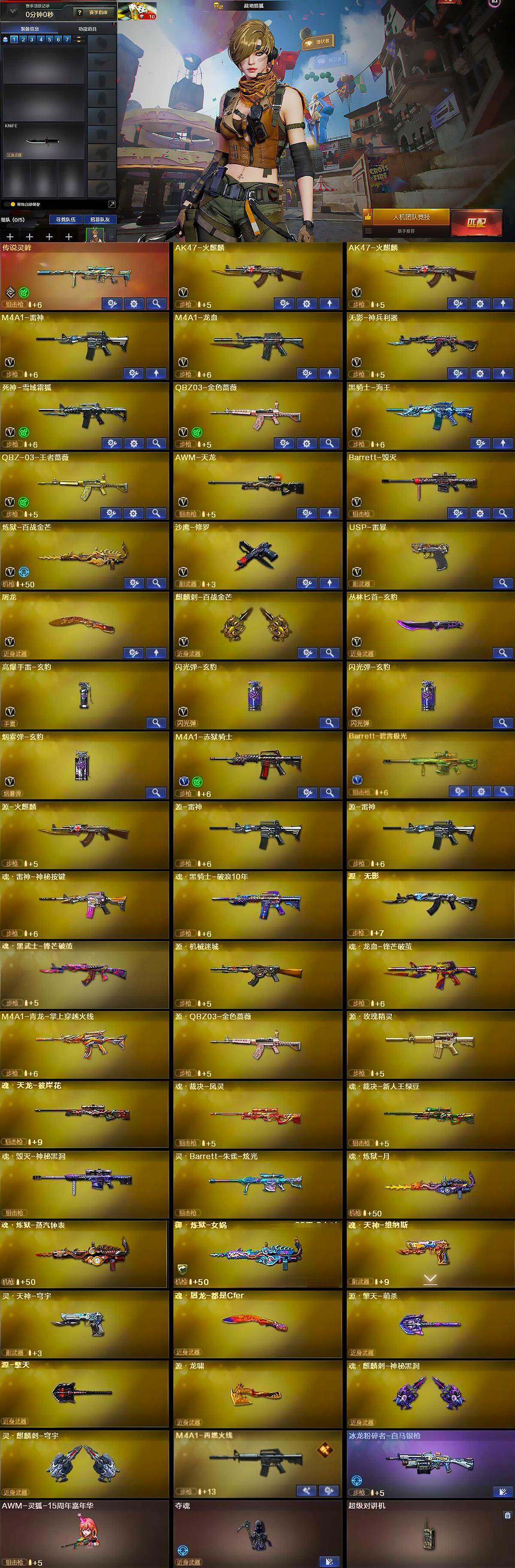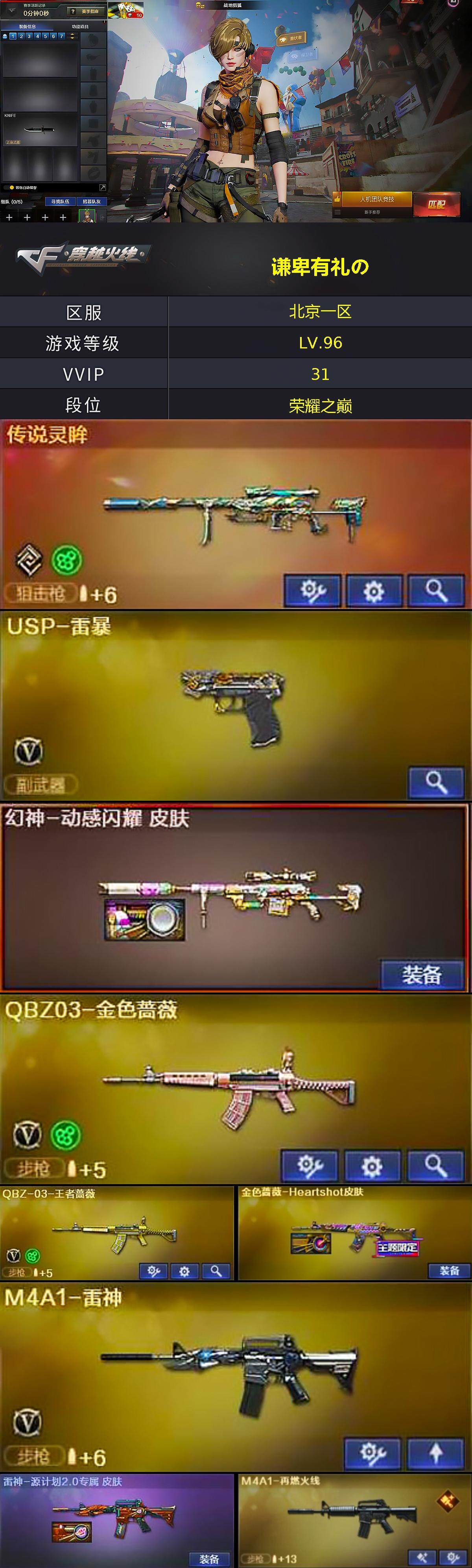 北京一区-29v-1王者-0炫金 【传说武器】:传说灵眸 【热门武器】:传说灵眸,q03-金色蔷薇,usp-雷暴,沙鹰-修罗 【音效卡】:barrett-碧霄极光音效卡,炼狱-百战金芒-庆典舞曲音效卡,沙鹰-修罗-盛典舞曲音效卡,死神-雪域霜狐-怀旧音效卡 【皮肤】:幻神-动感闪耀 皮肤,金色蔷薇-heartshot皮肤,雷神-源计划2.0专属 皮肤,m4a1-再燃火线,火麒麟-平天大圣