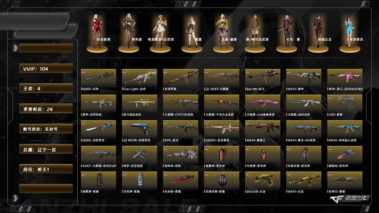 7771/北部/辽宁一区/可排位/105v/传说影煞/传说梦魇/传说破晓/幻神/幻神音效卡/200竞技荣光/王者星霆/觉醒版/q金色蔷薇/q音效卡/王者芳薇/觉醒版/白虎/白虎暗星/【/四防角色/传说影煞/电竞教官云悠悠/王者魅影/】/usp雷暴/cop云龙/柯尔特竞技荣光/2/毁