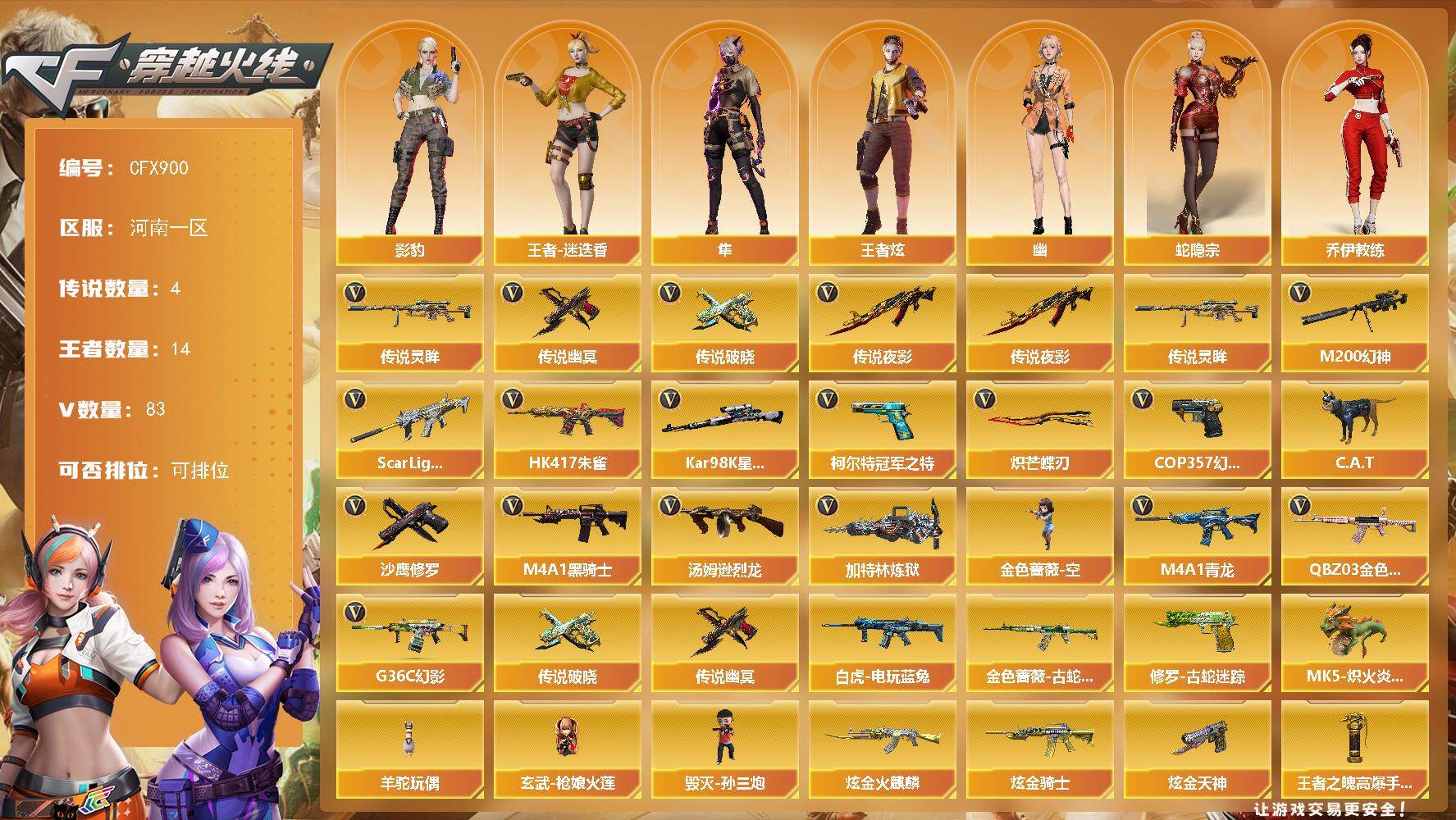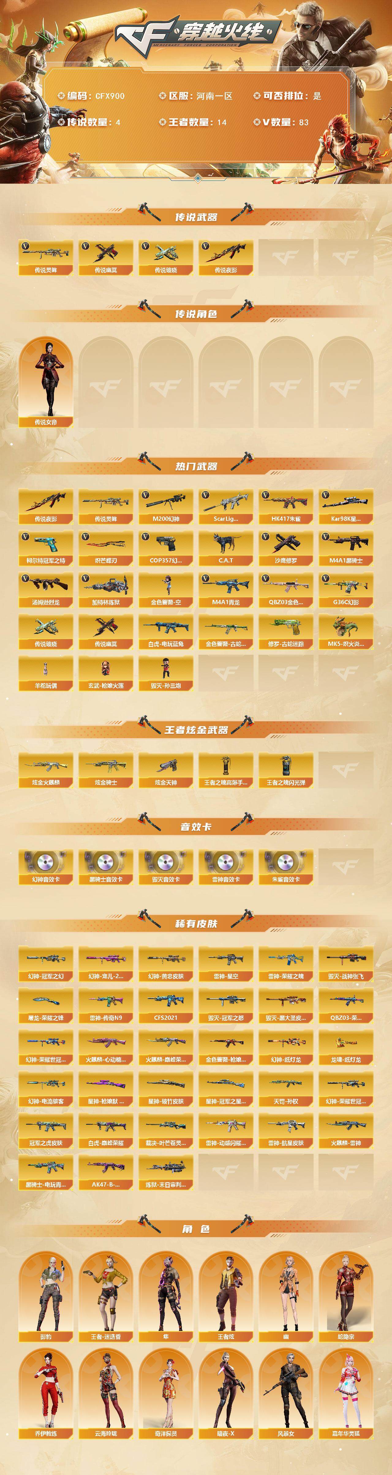 【cfx900】81v/100级/元帅/4传说/14王者/3炫金/2英雄/传说夜影/传说灵眸/传说破晓/传说幽冥/传说女帝/g36c-幻影/q03-金色蔷薇/scar light-白虎/hk417-朱雀/m4a1-青龙/m200-幻神/金色蔷薇-古蛇迷踪/修罗-古蛇迷踪/白虎-电玩蓝兔/柯尔特-冠军之特/kar98k-星神/c.a.t/m4a1-黑骑士/汤姆逊-烈龙/加特林-炼狱/金色蔷薇-空/mk5-炽火炎龙/羊驼玩偶/玄武-呛娘火莲/毁灭-孙三炮/cop 357-幻灵/沙鹰-修罗/炽芒蝶刃/炫金火麒麟/炫金骑士/炫金天神/王者之魄高爆手蕾/王者之魄闪光丹/m200-幻神音效卡/m4a1-雷神音效卡/m4a1-黑骑士音效卡/barrett-毁灭音效卡/hk417-朱雀音效卡/m200-幻神-黄忠皮肤/幻神-冠军之幻/幻神-宠儿-2021mvp/m200-幻神-荣耀世冠白鲨/幻神-纸灯龙皮肤/幻神-电流骇客 皮肤/幻神-荣耀世冠白鲨2023 皮肤/scarlight-白虎-冠军之虎皮肤/白虎-巅峰荣耀 皮肤/金色蔷薇-呛娘阿敏 皮肤/q03-荣耀世冠白鲨/裁决-叶芒苍灵 皮肤/星神-呛娘默 皮肤/星神-破竹皮肤/kar98k-星神-冠军之星皮肤/雷神-荣耀之魄/雷神-星空/雷神-传奇n9/雷神-动感闪耀 皮肤/雷神-航星皮肤/火麒麟-雷神/火麒麟-巅峰荣耀/火麒麟-心动糖果/毁灭-冠军之怒/毁灭-战神张飞/毁灭-黑大圣皮肤/黑骑士-cfs2021/黑骑士-电玩青兔皮肤/天罚-孙权 皮肤/ak47-b-常胜将军-曹操/炼狱-末日审判 皮肤/屠龙-荣耀之锋/龙啸-纸灯龙皮肤/影豹/隼/王者炫/王者-迷迭香/蛇隐宗/奇洋探员/乔伊教练/云海玲珑/暗夜-x/风暴女/嘉年华灵狐/娟娟/曼陀罗-x/潘多拉-x/潜龙队-x/蛇姬/斯沃特-x/兔囡囡/幽/天龙-曼陀罗/火麒麟-灵狐/迷你宝贝/迷你律动酷熊/斯泰尔-呛娘暗刃/awm-灵狐-15周年嘉年华/迷你裂空之翼/迷你牛魔王/迷你波特博士/夺魂/迷你生化手蕾/生化手蕾-机甲核心/深渊终结者手蕾/cop-青花瓷-斯沃特精英/barrett-夜玫瑰/迷你超能女侍/冰龙粉碎者-白马银呛/激光毁灭者iii-白马银呛/试炼破坏者iii/神圣爆裂者-末日iii/ak47-火麒麟/m4a1-雷神/ak47-无影/ak47-黑武士/ak47-机械迷城/m4a1-神工天巧/无影-神兵利器/q03-云龙/黑武士-锦绣游龙/超新星-热带奇洋/m4a1-猎神/烈火-动感闪耀/王者之圣-觉醒版/ak47-b-战神/王者之城-觉醒版/barrett-毁灭/awm-裁决/王者风神-觉醒版/烈龙-云海游龙/柯尔特-无冕之王/cop 357-云龙/usp-神工天巧/天神-动感闪耀/屠龙/龙啸/麒麟刺/幻灵之锋/擎天-竞技荣光/屠龙-动感闪耀/擎天-云海游龙/龙啸-热带奇洋/高爆手蕾-幻灵/高爆手蕾-竞技荣光/高爆手蕾-神工天巧/手蕾-动感闪耀/高爆手蕾-云龙/手蕾-云海游龙/手蕾-热带奇洋/高爆手蕾-古蛇迷踪/闪光丹-幻灵/闪光丹-神工天巧/闪光丹-云龙/闪光丹-雷霆王者-觉醒版/盐雾蛋-幻灵/盐雾蛋-竞技荣光/盐雾蛋-神工天巧/盐雾蛋-云龙/盐雾蛋-古蛇迷踪/盐雾蛋-雷霆王者-觉醒版/bs战队炫彩背包/云海游龙炫彩背包/全能呛王背包/古蛇迷踪炫彩背包/奇洋探员-海龟背包/战舰背包/热带奇洋炫彩背包/超级背包/绿色巨人/灵魂忍者/变异宝贝/迷雾幽灵/生化弹匣/夺命之镰/防化服/金色流光-呛王排位/星辰流光-呛王排位/巅峰赛先锋-金色流光/呛王排位28赛季金色流光/呛王排位29赛季金色流光/语音特效-生化/古蛇迷踪打击特效/蛇隐宗表情/电玩兔兔表情/热带奇洋表情/动感闪耀表情/云海游龙表情/防弹头盔/防弹衣/c4工具钳/手蕾包