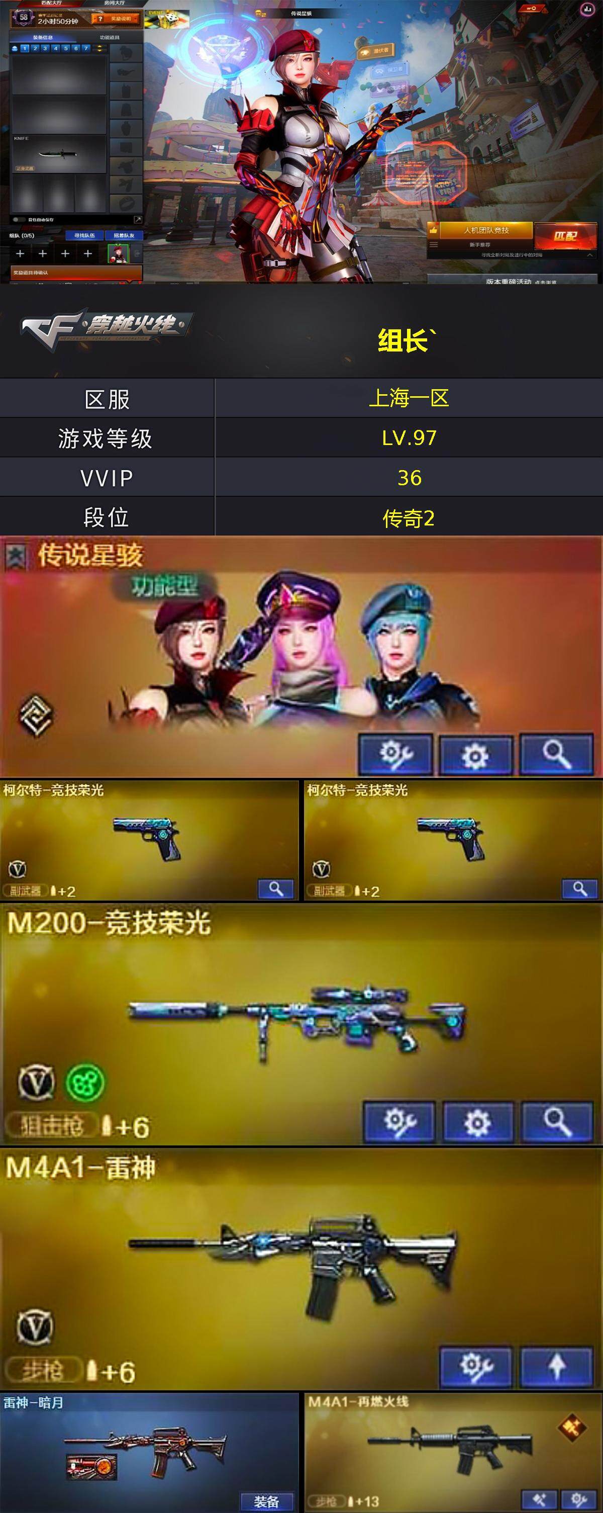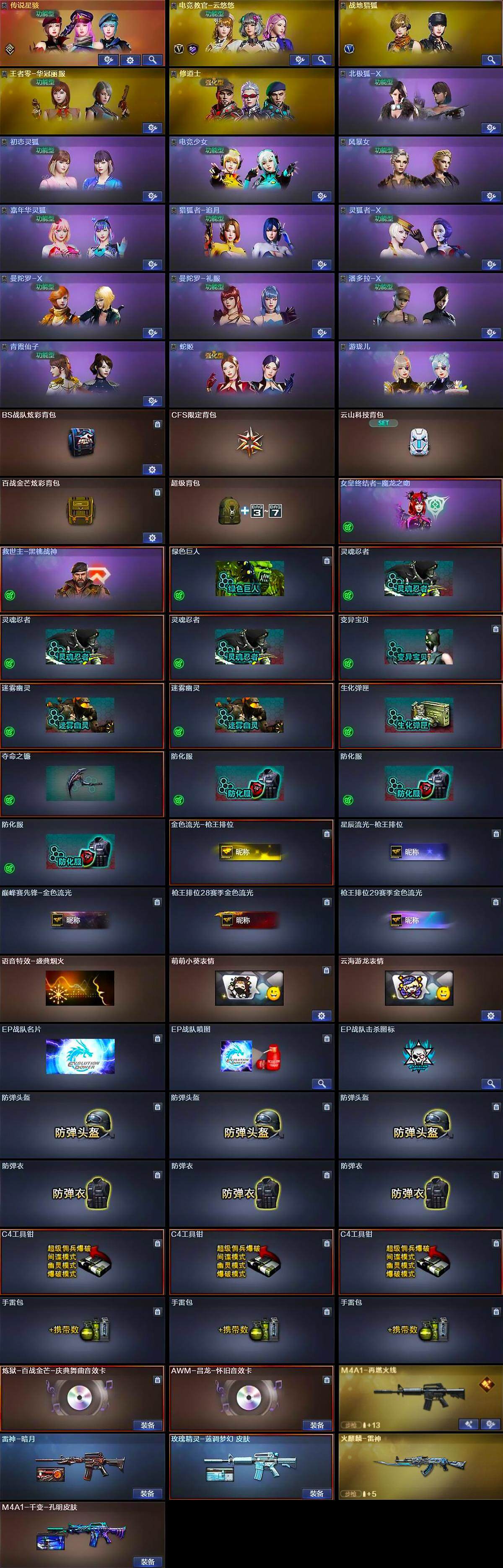 上海一区-34v-1王者-0炫金 【传说角色】:传说星骇 【热门武器】:m200-竞技荣光 【音效卡】:炼狱-百战金芒-庆典舞曲音效卡,awm-昌龙-怀旧音效卡 【皮肤】:雷神-暗月,m4a1-再燃火线,火麒麟-雷神,m4a1-千变-孔明皮肤,玫瑰精灵-蓝调梦幻 皮肤,轻型军用手斧-再燃火线 【角色】:电竞教官-云悠悠,战地猎狐,王者零-华冠丽服,修道士,北极狐-x,初恋灵狐,电竞少女,风暴女,嘉年华灵狐,猎狐者-追月,0号玩家,灵狐者-x,曼陀罗-x,曼陀罗-礼服,潘多拉-x,青霞仙子,蛇姬,游珑儿 【人偶武器】:awm-灵狐-15周年嘉年华,迷你超能女侍 【暴走生化】:超级对讲机 【挑战大师】:冰龙粉碎者-白马银呛2 【英雄级武器】:m4a1-雷神,黑武士-锦绣游龙,m4a1-玫瑰精灵,m200-竞技荣光,王者凰鸣-觉醒版,柯尔特-竞技荣光2,擎天-竞技荣光,麒麟刺-百战金芒,高爆手蕾-竞技荣光7,闪光丹-竞技荣光7,盐雾蛋-竞技荣光7,m4a1-赤狱骑士,awm-昌龙 【道具】:bs战队炫彩背包,cfs限定背包,云山科技背包,百战金芒炫彩背包,超级背包,女皇终结者-魔龙之吻,救世主-黑桃战神,绿色巨人,灵魂忍者3,变异宝贝,迷雾幽灵2,生化弹匣,夺命之镰,防化服3,金色流光-呛王排位,星辰流光-呛王排位,巅峰赛先锋-金色流光,呛王排位28赛季金色流光,呛王排位29赛季金色流光,语音特效-盛典烟火,萌萌小葵表情,云海游龙表情,ep战队名片,ep战队喷图,ep战队击杀图标,防弹头盔3,防弹衣3,c4工具钳3,手蕾包3 【特殊呛械】:
