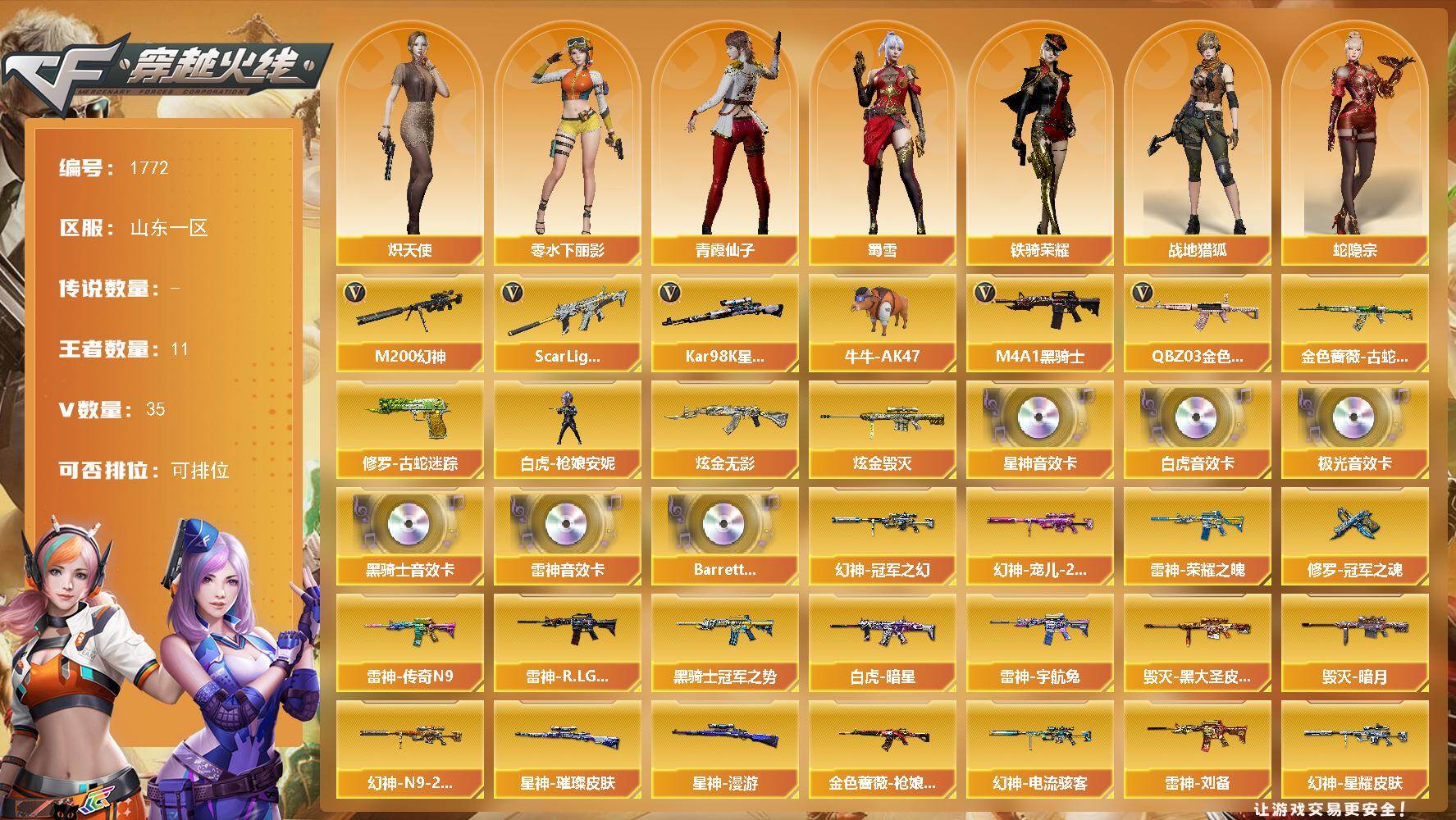 【1772】伊30811可排位-可二次【纯白无封号】【山东一区/51v/vip6/1传说】【四防传说影煞/幻神5皮/星神3件套/白虎3件套/加利尔零号】【cop357-雷霆王者/cop357-云龙】【m200-幻神/幻神-宠儿/幻神-n9/幻神-冠军之幻/幻神-星耀皮/幻神-电流骇客皮】【kar98k-星神/kar98k-星神音效卡/星神-璀璨皮/星神-漫游】【awm-裁决/裁决-羽掣】【scar light-白虎/白虎音效卡/scar light-白虎-暗星】【q03-金色蔷薇/金色蔷薇-呛娘阿敏皮/金色蔷薇-破浪逐光皮】【m4a1-雷神2/雷神音效卡/雷神-荣耀之魄/雷神-传奇n9/雷神-r.lgd-cfpls18冠军/雷神-刘备皮/雷神-宇航兔皮肤/雷神-维纳斯皮肤】【barrett-毁灭/毁灭-ag-s15冠军/毁灭-ag-s16冠军/毁灭-暗月】【ak47-火麒麟/火麒麟-cfstar3/火麒麟-雷神】【m4a1-黑骑士/黑骑士音效卡/黑骑士-冠军之势/黑骑士-海王2】【王者火魄】【黑龙-能量核心】【无影-神兵利器】【黑鲨-电流骇客 皮肤/ak12-天启】【黑武士-锦绣游龙】【天龙-cfstar2】【barrett-极光/barrett-极光音效卡】【kac-狂怒咆哮】【修罗-cfstar2/修罗-冠军之魂】【沙鹰-天神】【云龙扇】【麒麟刺】【擎天2】【屠龙/屠龙-破浪逐光 皮肤】【龙啸-烈火龙威】【龙儿/暗夜-x/炽天使/木兰/奇洋探员/云海玲珑/乔伊教练/修道士/兔囡囡/零-水下丽影/兰-新年限定/灵狐-花神/麻雀/紫霞/青霞仙子/灵狐者-黄金海岸/蜀雪/娟娟/潘多拉-x/斯沃特-x/救世主-x/影武者-x/铁骑荣耀/新娜塔莎/幻影/堕天使/复仇者】【scar light-像素2】【超新星-热带奇洋】【colt1911-小故障/colt 1911-大黄蜂/柯尔特-萌杀/新usp-呛王排位奖励】【龙啸-热带奇洋】【神圣爆裂者-末日iii/激光毁灭者iii-白马银呛/激光毁灭者iii/冰龙粉碎者-白马银呛】【斯泰尔-巧克力】【牛牛-ak47/猫猫手套/白虎-呛娘安妮/cop-旗袍/迷你裂空之翼/夺魂】【闪光丹-竞技荣光】【高爆手蕾-云龙/闪光丹-云龙4/盐雾蛋-云龙】【高爆手蕾-雷霆王者3/闪光丹-雷霆王者/盐雾蛋-雷霆王者】【高爆手蕾-雷暴王者