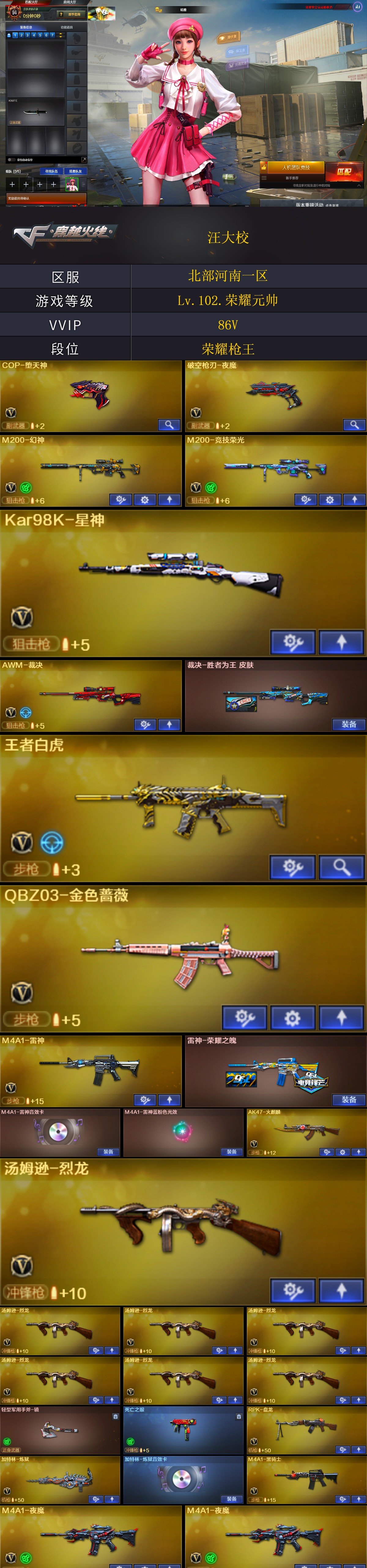 【★找回包赔★北部4119】:北部河南一区-86v-可二次实名-【lv.102.荣耀元帅】-【段位:荣耀呛王】m200-幻神/m200-竞技荣光/kar98k-星神/awm-裁决/王者白虎-觉醒版/q03-金色蔷薇/cop-堕天神/破空呛刃-夜魔/汤姆逊-烈龙7/rpk-盘龙/加特林-炼狱/m4a1-黑骑士/雷神-荣耀之魄/毁灭-荣耀之怒/加特林-炼狱音效卡/鹰/晴雅/高爆手蕾-雷霆/闪光丹-雷霆/盐雾蛋-雷霆(截图展示段位不代表实际段位,如赛季更新等不可抗拒因素发生变化,其余道具看截图或咨询客服)