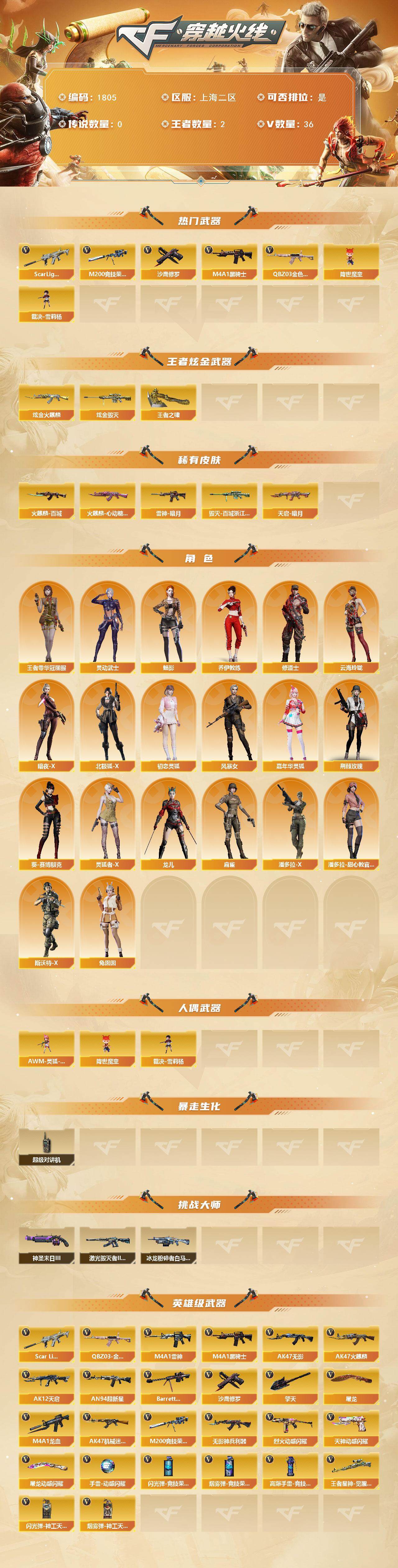 【1805】特29446可排位-可二次【上海二区/36v/vip6】【纯白无封号/附赠王者荣耀安卓q】【m200-竞技荣光】【王者星神】【scar light-白虎】【q03-金色蔷薇】【m4a1-雷神2/雷神-暗月】【barrett-毁灭/毁灭-百城浙江 皮肤】【ak47-火麒麟2/火麒麟-百城/火麒麟-cfstar/火麒麟-心动糖果】【m4a1-黑骑士2】【ak47-无影/无影-神兵利器】【沙鹰-修罗/修罗-cfstar】【天神-动感闪耀】【擎天】【屠龙/屠龙-动感闪耀】【龙啸-烈火龙威】【王者零-华冠丽服/魅影/龙儿/暗夜-x/灵动武士/葵-赛博朋克/木兰/云海玲珑/乔伊教练/修道士/兔囡囡/荆棘玫瑰/麻雀/紫霞/妲己/潘多拉-x/斯沃特-x/幻影/复仇者】【m4a1-龙血】【ak47-机械迷城/ak12-天启/天启-暗月】【an94-超新星】【colt1911-小故障/colt 1911-大黄蜂2/柯尔特-萌杀/新usp-呛王排位奖励3】【神圣爆裂者-末日iii/激光毁灭者iii-白马银呛/冰龙粉碎者-白马银呛】【猫猫手套】【王者之啸】【高爆手蕾-竞技荣光2/闪光丹-竞技荣光4/盐雾蛋-竞技荣光3】【闪光丹-神工天巧/盐雾蛋-神工天巧】【炫金火麒麟/炫金毁灭】【烟雾保护头盔/闪光护目镜2/超级对讲机/超级背包/防弹头盔4/防弹衣4/c4工具钳3/手蕾包3/防化服3】截图展示段位不代表实际段位,如赛季更新等不/拒因素发生变化、时限道具不保证所剩时间