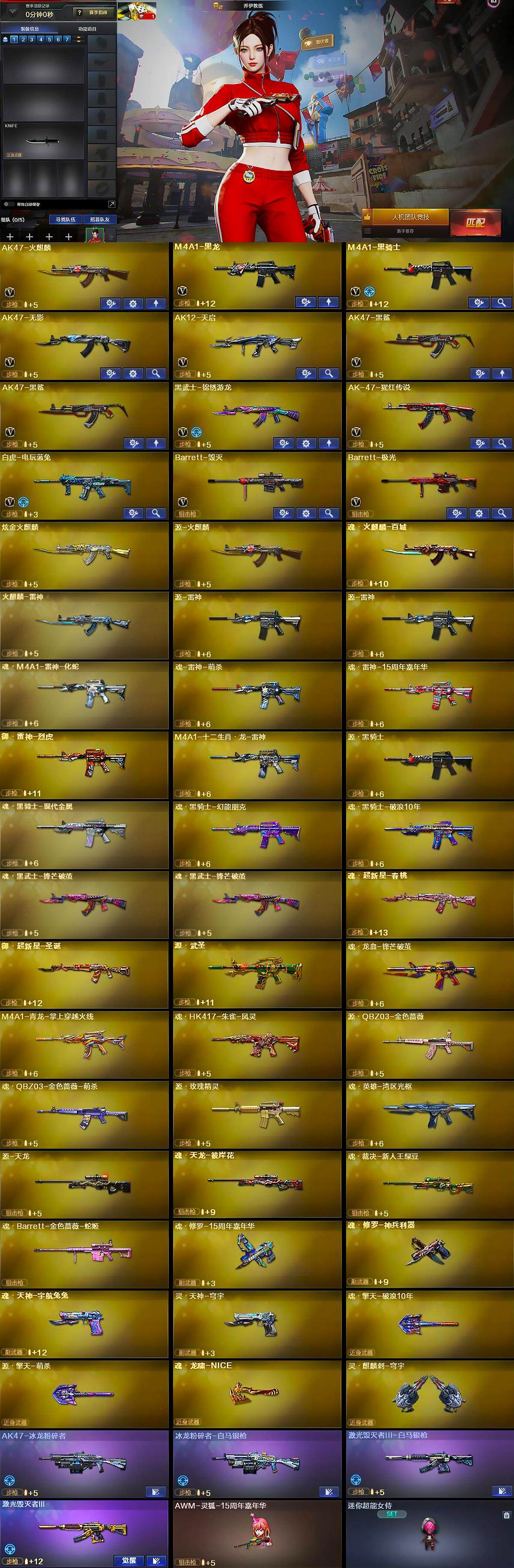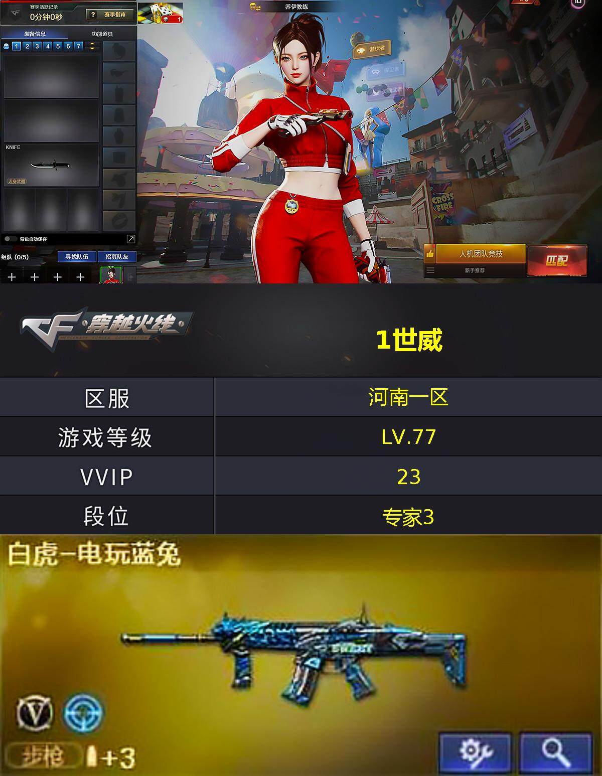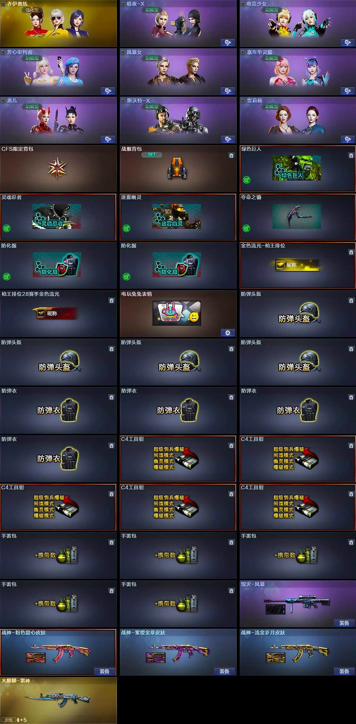 [15243707]河南一区-14v-0王者-1炫金 【热门武器】:白虎-电玩蓝兔,m4a1-黑骑士 【王者炫金武器】:炫金火麒麟 【皮肤】:火麒麟-雷神,毁灭-风暴,战神-粉色甜心皮肤,战神-紫绶金章皮肤,战神-流金岁月皮肤,ak47-b-常胜将军-曹操,ak47-b-常胜将军-孙权2 【角色】:乔伊教练,暗夜-x,电竞少女,芳心审判者,风暴女,嘉年华灵狐,0号玩家,龙儿,斯沃特-x,兔囡囡,雪莉杨 【人偶武器】:awm-灵狐-15周年嘉年华,迷你超能女侍 【挑战大师】:ak47-冰龙粉碎者,冰龙粉碎者-白马银呛,激光毁灭者iii-白马银呛,激光毁灭者iii 【英雄级武器】:ak47-火麒麟,m4a1-黑龙,m4a1-黑骑士,ak47-无影,ak12-天启,ak47-黑鲨2,黑武士-锦绣游龙,ak-47-猩红传说,白虎-电玩蓝兔,barrett-毁灭,barrett-极光 【道具】:cfs限定背包,战舰背包,绿色巨人,灵魂忍者,迷雾幽灵,夺命之镰,防化服2,金色流光-呛王排位,呛王排位28赛季金色流光,电玩兔兔表情,防弹头盔4,防弹衣4,c4工具钳5,手蕾包5 【特殊呛械】:1黑骑士