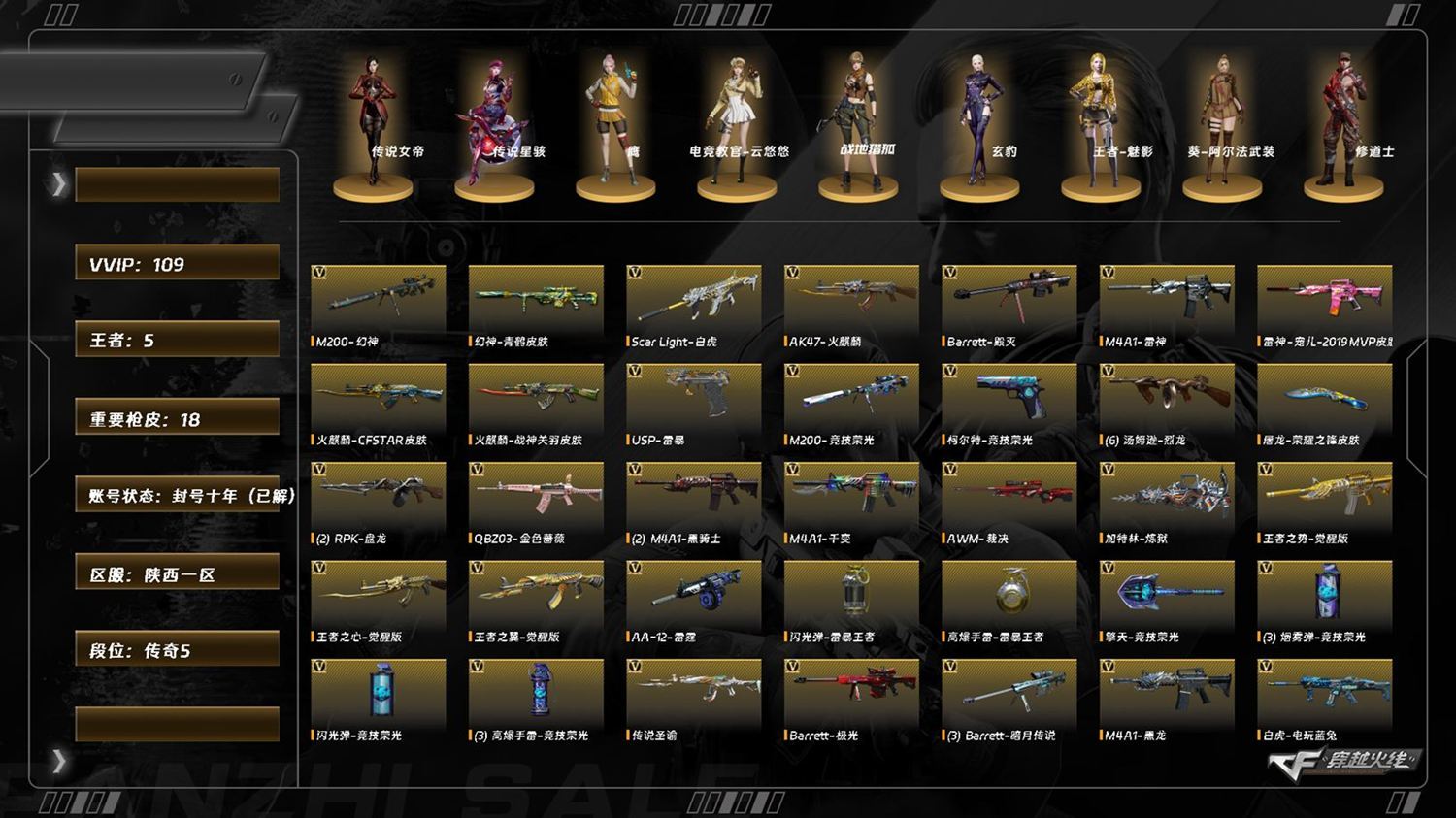 [15110304]7759/西部/陕西一区/可排位/110/3传说/【四防传说角色/传说女帝/传说星骇/】/传说圣谕/【幻神三件套/幻神/幻神青鹤/幻神音效卡/】/6烈龙/6修罗/【竞技荣光套/200竞技荣光/柯尔特竞技荣光/擎天竞技荣光/】/【白虎三件套/白虎/白虎暗星/白虎百战金芒/白