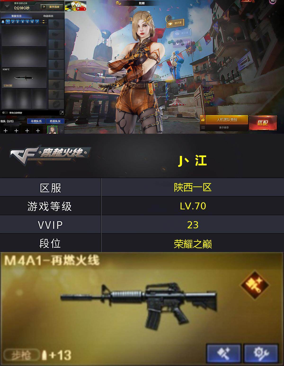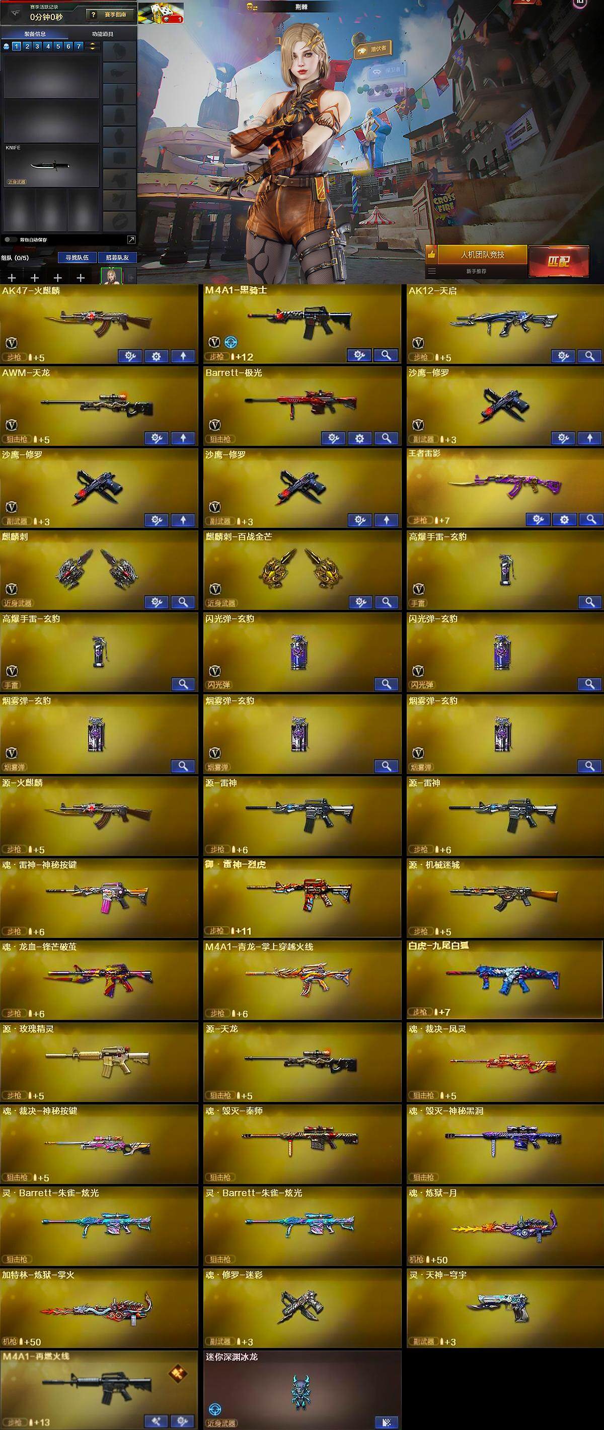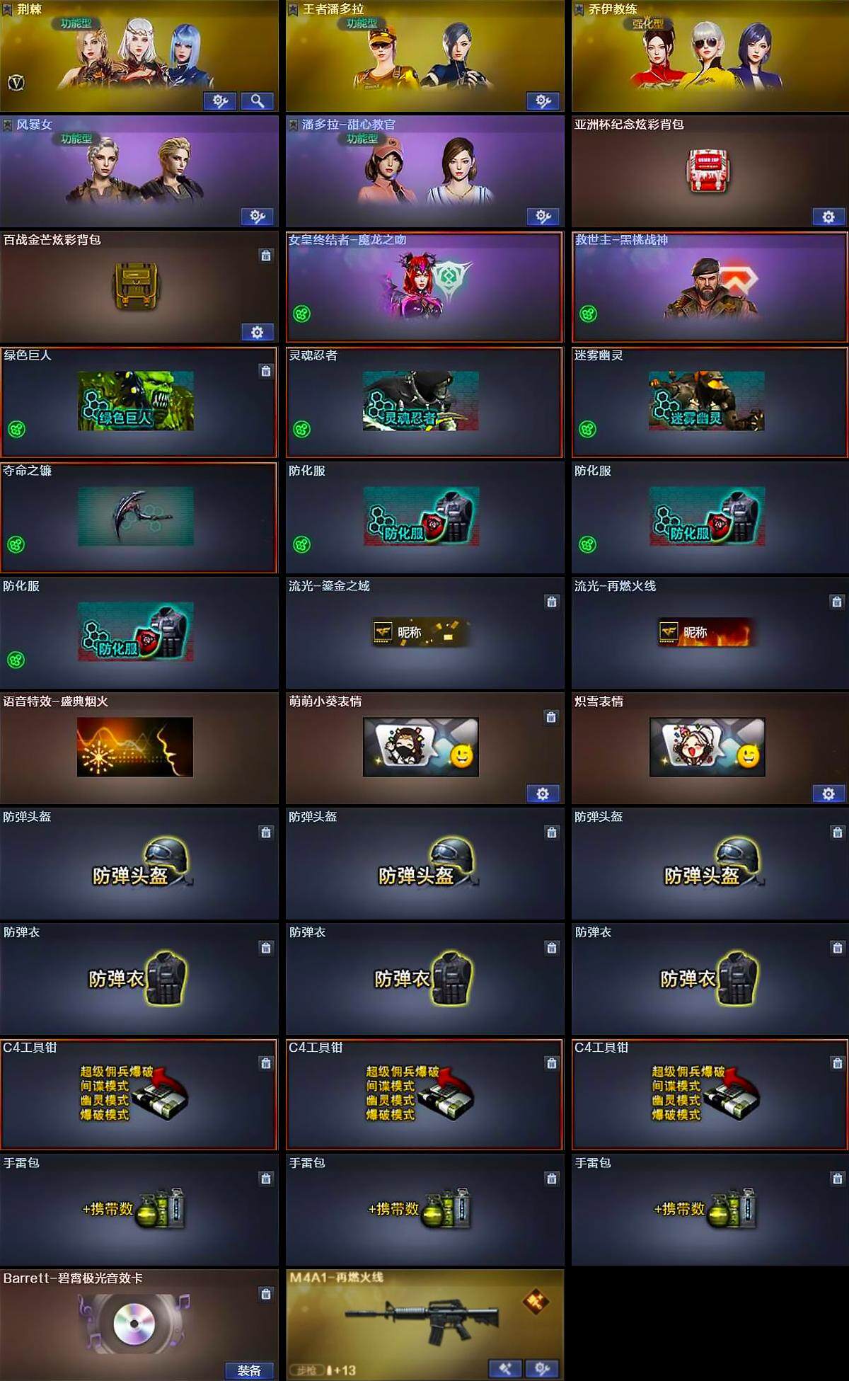 陕西一区-23v-1王者-0炫金 【热门武器】:m4a1-黑骑士,羊驼玩偶2,沙鹰-修罗3 【王者炫金武器】:王者雷影 【音效卡】:barrett-碧霄极光音效卡 【皮肤】:m4a1-再燃火线,天启-紫霄 皮肤,轻型军用手斧-再燃火线 【角色】:荆棘,王者潘多拉,乔伊教练,风暴女,潘多拉-甜心教官 【人偶武器】:迷你深渊冰龙 【英雄级武器】:ak47-火麒麟,m4a1-黑骑士,ak12-天启,awm-天龙,barrett-极光,沙鹰-修罗3,麒麟刺,麒麟刺-百战金芒,高爆手蕾-玄豹2,闪光丹-玄豹2,盐雾蛋-玄豹3 【道具】:亚洲杯纪念炫彩背包,百战金芒炫彩背包,女皇终结者-魔龙之吻,救世主-黑桃战神,绿色巨人,灵魂忍者,迷雾幽灵,夺命之镰,防化服3,流光-鎏金之域,流光-再燃火线,语音特效-盛典烟火,萌萌小葵表情,炽雪表情,防弹头盔3,防弹衣3,c4工具钳3,手蕾包3 【特殊呛械】:1黑骑士