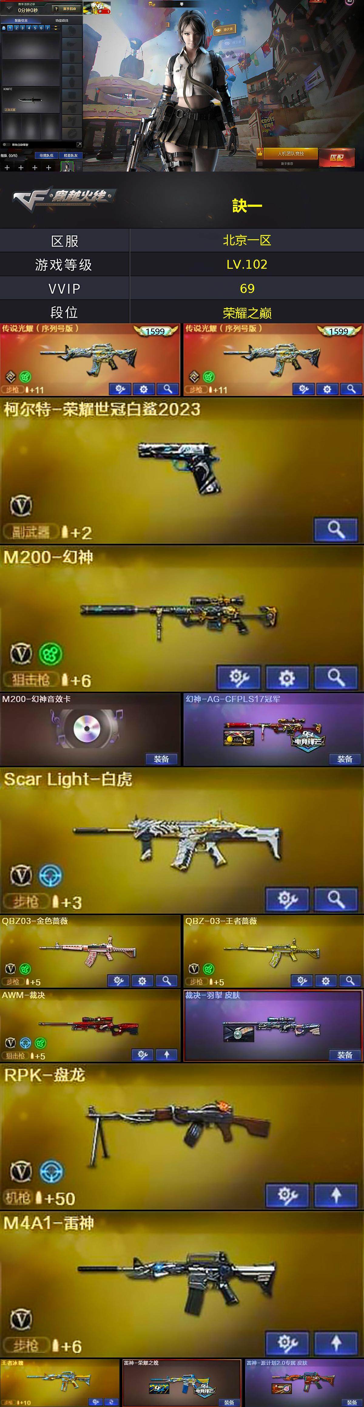 [15248390]北京一区-68v-8王者-1炫金 【传说武器】:传说光耀(序列号版) 【热门武器】:传说光耀,q03-金色蔷薇,scar light-白虎,hk417-朱雀,m200-幻神,柯尔特-荣耀世冠白鲨2023,王者炎心,m4a1-黑骑士,rpk-盘龙,加特林-炼狱2,cop-白鲨,沙鹰-修罗4 【王者炫金武器】:王者炎心,王者之魄,王者之灵,炫金毁灭 【音效卡】:m200-幻神音效卡,ak47-火麒麟音效卡,m4a1-黑骑士音效卡,barrett-毁灭音效卡 【皮肤】:幻神-ag-cfpls17冠军,裁决-羽掣 皮肤,雷神-荣耀之魄,雷神-源计划2.0专属 皮肤,火麒麟-轻羽皮肤,毁灭-星空,黑骑士-地狱火,战神-粉色甜心皮肤5,战神-紫绶金章皮肤2,战神-流金岁月皮肤4,ak47-b-常胜将军-刘备2,ak47-b-常胜将军-孙权,修罗-星空 【角色】:零,电竞教官-云悠悠,战地猎狐,王者-葵-貂蝉,王者-魅影,王者潘多拉,风暴女,嘉年华灵狐,娟娟,葵-赛博朋克,潘多拉-甜心教官,潜龙队-x,蛇姬,斯沃特-x,铁骑荣耀,维纳斯,新灵狐者,樱-战斗天使,智影,雅典娜 【人偶武器】:cop-白鲨,awm-灵狐-15周年嘉年华,闪光丹-小乔,闪光丹-貂蝉,高爆手蕾-大乔 【暴走生化】:超级对讲机 【英雄级武器】:ak47-火麒麟2,m4a1-雷神,m4a1-黑骑士,hk417-朱雀,scar light-白虎,m4a1-玫瑰精灵,q03-金色蔷薇,王者之心-觉醒版,ak-47-猩红传说7,ak47-b-战神,王者火魄-觉醒版,黑骑士-海王,ak47-b-常胜将军,q-03-王者蔷薇-觉醒版,barrett-毁灭3,awm-裁决,m200-幻神,王者之光-觉醒版,rpk-盘龙,加特林-炼狱2,aa-12-雷霆,沙鹰-修罗4,沙鹰-天神2,柯尔特-荣耀世冠白鲨2023,屠龙,龙啸3,麒麟刺-堕天神,擎天,幻灵之锋,王者之啸-觉醒版,高爆手蕾-堕天神,高爆手蕾-幻灵5,高爆手蕾-竞技荣光,高爆手蕾-古蛇迷踪,闪光丹-堕天神,闪光丹-幻灵3,闪光丹-竞技荣光,盐雾蛋-堕天神,盐雾蛋-幻灵3,盐雾蛋-竞技荣光,盐雾蛋-古蛇迷踪 【道具】:bs战队炫彩背包,edg炫彩背包,r.lgd炫彩背包,云山科技背包,亚洲杯纪念炫彩背包,炫彩背包,虎牙炫